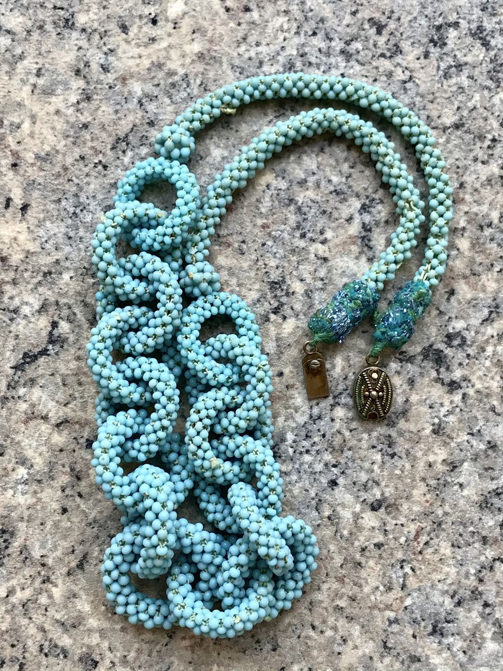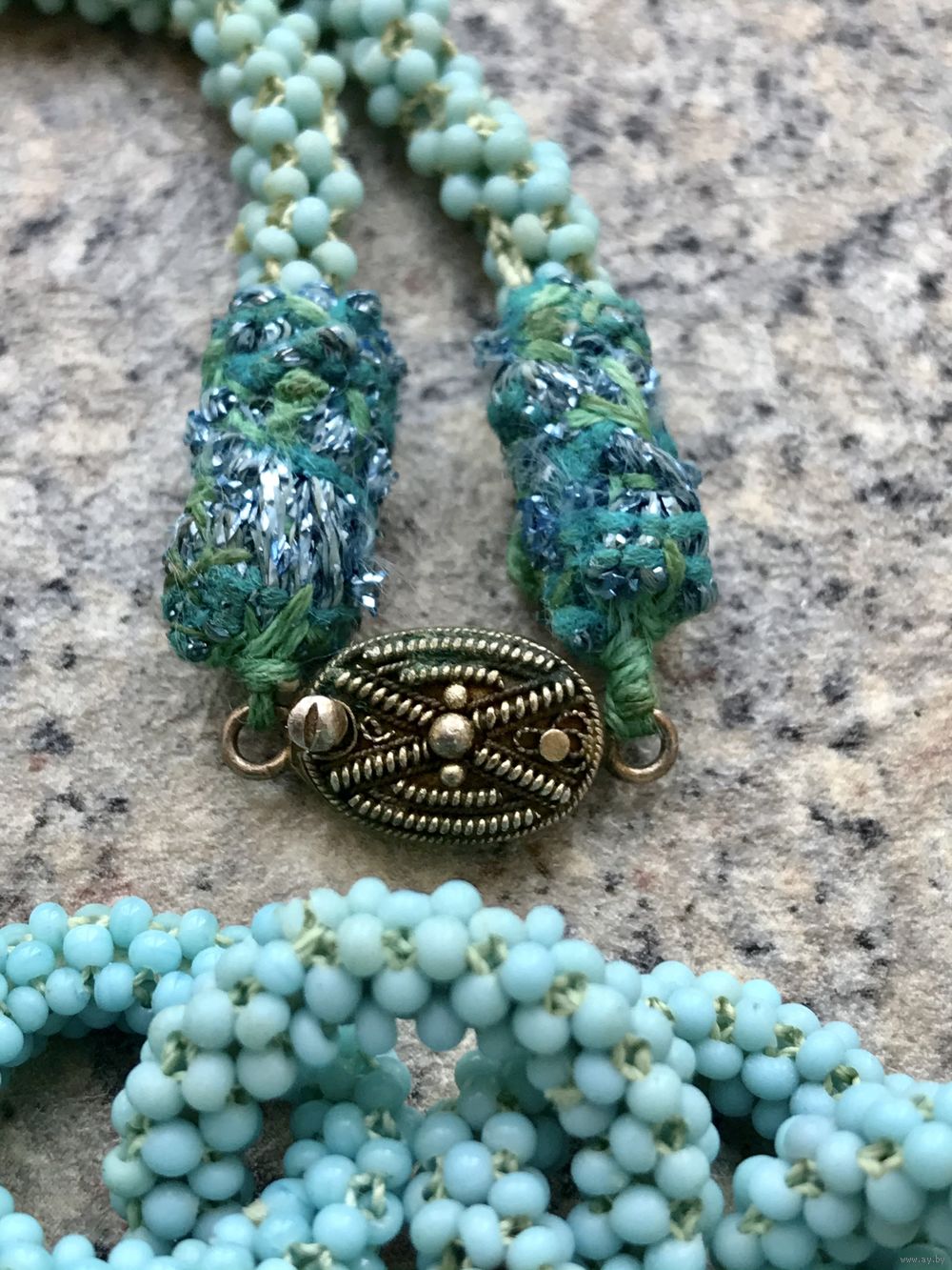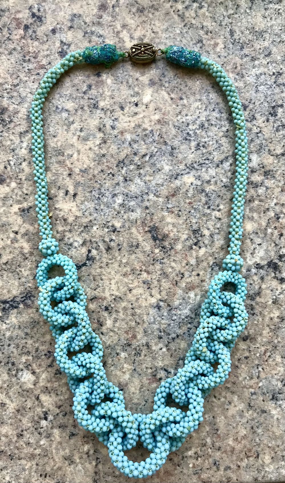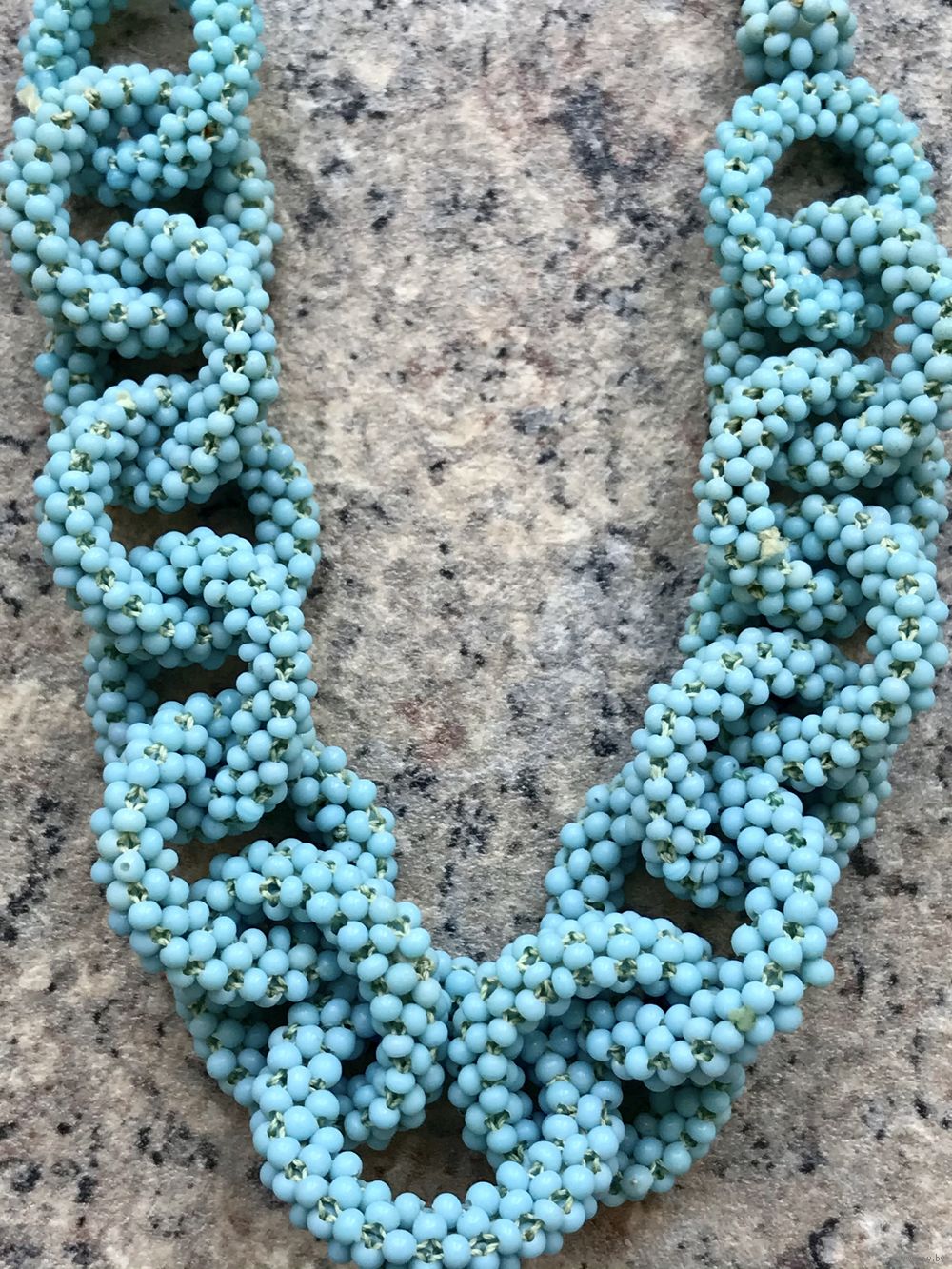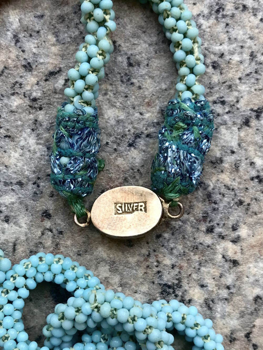 Антикварное колье, так называемый старый Китай. Выполнено из бисера в технике тессито. Длина 43см. плюс замочек 1,5см.(из серебра). Диаметр большого колечка 2,5см., маленького 2см. Есть несколько бусин со сколами.
