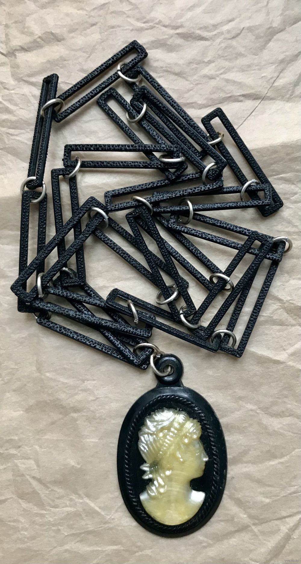 Винтажное колье из пластика темно-коричневого цвета. Длина цепочки 72см., размер кулона 4,7х2,7см. Состояние хорошее.