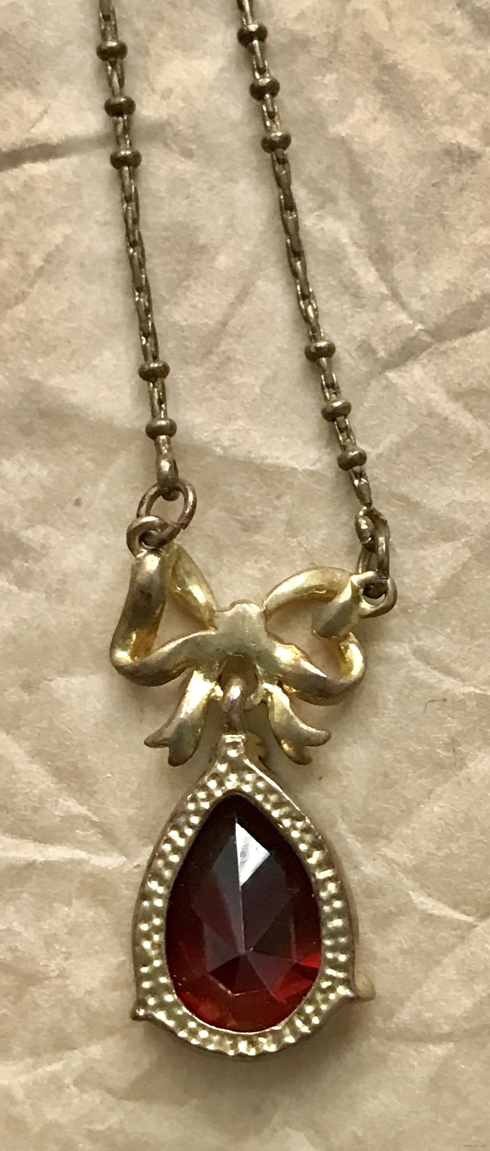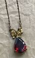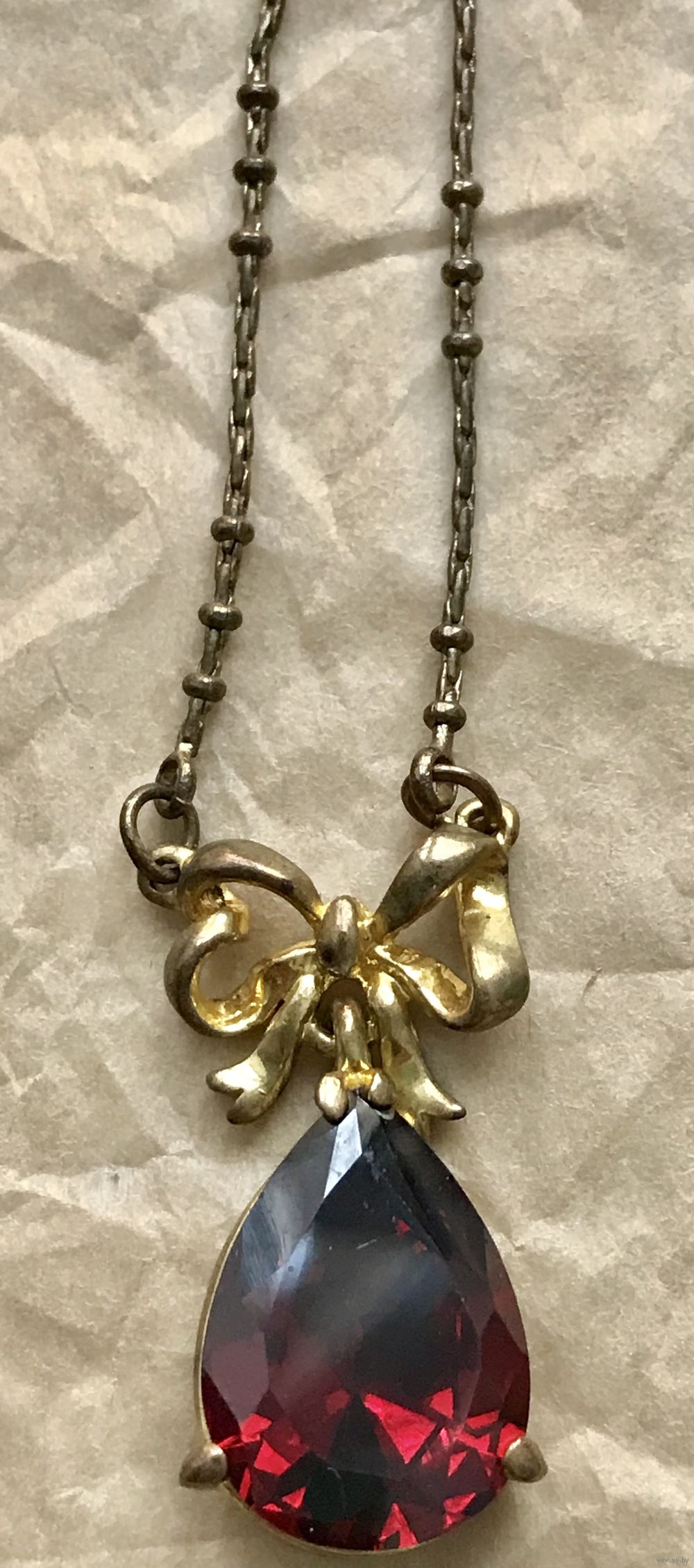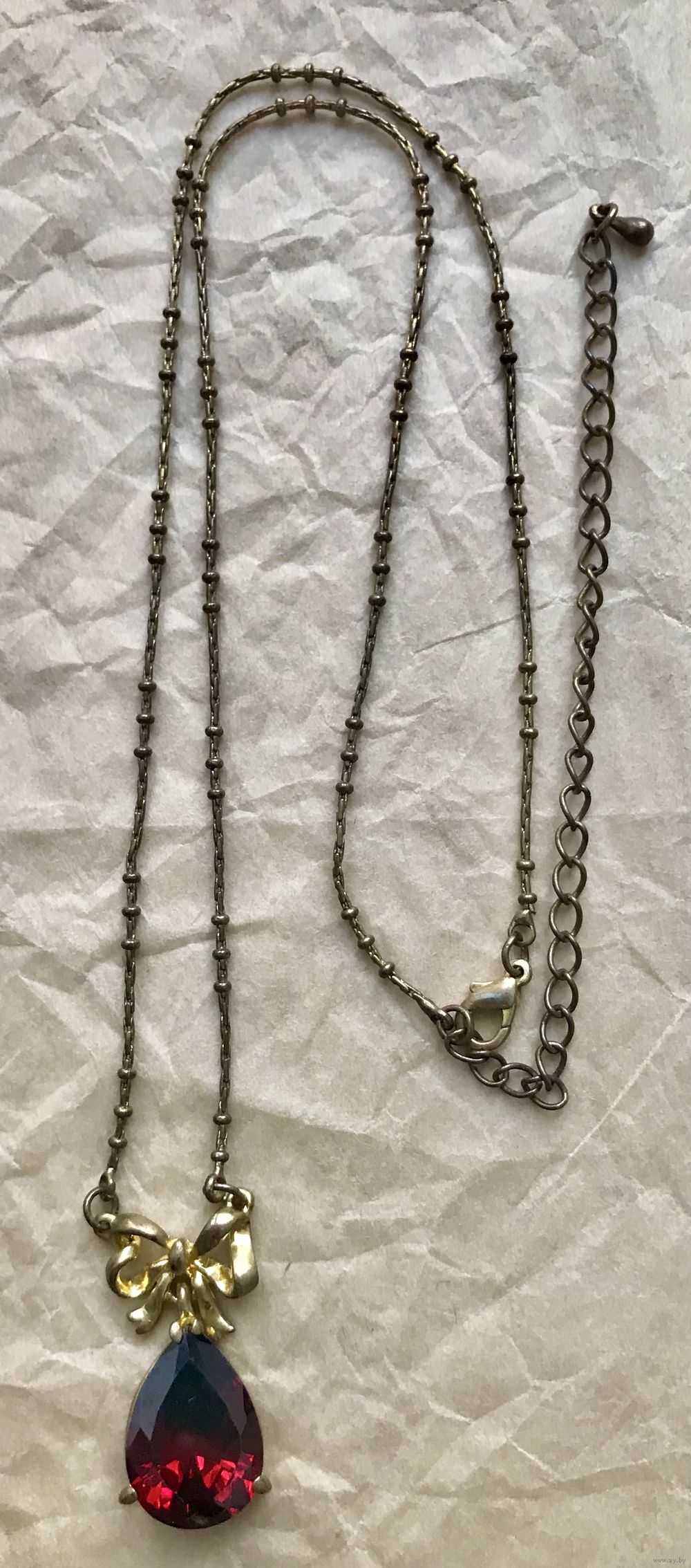 Винтажное колье из металла золотого тона, в подвеске кристалл рубинового цвета. Длина украшения 48см.+10см.доп.цепочка, высота подвески 3см., размер вставки 1,5х1,3см. На металле есть местами незначительные потемнения. Общее состояние украшения хорошее.