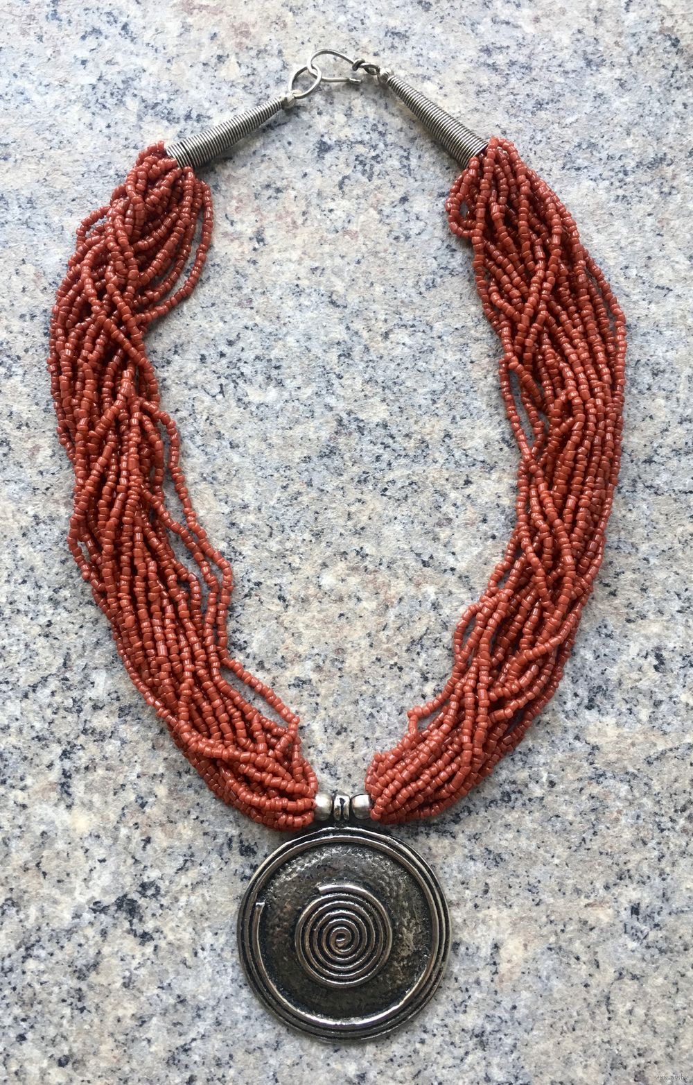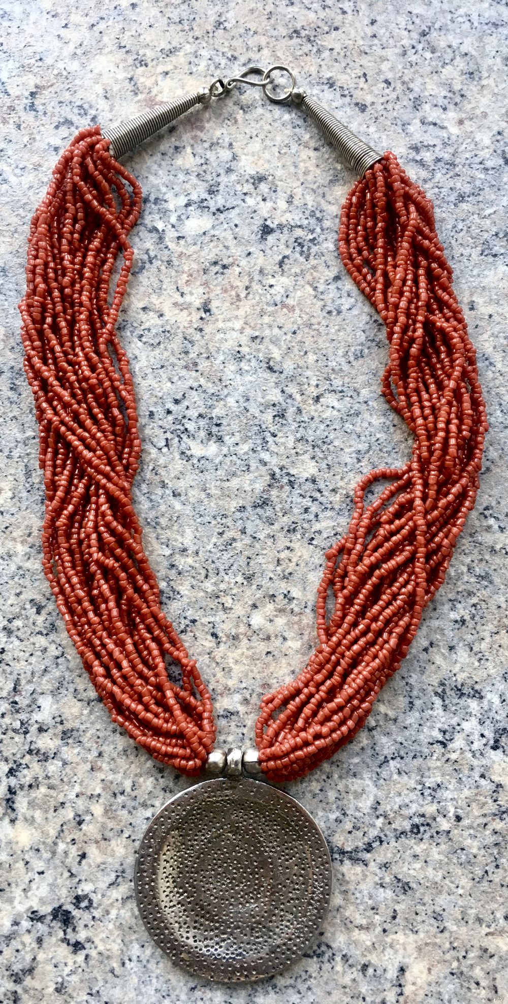 Колье винтажное из бисера кораллового цвета с кулоном. Колье состоит из 18 нитей бисера, диаметр кулона 5 см., длина бус 44 см. (без учета кулона), состояние хорошее.