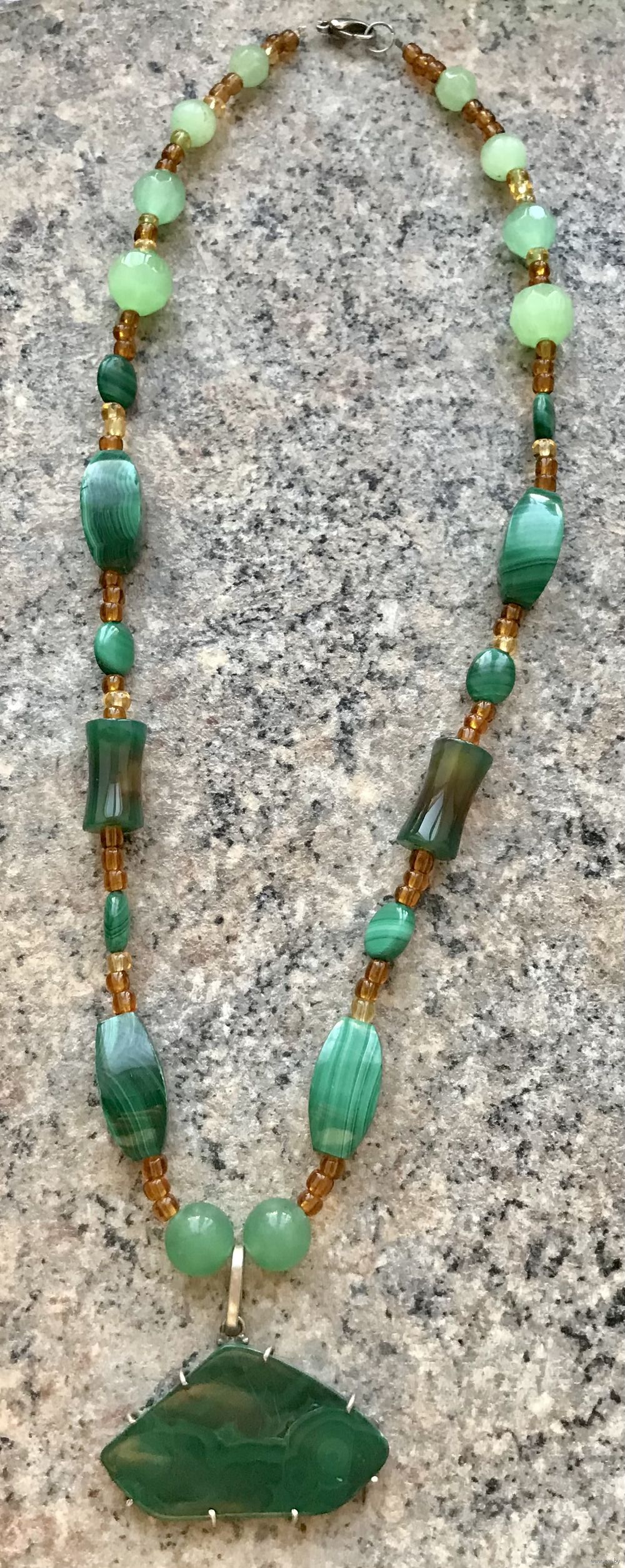 Винтажное колье из малахита, стекла и бисера. Длина 49см., размер подвески из малахита 3,5х4см.(имеются неровности естественного происхождения). На бусинах из малахита имеются потёртости и небольшие сколы.