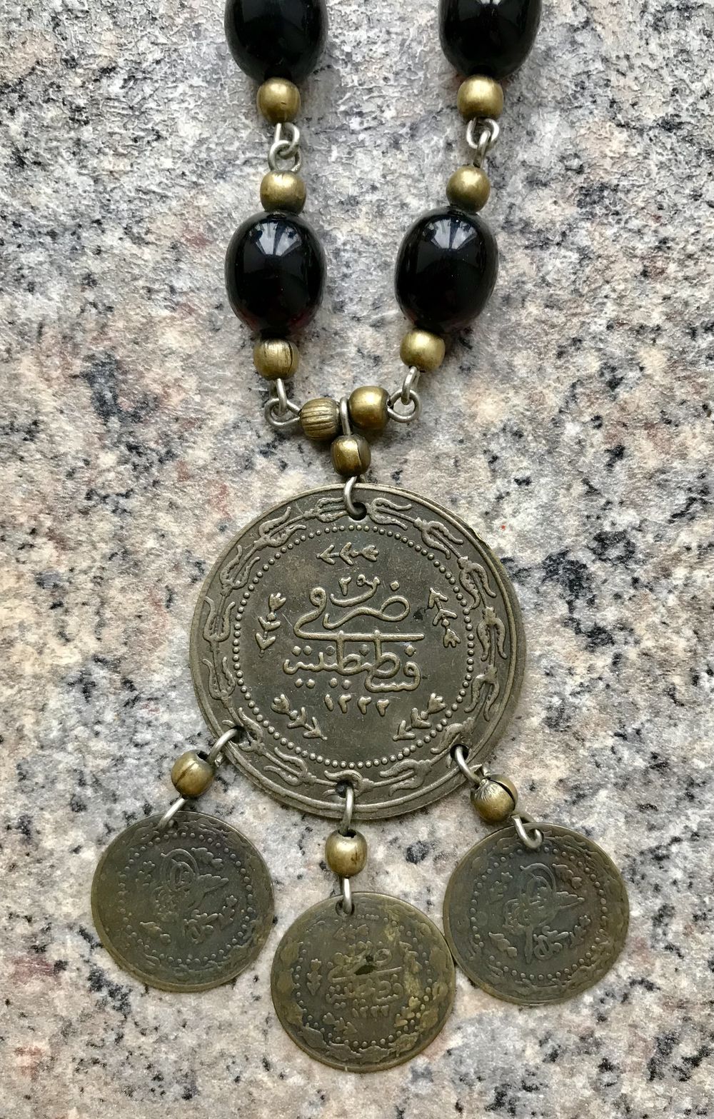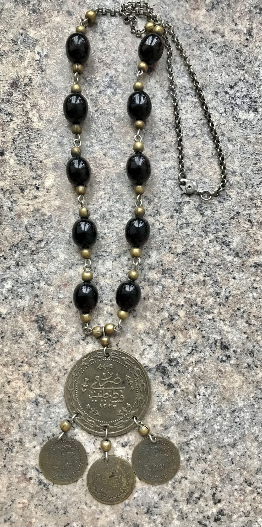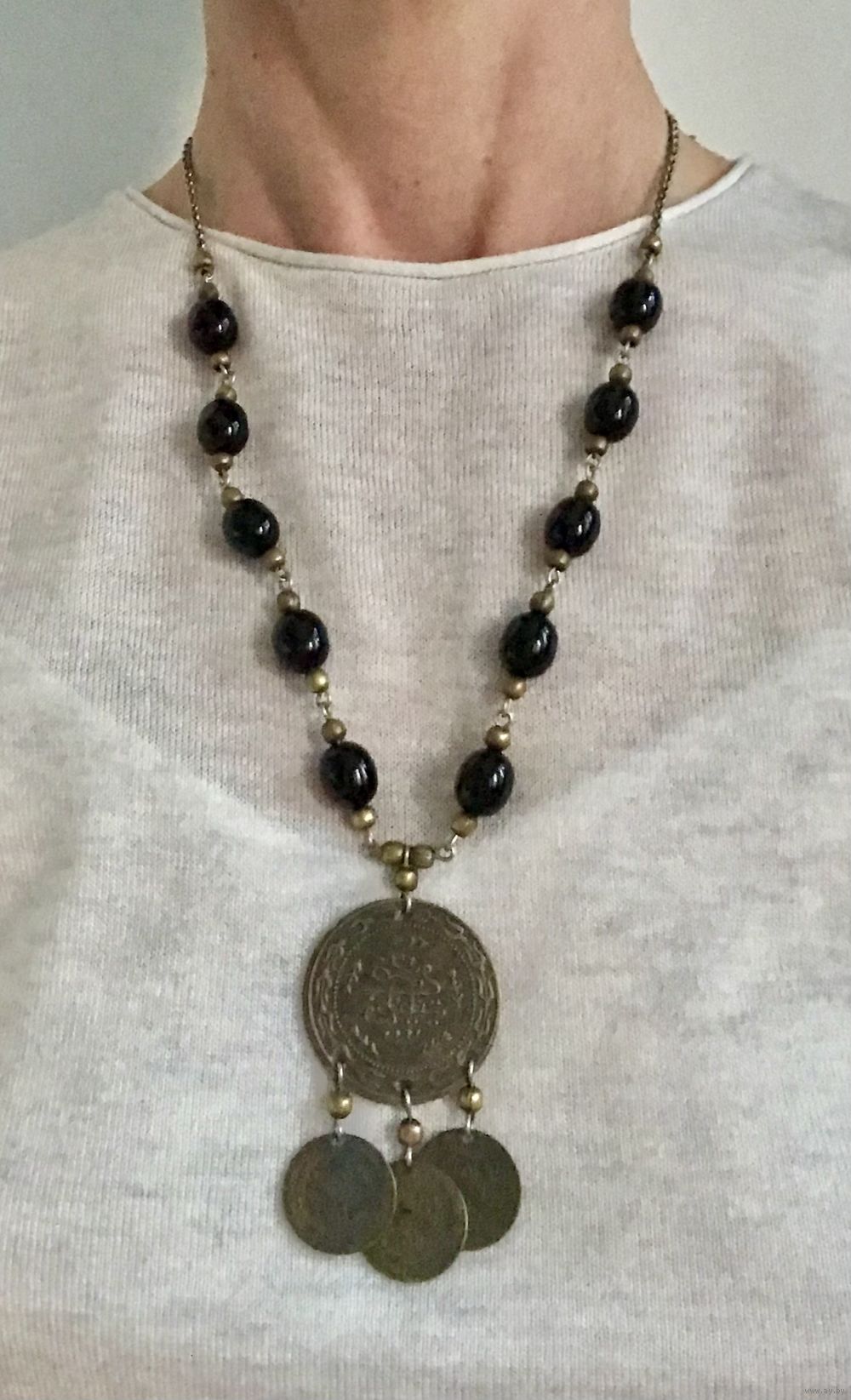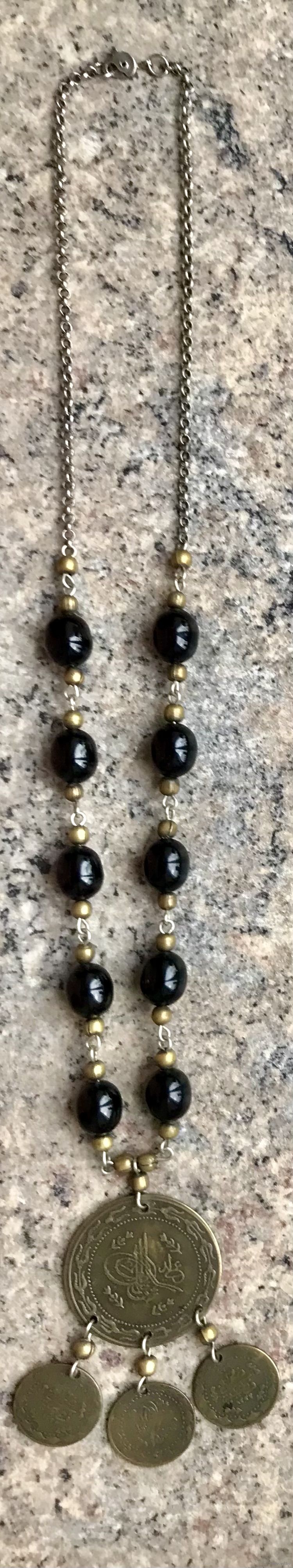 Колье с основой из металла серебристого тона, бусин из пластика и монеток. Длина украшения 58см. Состояние хорошее.