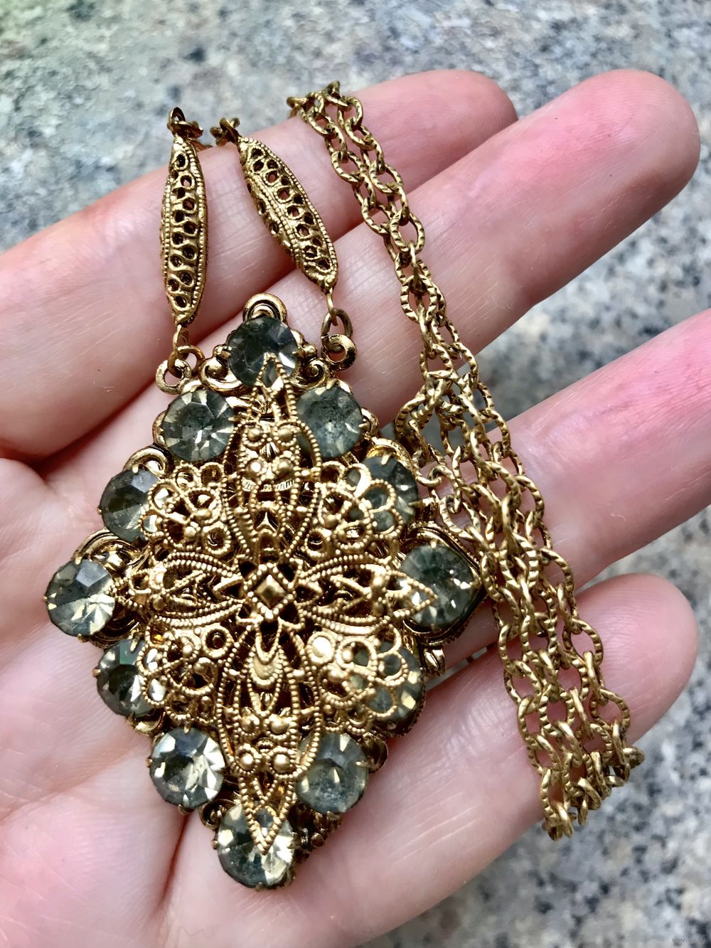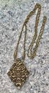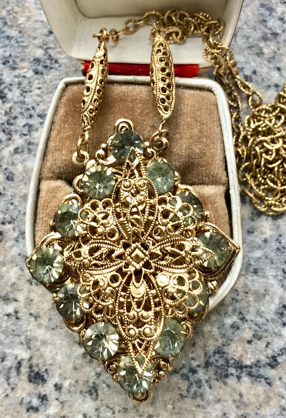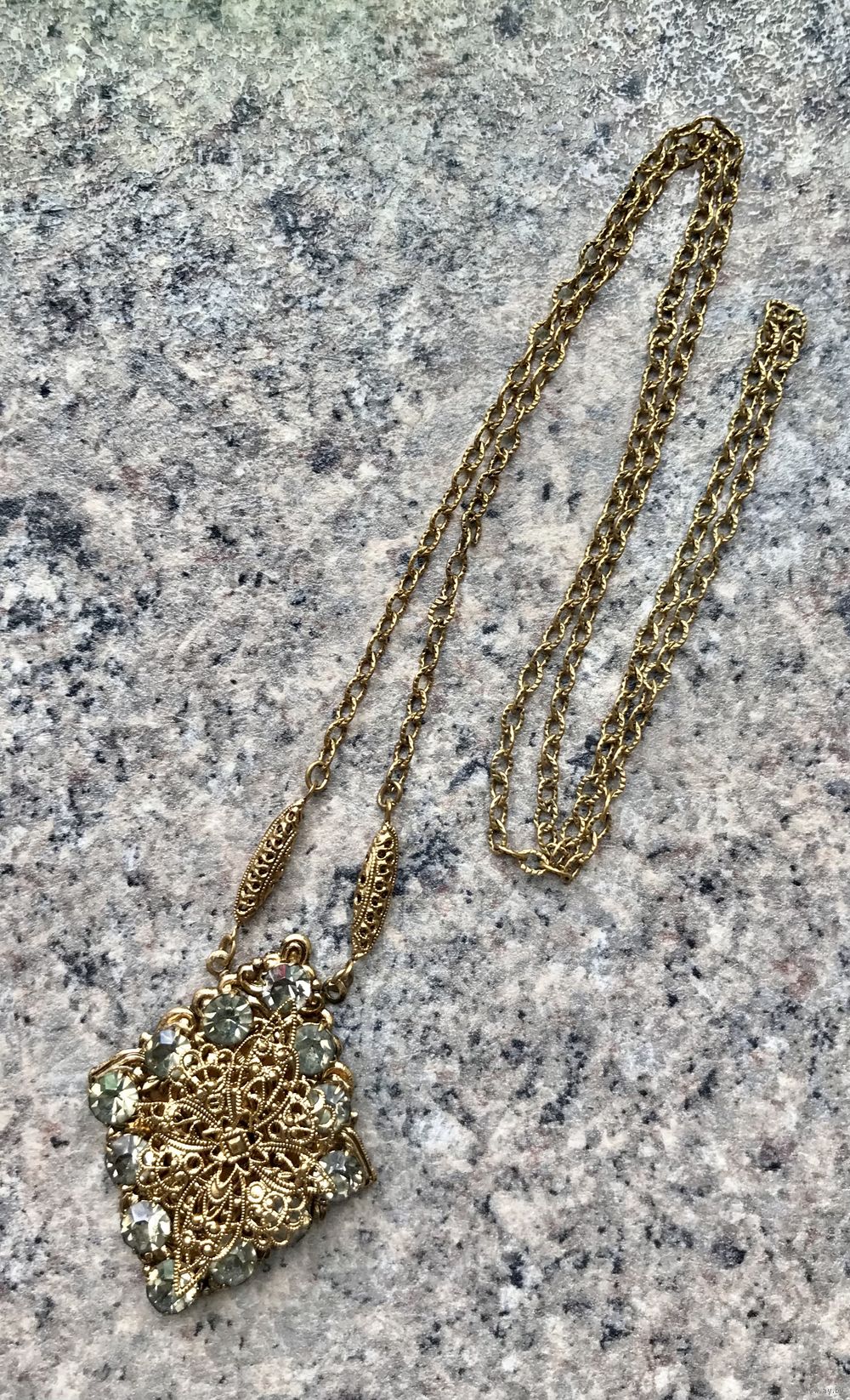 Винтажное чешское колье с основой из латуни с позолотой, вставки в кулоне из стекла. Длина цепочки 66см.(неразъемная), размер кулона 5х4см. Состояние хорошее.
