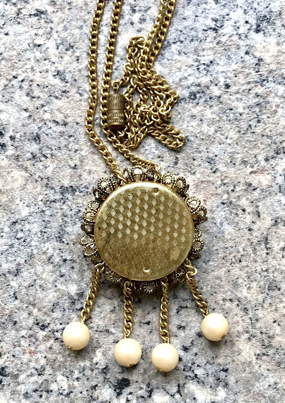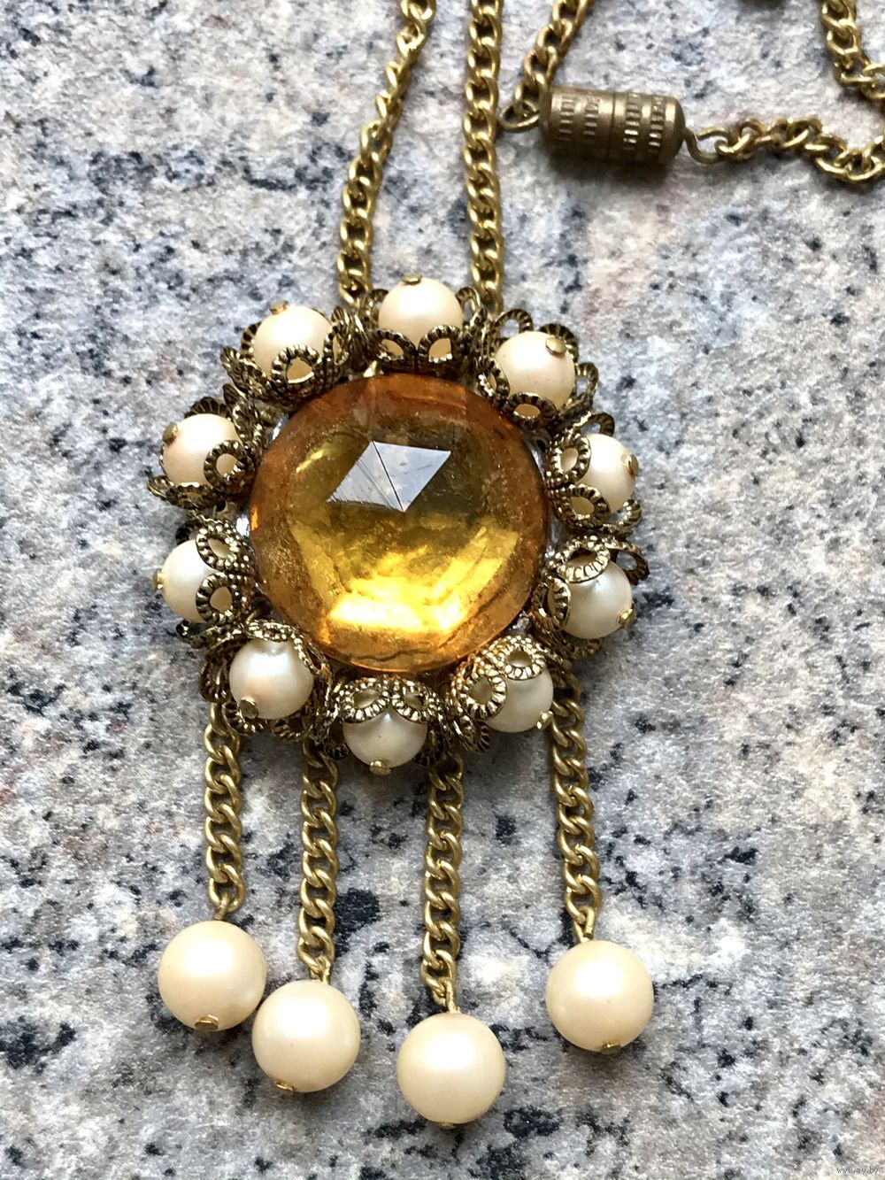 Винтажное чешское украшение, основа выполнена из латуни. Кулон наборный, центральная вставка из стекла. Длина цепочки 60см., высота кулона с висюльками 6 см.,диаметр кулона 3,5см., диаметр стеклянной вставки 2см. Состояние хорошее.