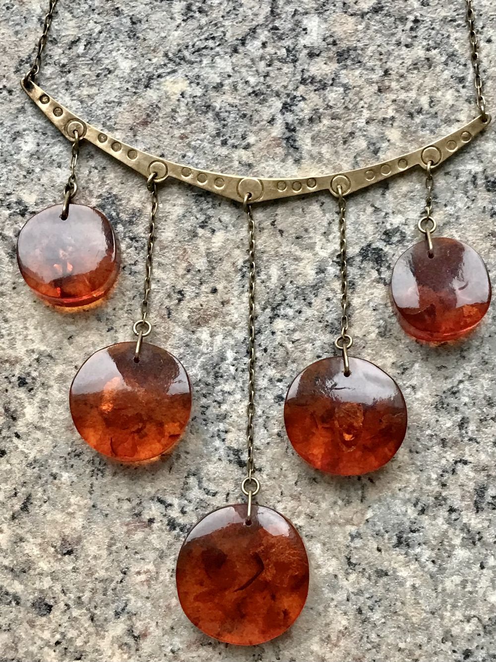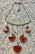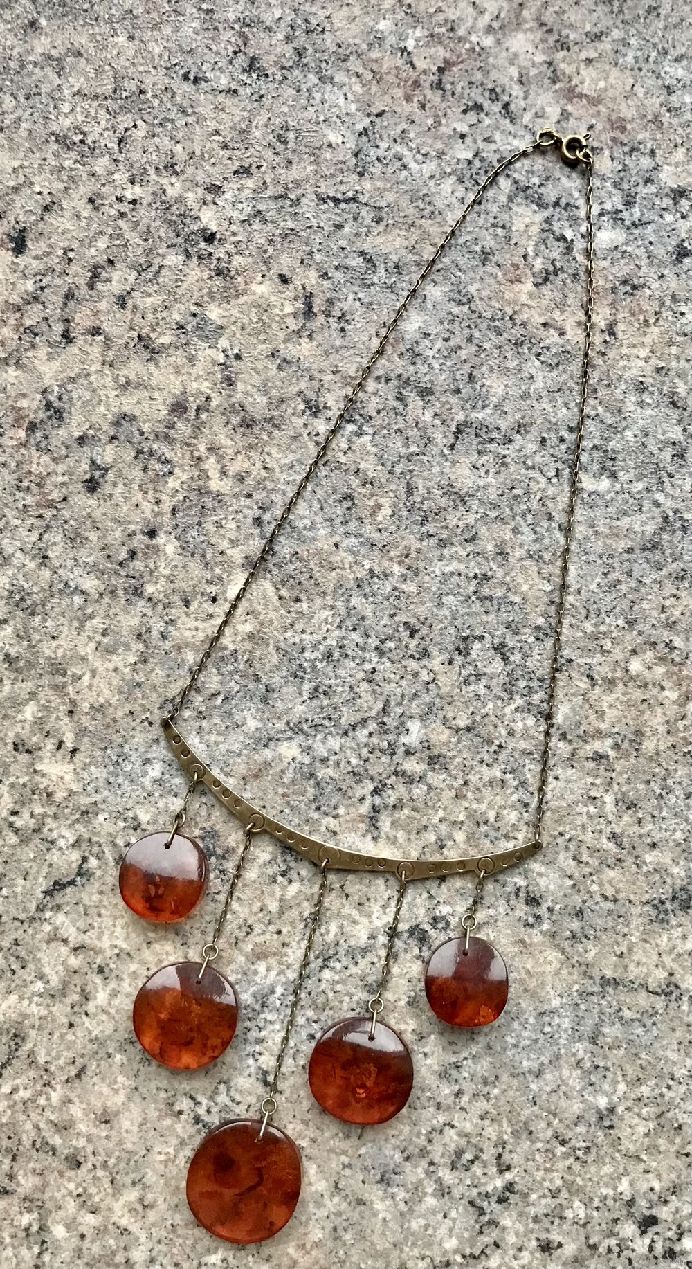 Колье с основой из серебра 875пр. с позолотой и подвесок из янтаря. Изготовлено в 1971г. в Калининграде (именник 1ЯК). Длина цепочки 34см., высота висюлек от 3,5см. до 9см., диаметр янтарных шайбочек от 2,2см. до 2,8см., толщина 0,8см. Редко встречающаяся модель. Состояние хорошее.