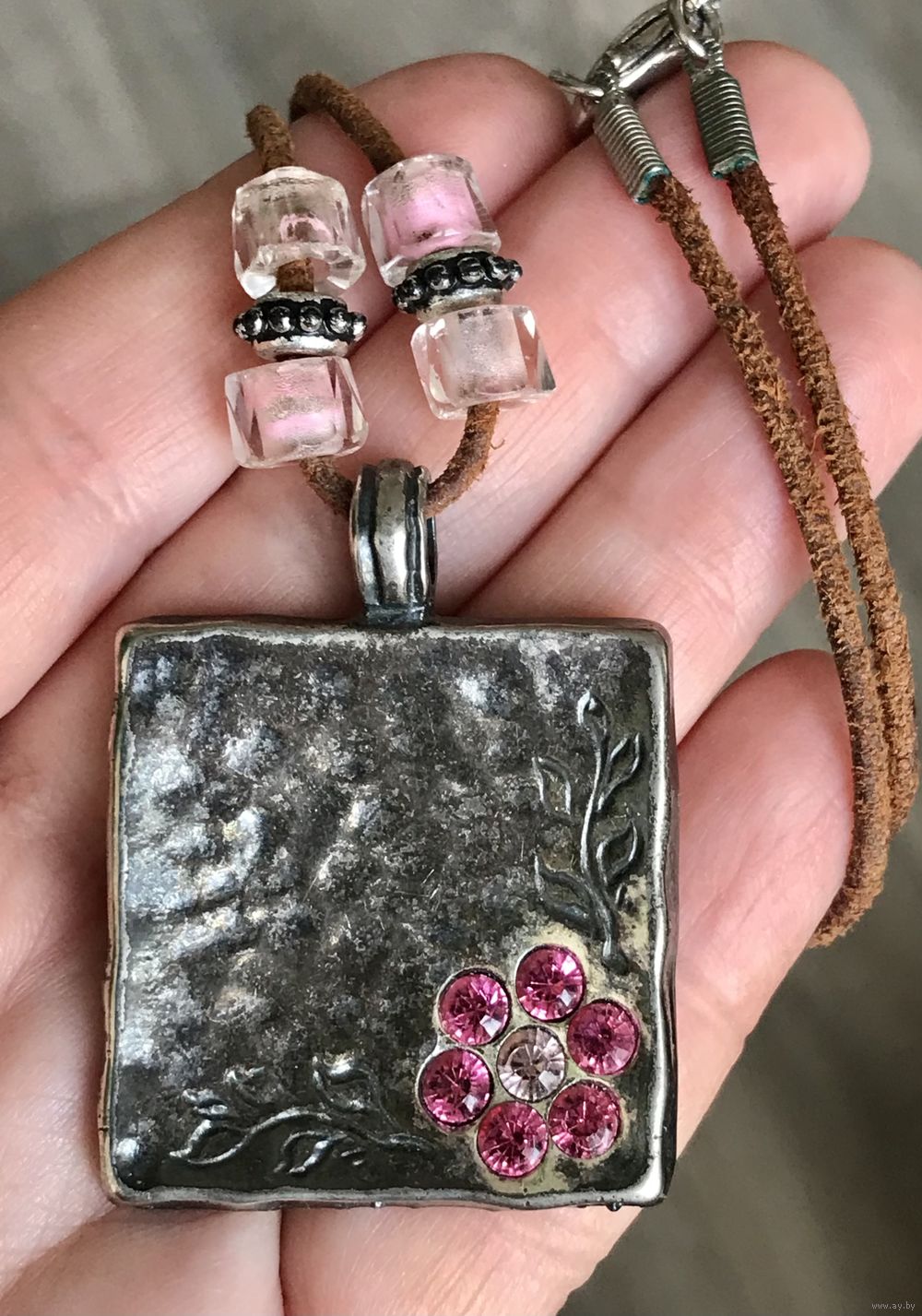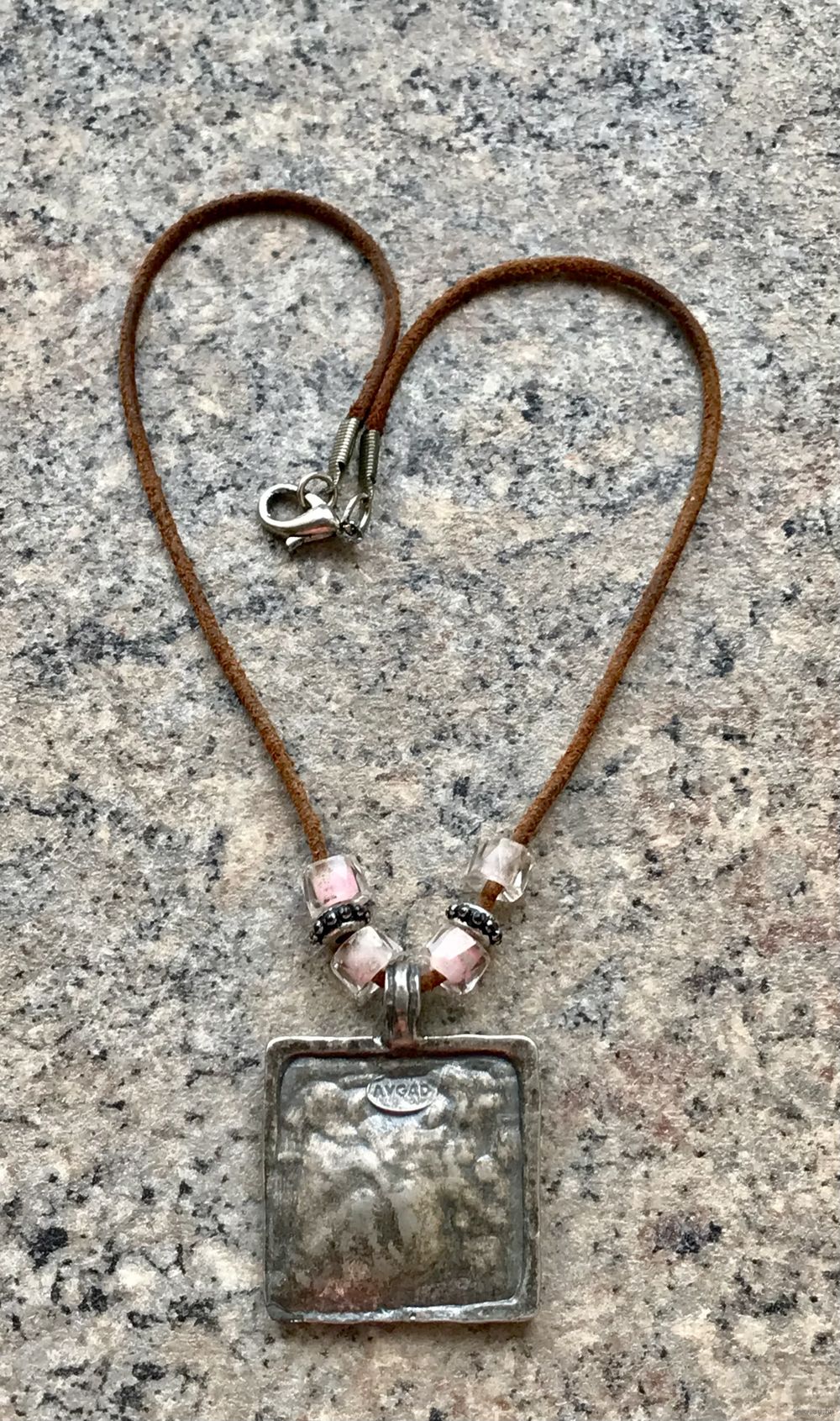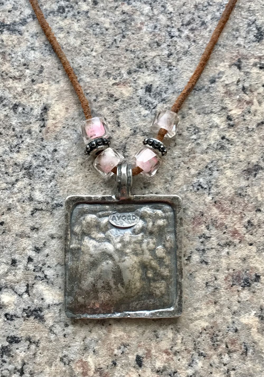 Кулон из металла серебристого тона с гипоаллергенным покрытием на замшевом шнурке израильского бренда бижутерии AVGAD. Высота кулона с петлей 4,4см., размер подвески 3,4х3,4см. Длина шнура 38см. Маркировано. Состояние хорошее.
