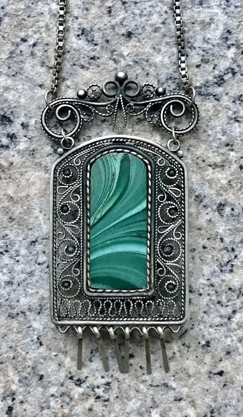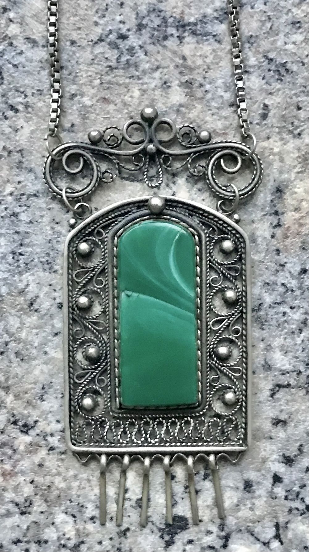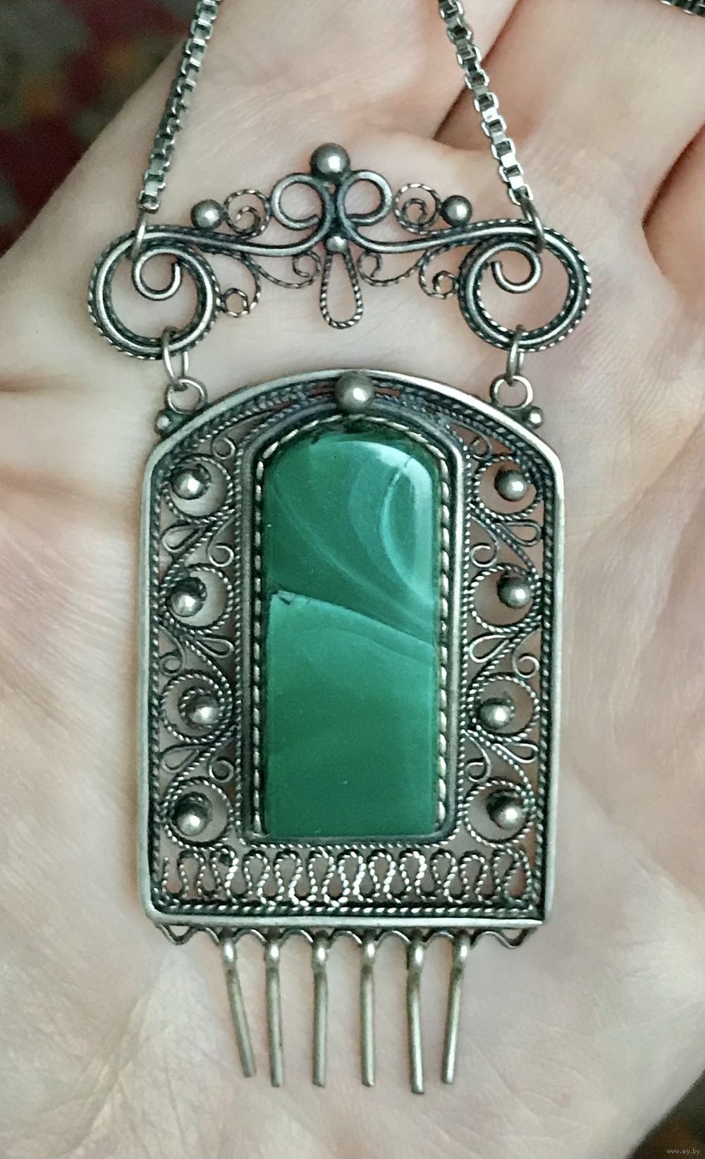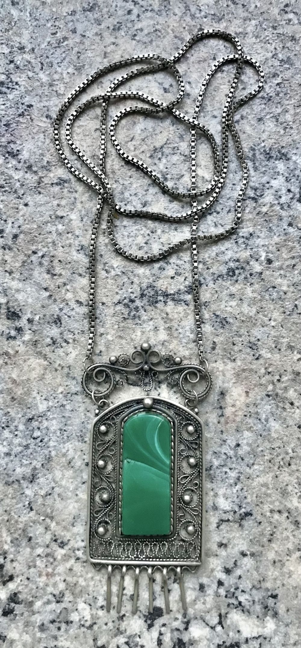Винтажное колье из мельхиора, вставка на подвеске из пластика под малахит. Скань, зернь. Длина цепочки 66см., размер подвески 7х3,5см. Возможно не хватает двух висюлек. Очень деликатная цепочка, носить надо аккуратно.