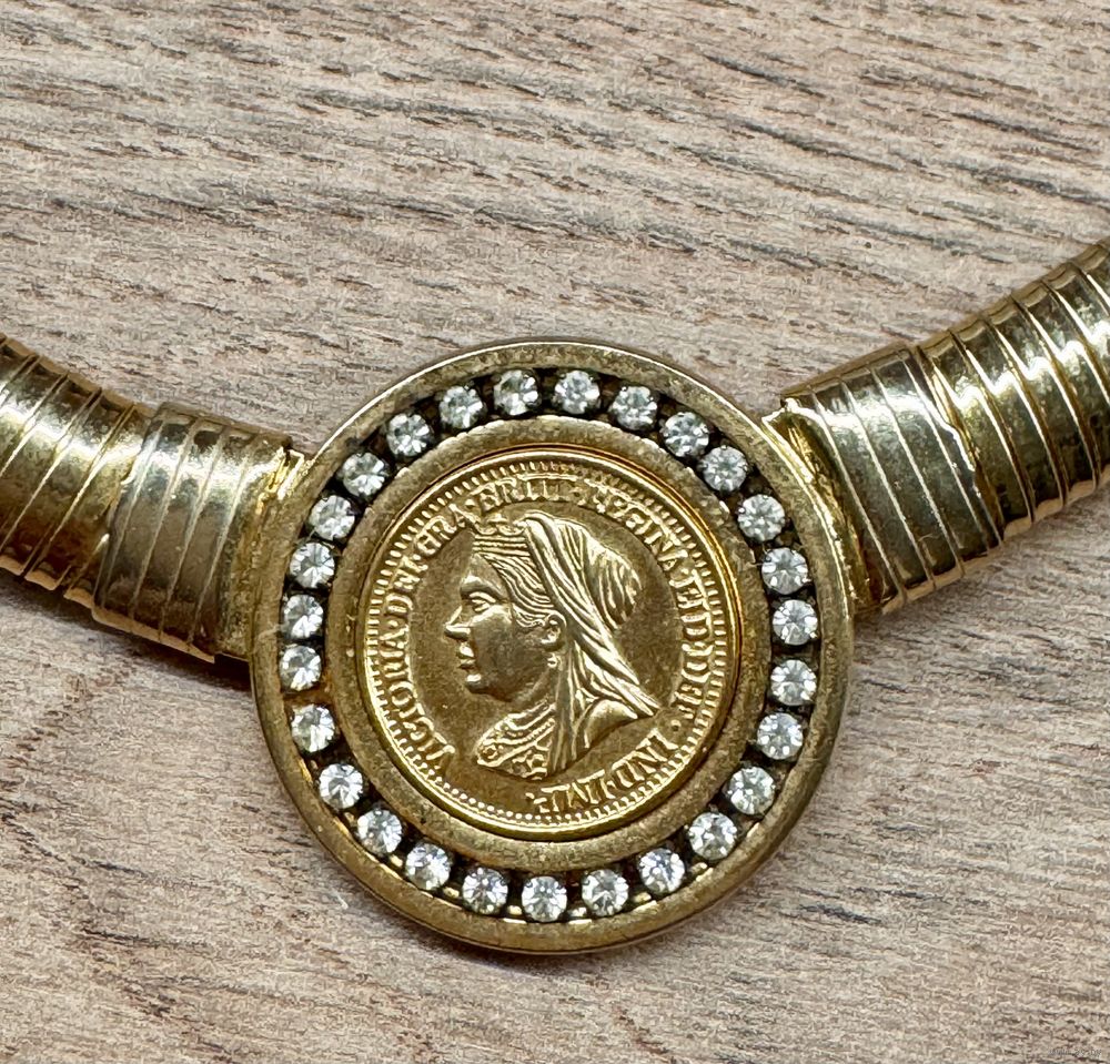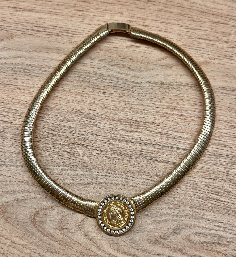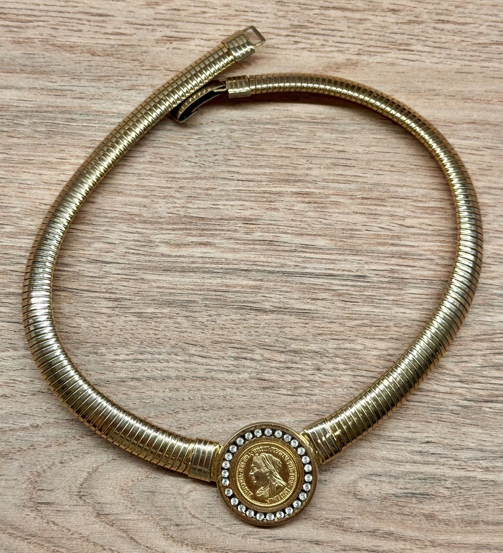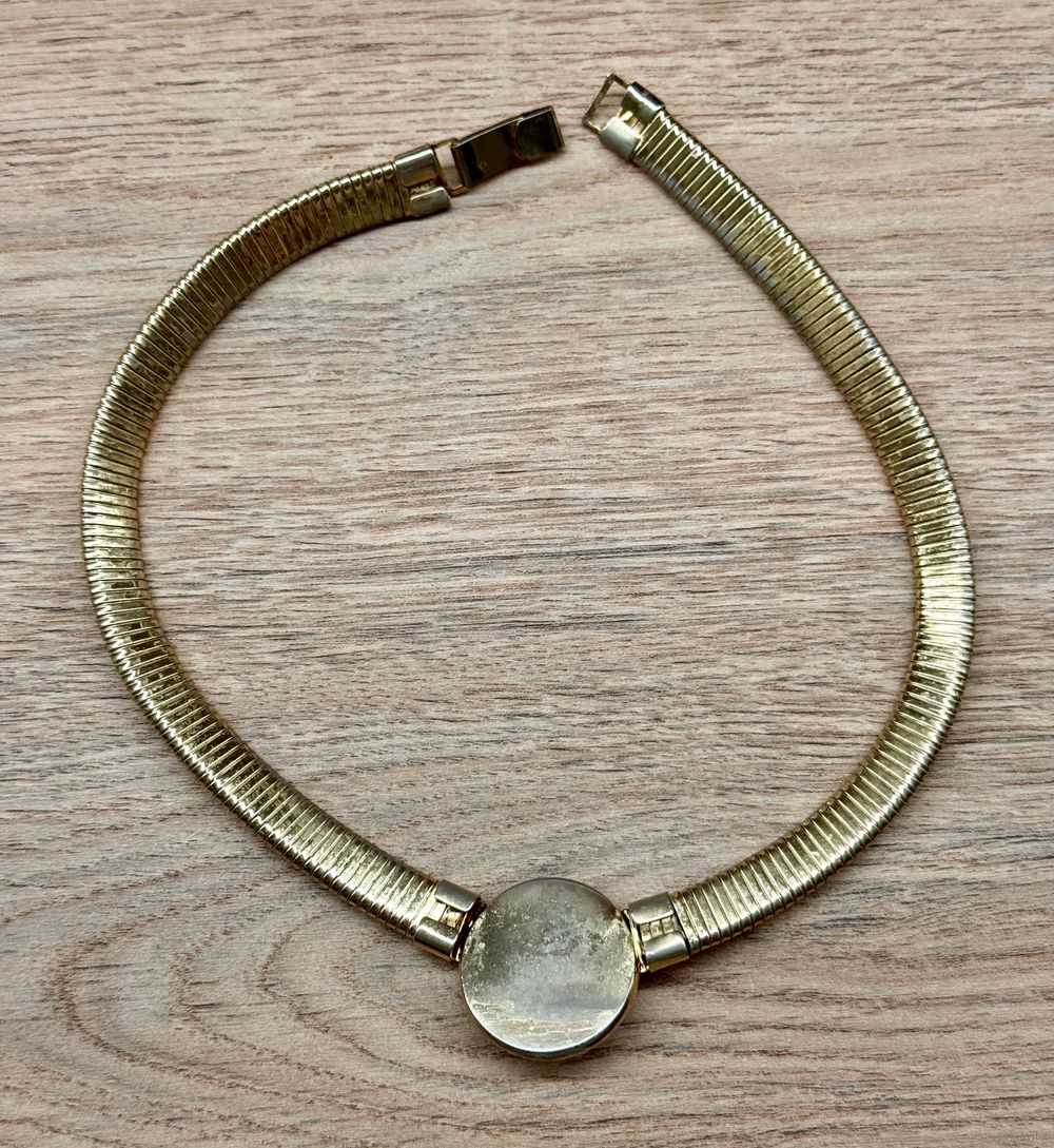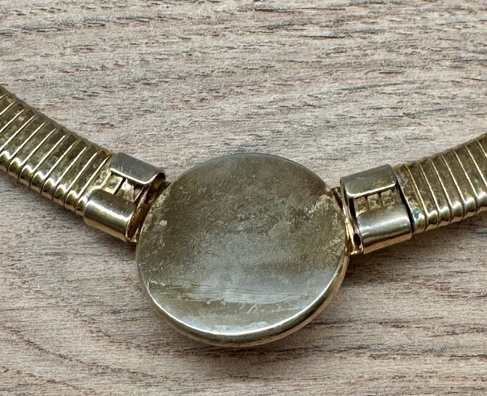 Винтажное колье-чокер с основой из металла золотого тона. Длина 40см., диаметр центральной части 2,8см. С обратной стороны на металле местами имеются потертости.