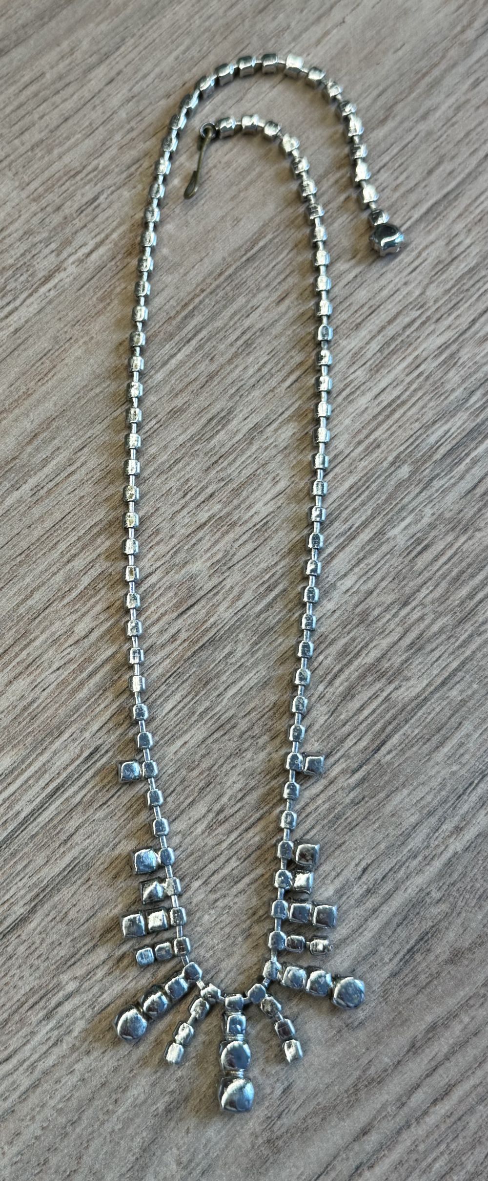 Винтажное колье с основой из латуни с серебрением, лицевая сторона украшена кристаллами с покрытием AB. Максимальная длина украшения 44см. Состояние хорошее.