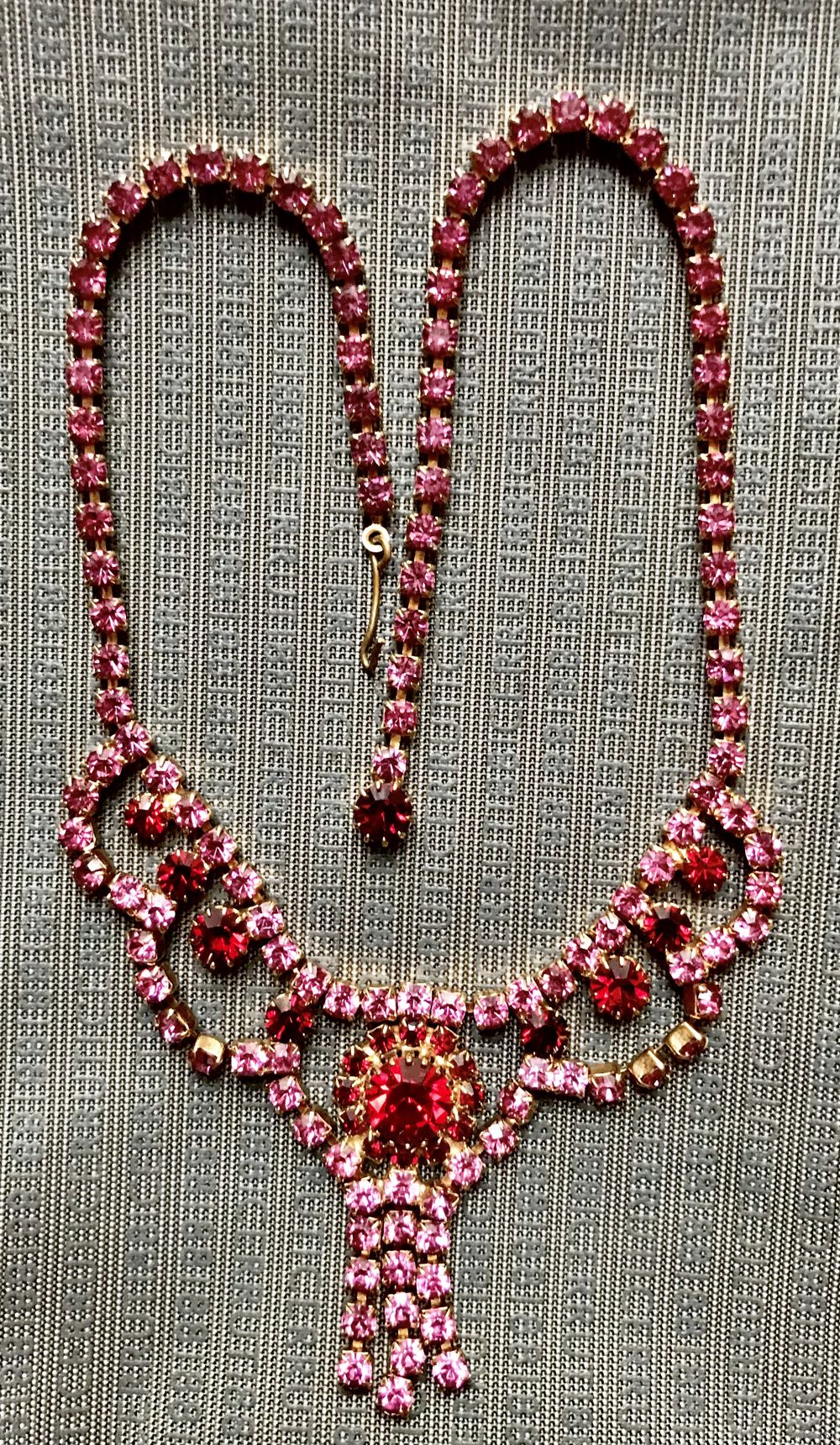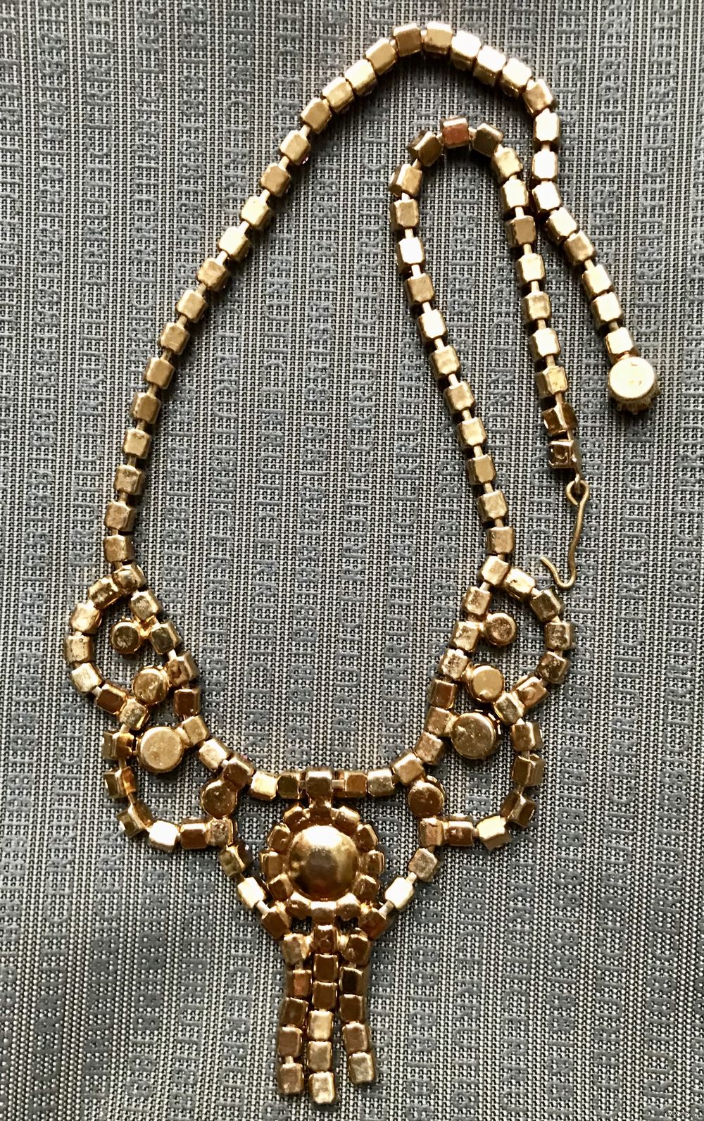 Винтажное чешское колье с основой из латуни с позолотой, лицевая сторона украшена кристаллами из цветного стекла. Максимальная длина колье 47см., но из-за дизайна застёжки можно сделать короче. Состояние хорошее.