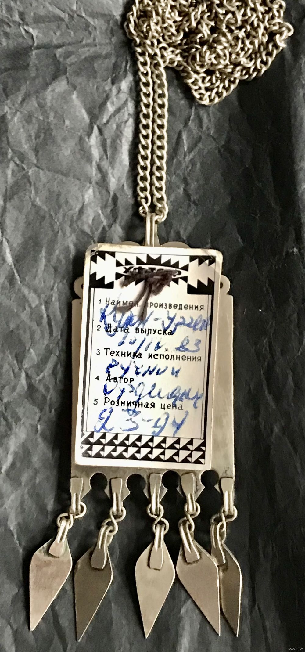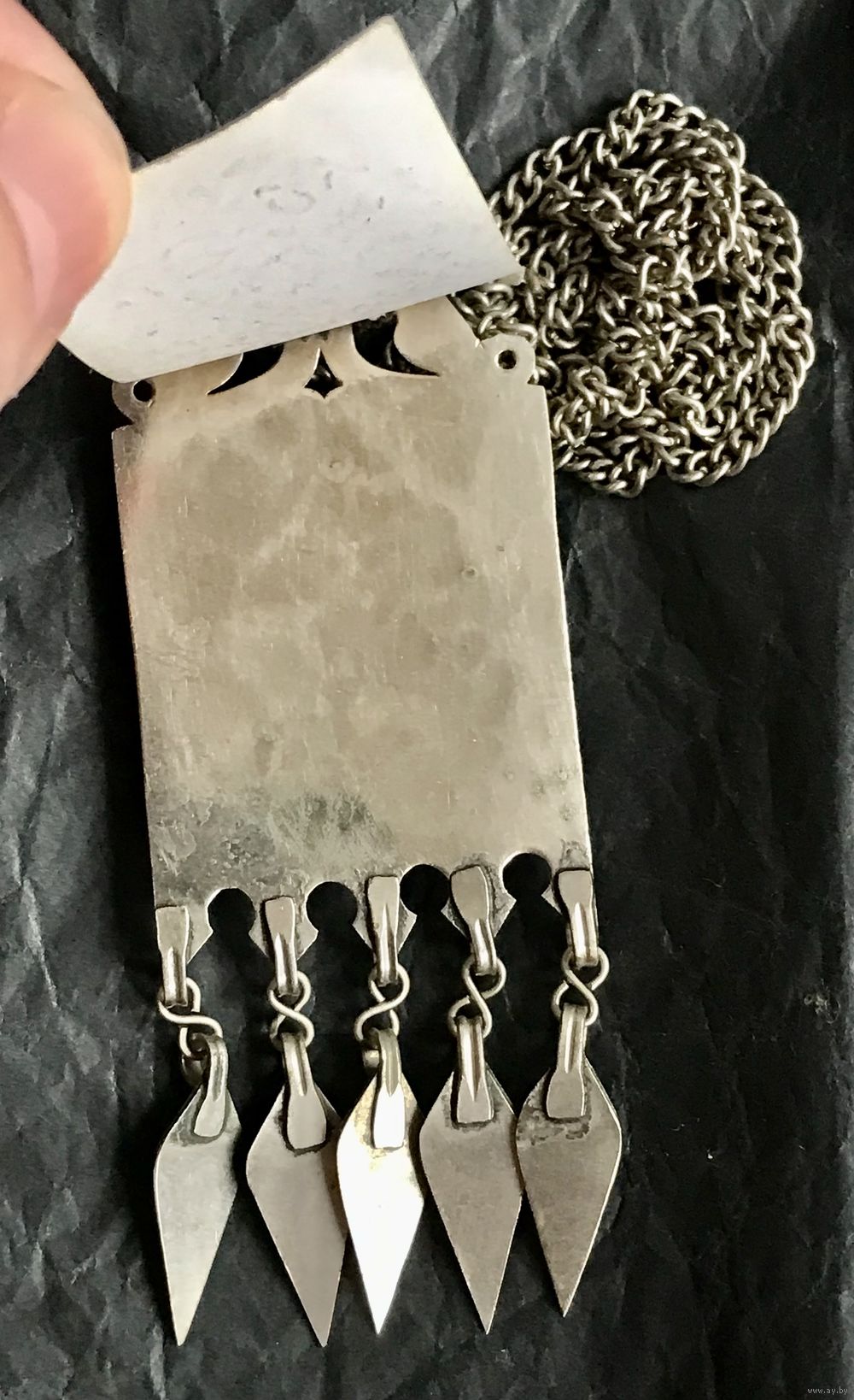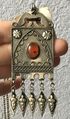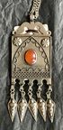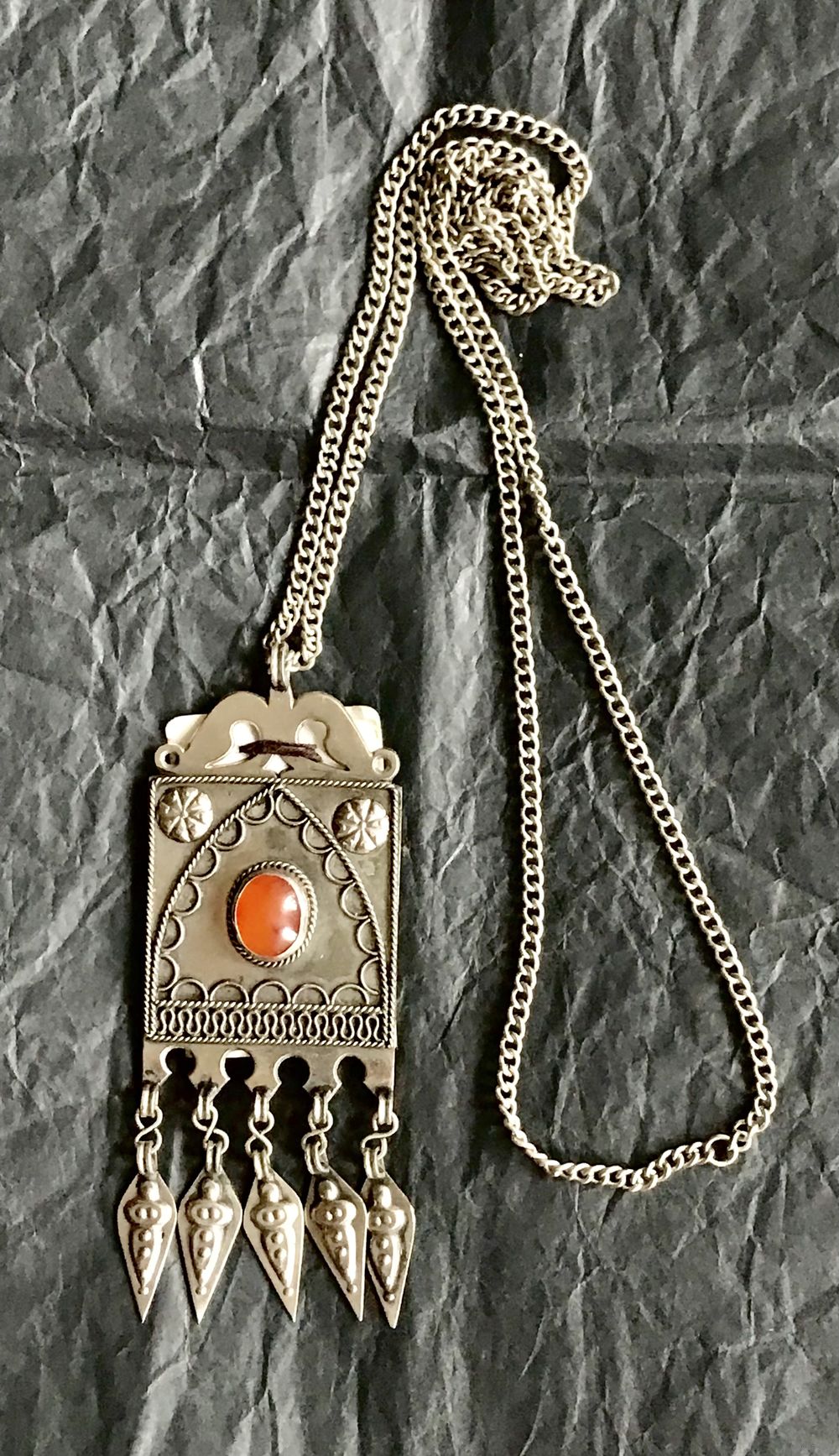 Винтажное туркменские авторское украшение из мельхиора, вставка из сердолика. Длина цепочки 76см., неразъемная. Высота подвески с висюльками 9,5см., ширина 3,5см. Новое.