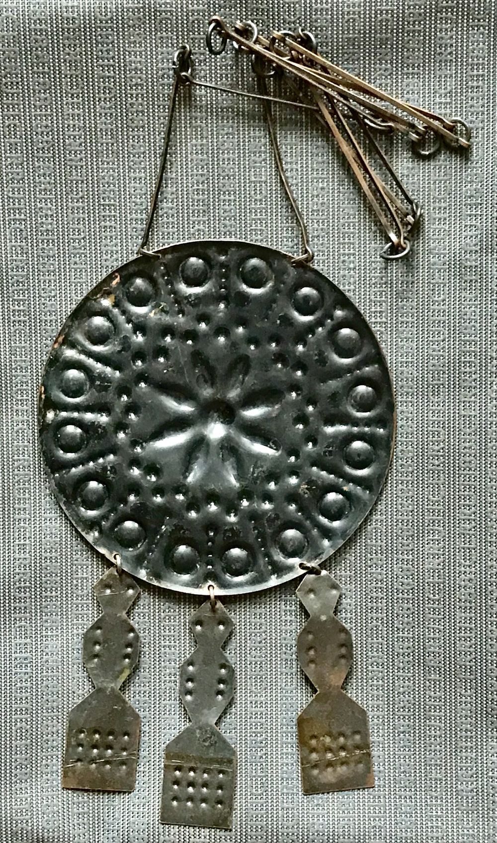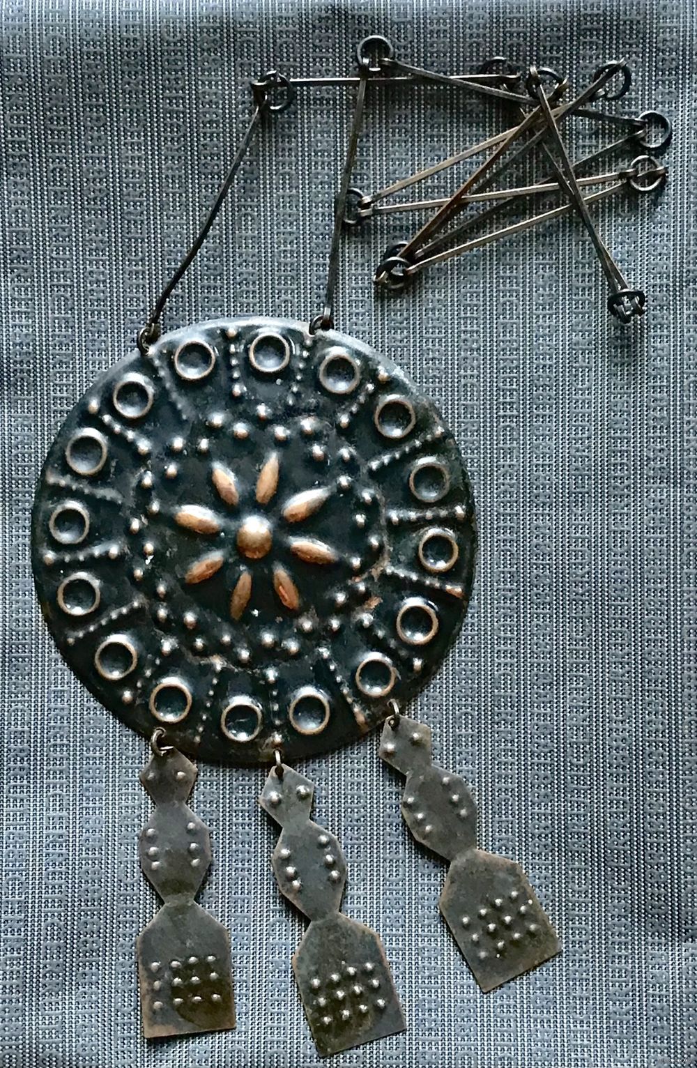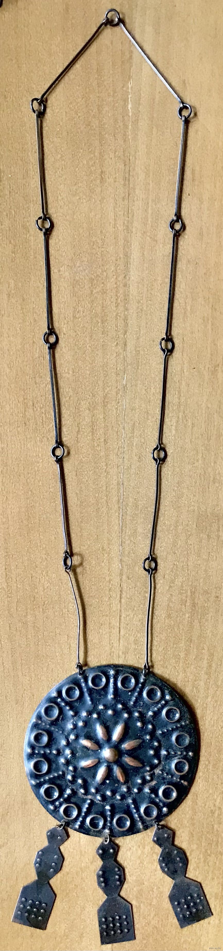 Винтажное очень крупное украшение из Прибалтики. Сделано из меди, длина цепочки 68см., диаметр подвески 9см., высота подвески с висюльками 14,5см. Состояние хорошее.