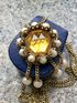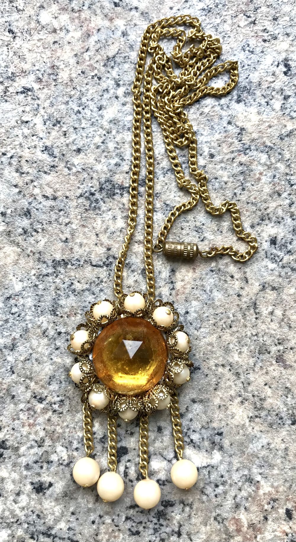 Винтажное чешское украшение, основа выполнена из латуни. Кулон наборный, центральная вставка из стекла. Длина цепочки 60см., высота кулона с висюльками 6 см.,диаметр кулона 3,5см., диаметр стеклянной вставки 2см. Состояние хорошее.
