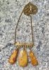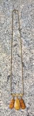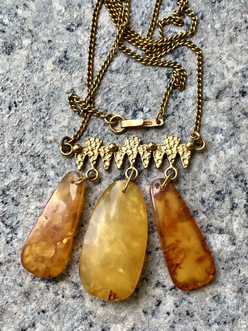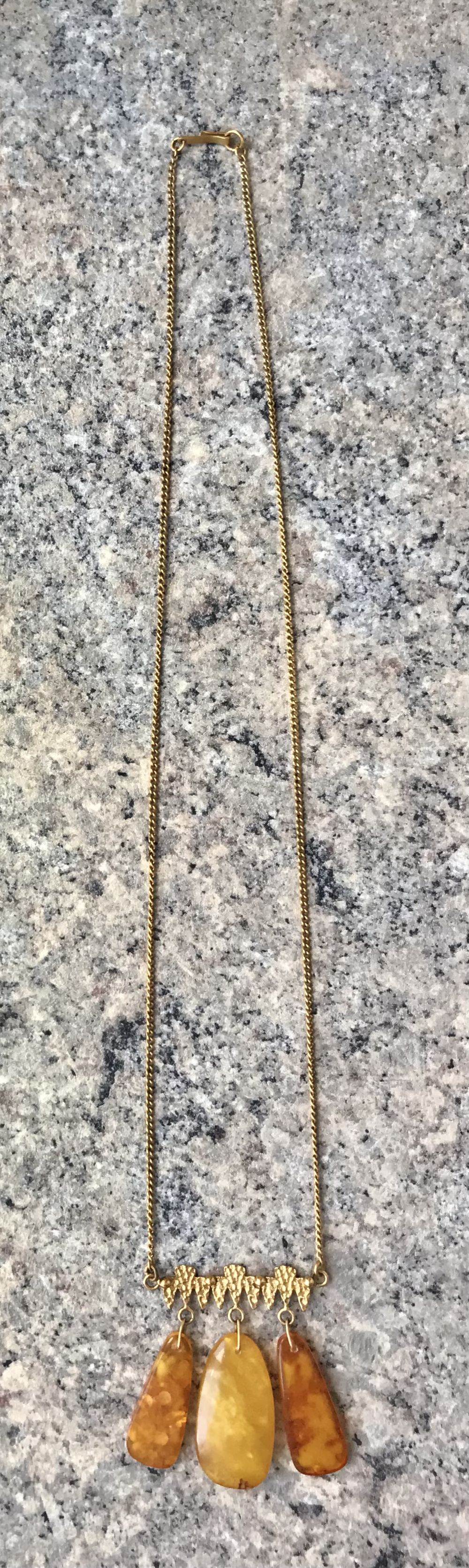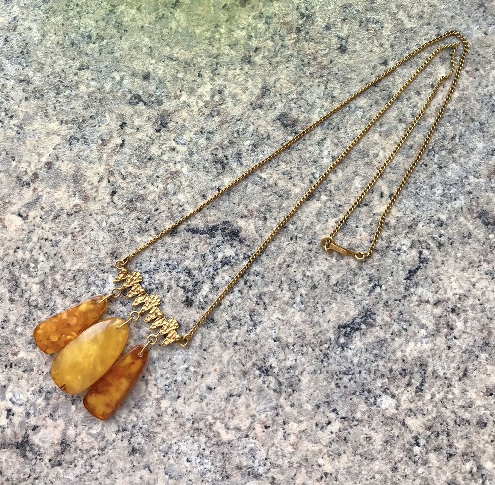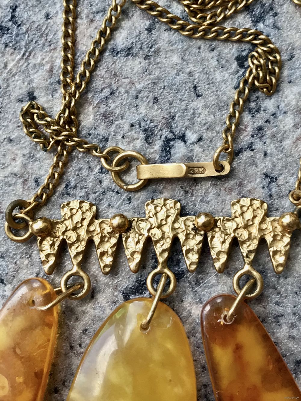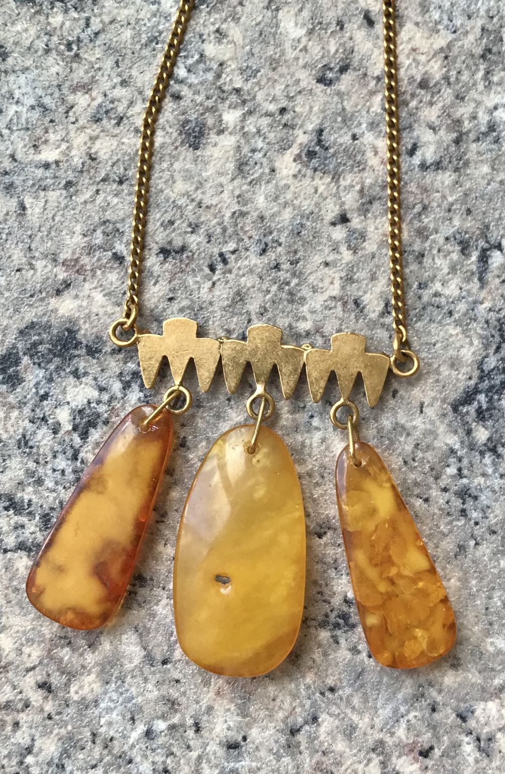Винтажное колье с основой из латуни с позолотой и подвесок из янтаря, изготовлено на Калининградском янтарном комбинате (именник •2ЯК). Длина цепочки 60см., длина колье с подвесками 68см. Размер центральной подвески 3,5х1,9см.(на лицевой стороне возле отверстия для крепления имеется небольшой скол, в глаза не бросается), размер боковых подвесок 3,2х1,2см. Общее состояние украшения хорошее.