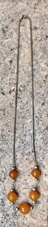 Винтажное колье из мельхиора и янтаря. Длина 54см., диаметр янтарных шариков 1см., 1,2см., 1,5см. Состояние хорошее.