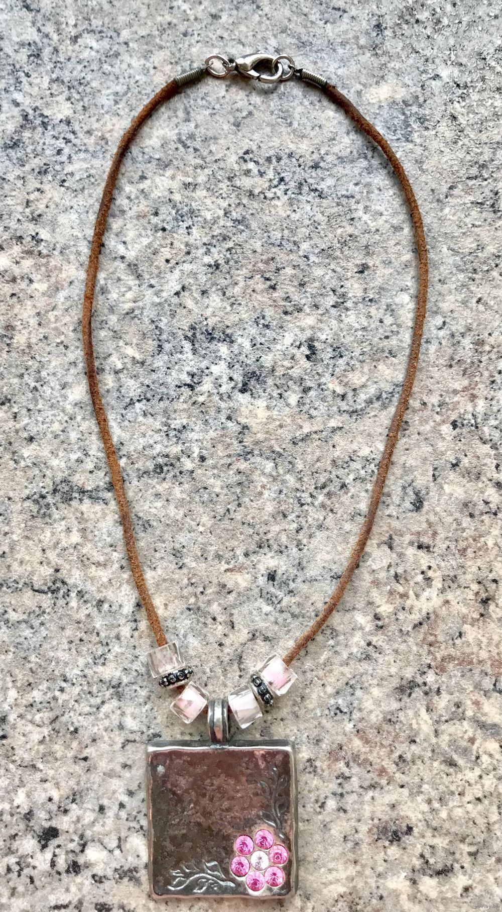 Кулон из металла серебристого тона с гипоаллергенным покрытием на замшевом шнурке израильского бренда бижутерии AVGAD. Высота кулона с петлей 4,4см., размер подвески 3,4х3,4см. Длина шнура 38см. Маркировано. Состояние хорошее.