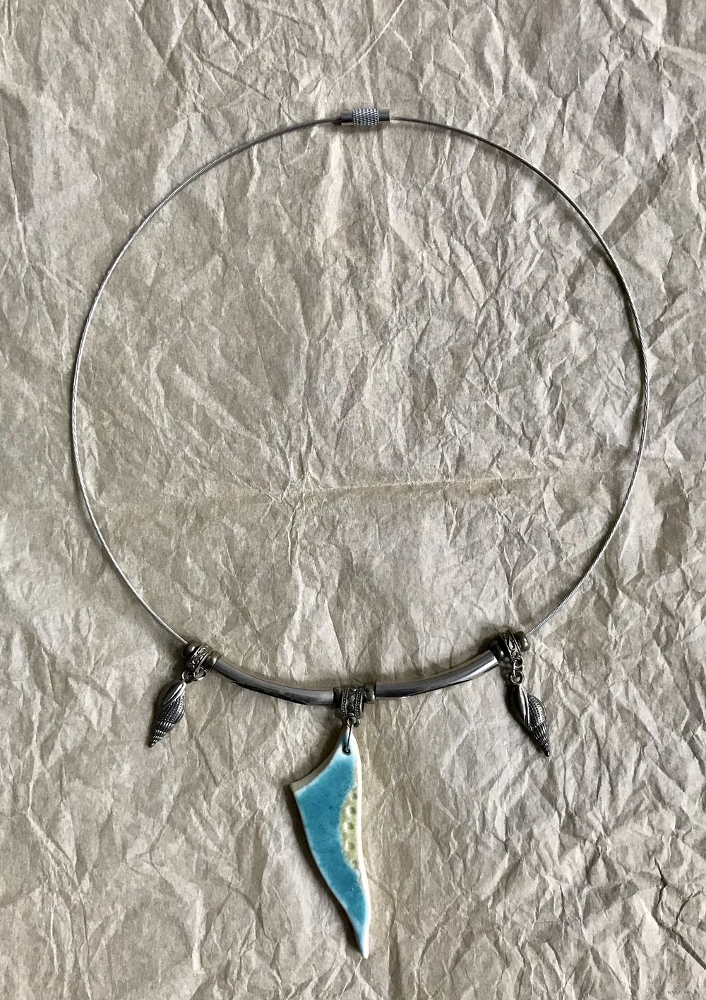 Колье-чокер от белорусского мастера Клейменова Алина (бренд Silver Willow ) с основой из металла серебристого тона, подвеска выполнена из керамики. Диаметр колье в застегнутом виде 15см., размер подвески 6х2см. Маркировано. Состояние хорошее.