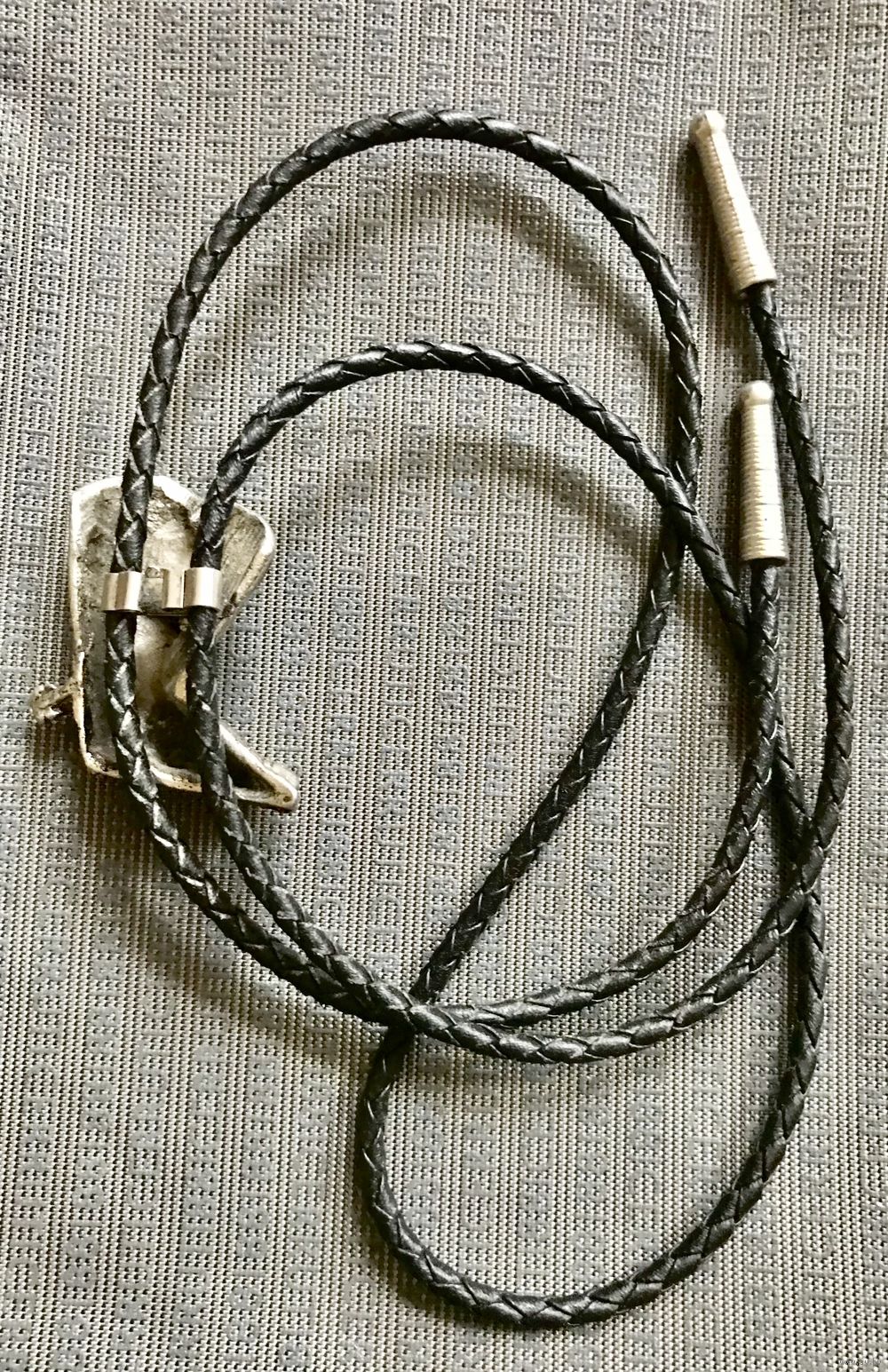 Винтажное украшение унисекс галстук боло. Декоративный элемент в виде ковбойских сапог (высота 4,3см.) сделан из металла серебристого тона, очень похож на пьютер. Шнур из синтетического материала, длина 88 см. Состояние хорошее.