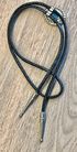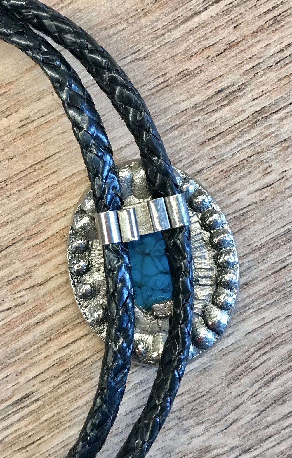 Украшение унисекс галстук боло. Декоративный элемент (размер 3,7х3см.) сделан из металла серебристого тона, лицевая сторона украшена вставками из плотного пластика под бирюзу. Шнур из синтетического материала, длина 85см. Состояние хорошее.