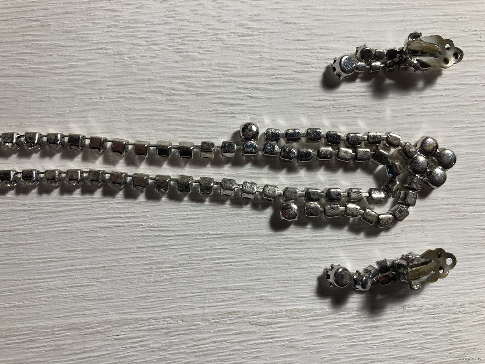 /45/ Длина колье 41 см, длина клипсы 3 см, основа изделия металл серебристый, стразы - стекло. Без дефектов, не использовался.