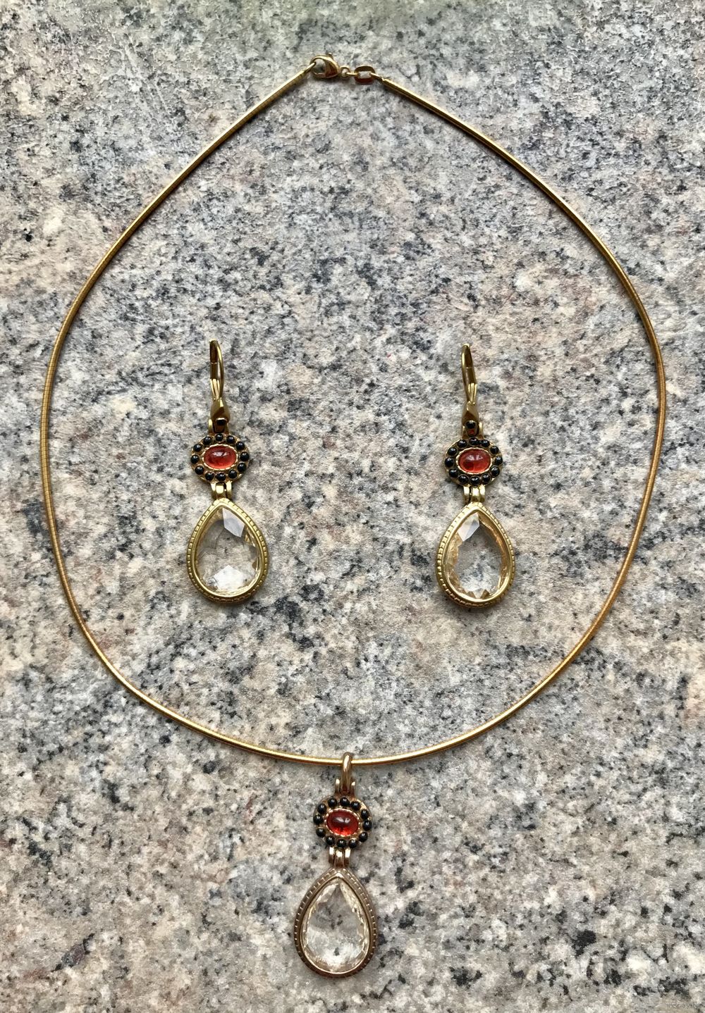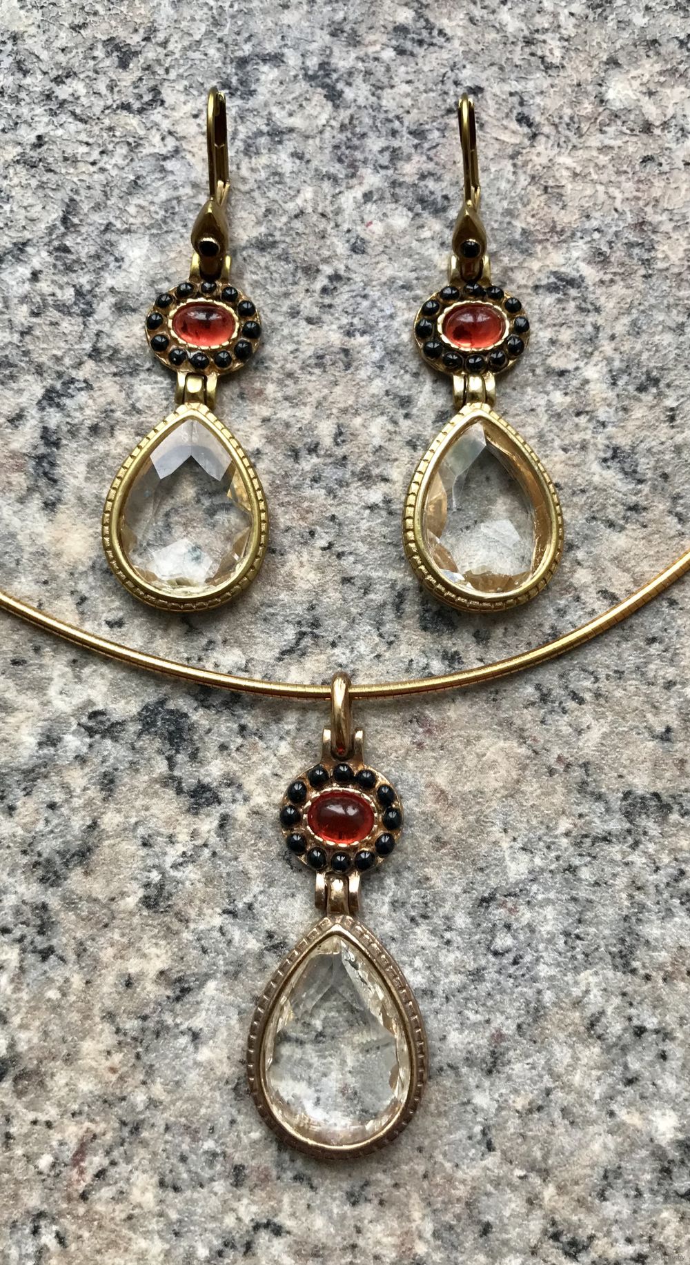 Комплект из металла золотистого тона, вставки из стекла, смолы и смальты. Это копии украшений, оригиналы которых находятся на экспозиции во дворце Топкапы. Украшения были куплены в Лувре, в магазинчике, торгующем копиями украшений со многих известных музеев мира. Высота серьги 5,5см., высота кулона с петлей 4,5см., длина цепочки 42см. Цвет металла в кулоне и серьгах немного отличается, но в носке это не заметно. Украшения маркированы.