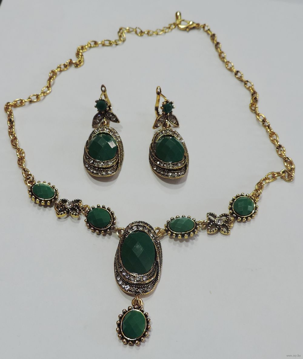Колье и серьги с зелёными вставками имитирующее камень 80-90-е годы Италия. Длина с цепью 48 см. Размер серьги 1.9-4.8 см. В очень хорошем состоянии.