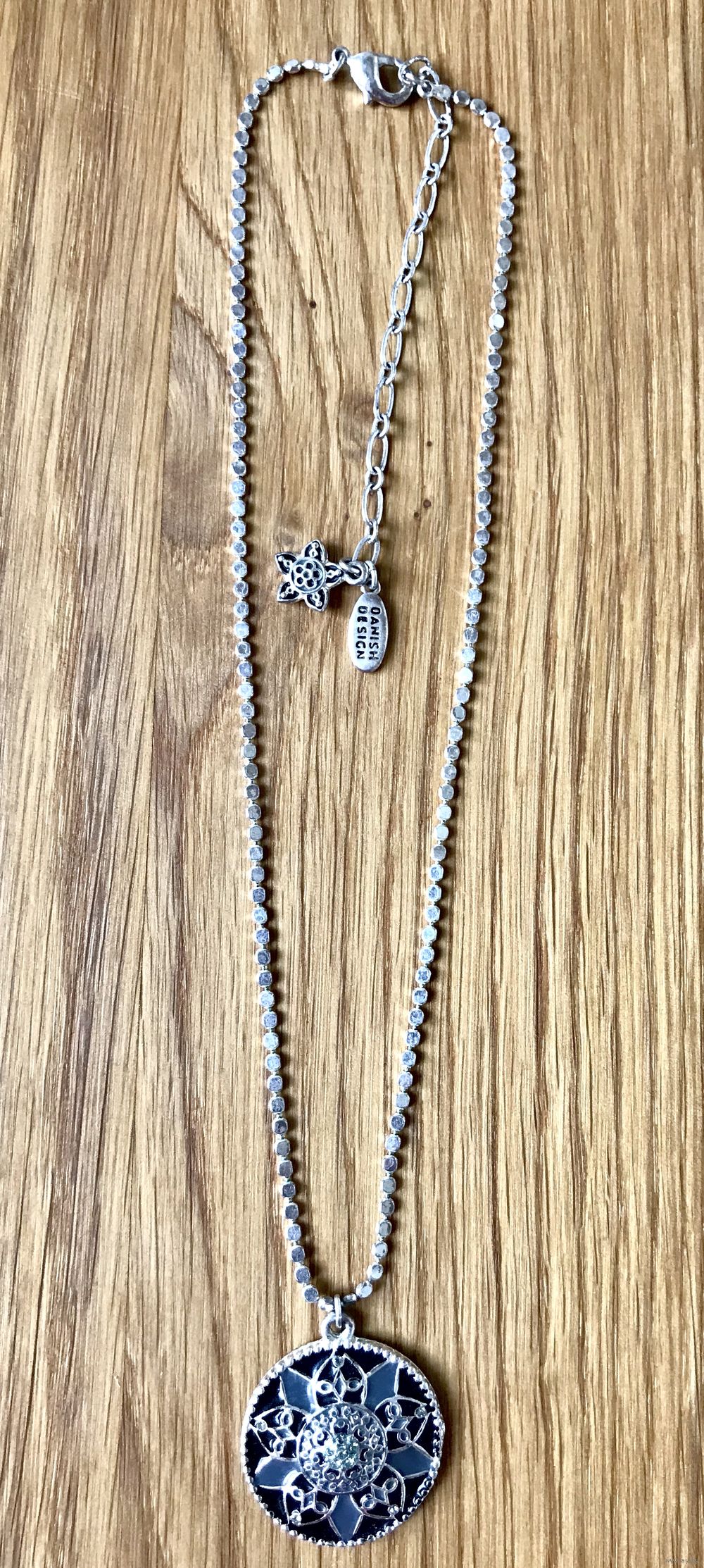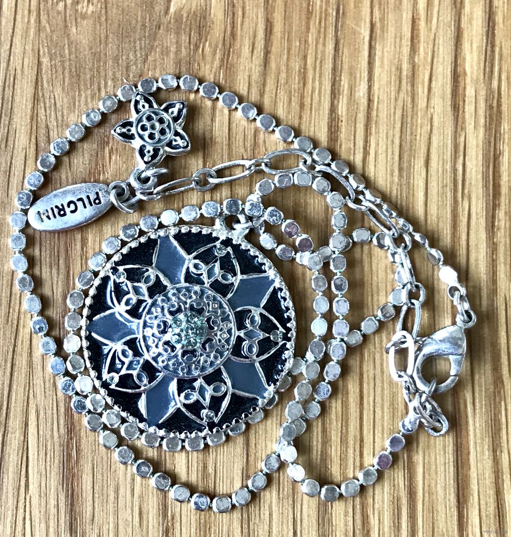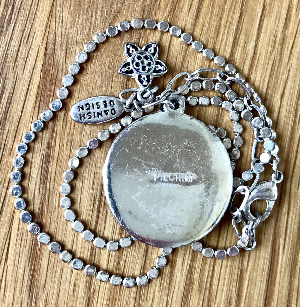 Украшение известного датского бренда бижутерии Pilgrim. Длина цепочки 37см.+8см. дополнительная часть . Кулон с лицевой стороны украшен эмалями и кристаллами сваровски, диаметр кулона 2,5см. Состояние хорошее.