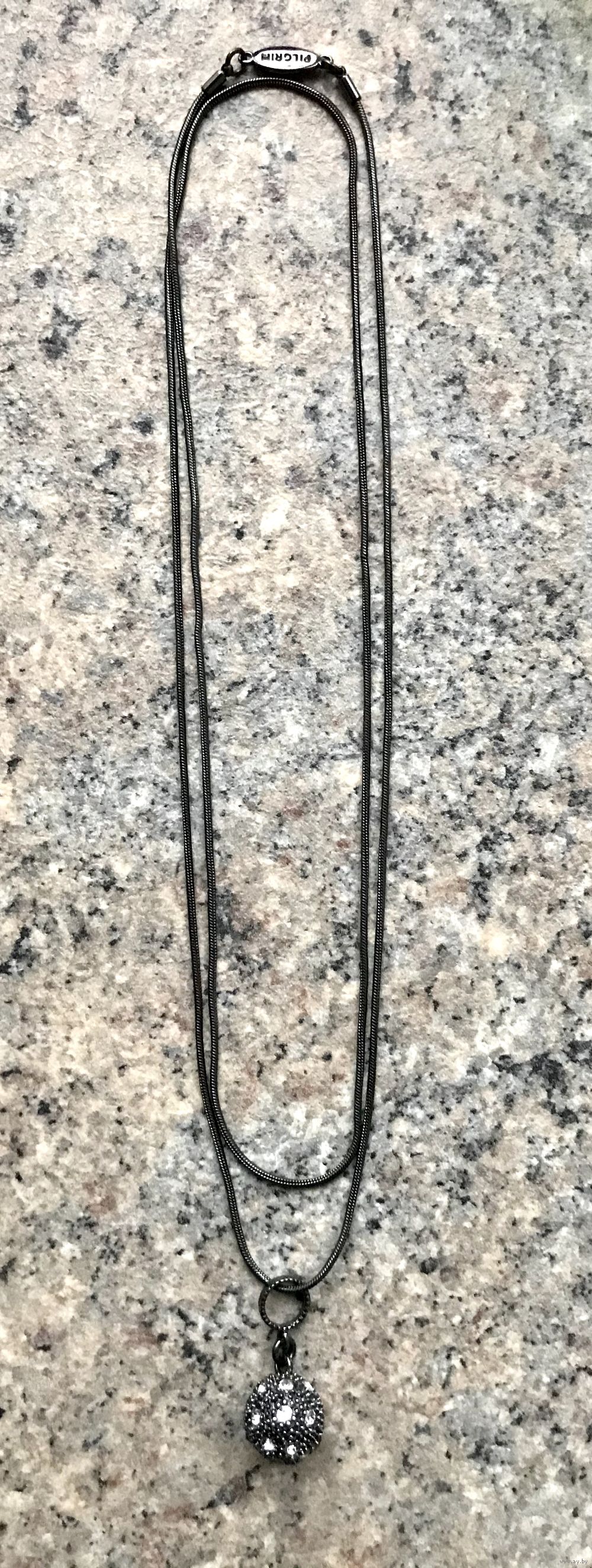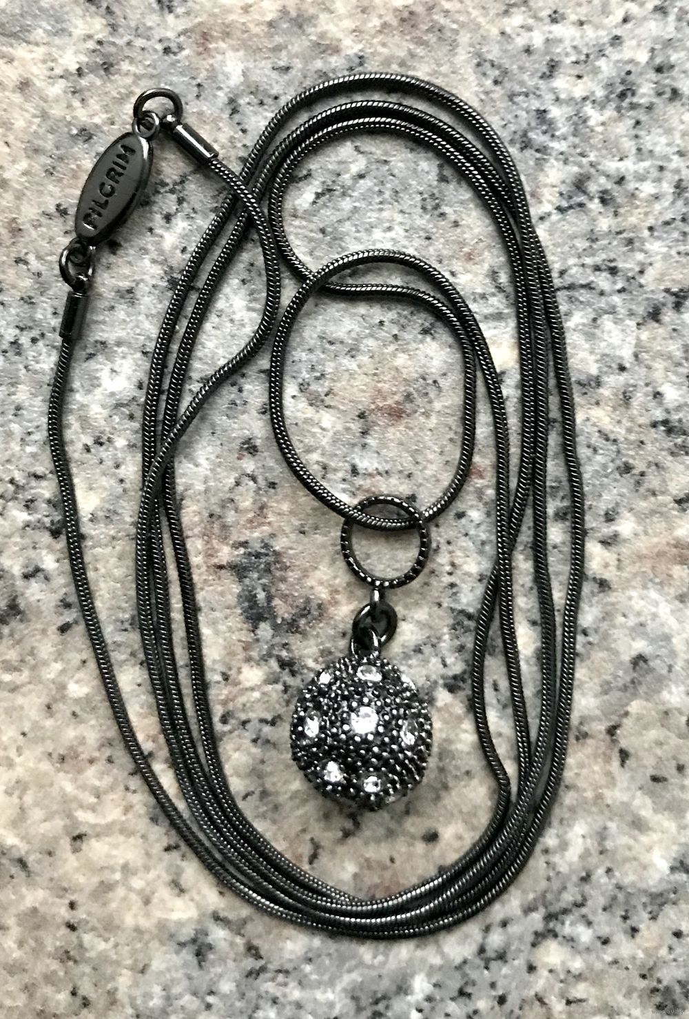 Украшение известного датского бренда бижутерии Pilgrim. Кулон на неразъёмной цепочке. Длина цепочки 78см. Кулон украшен кристаллами сваровски, высота кулона с колечком 2,5см, диаметр ~1,3см. Состояние хорошее.