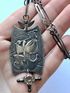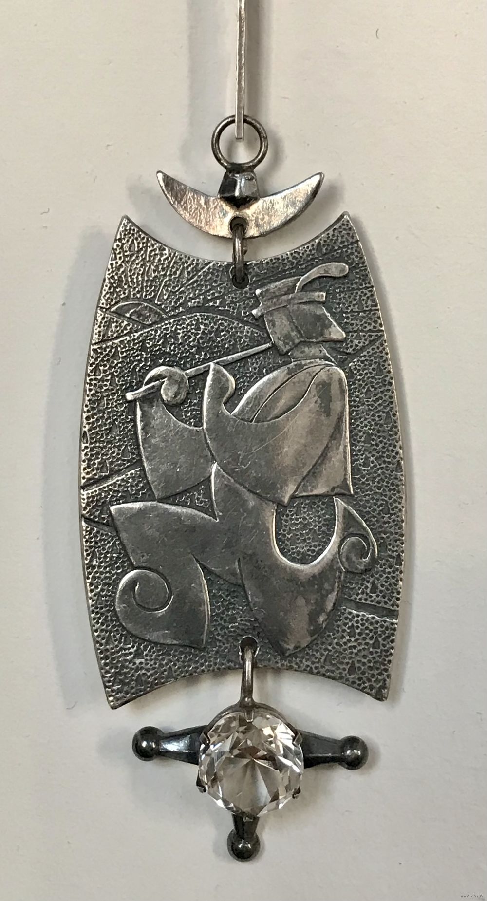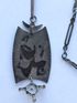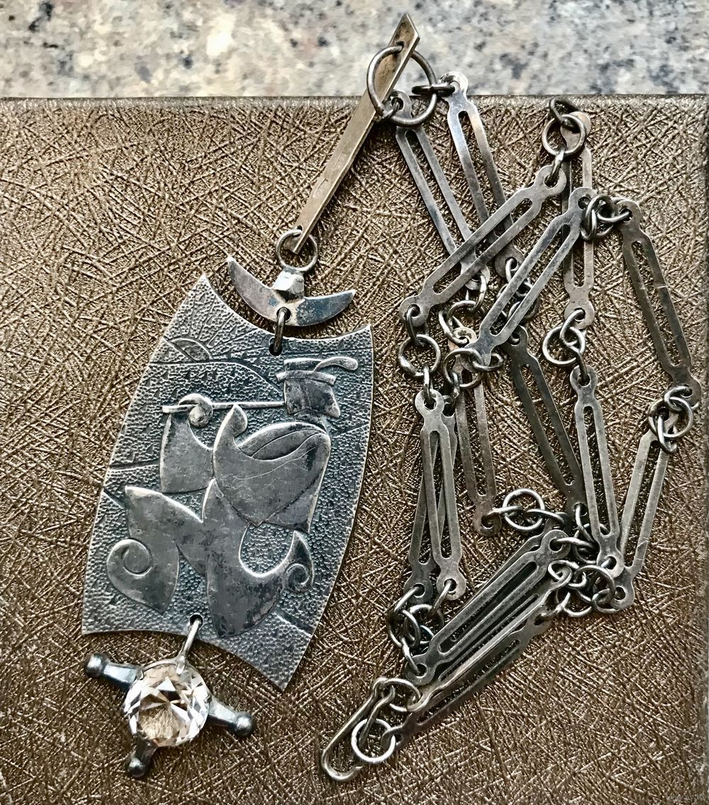 Редкое крупное колье «Лель» из серебра 875пр. и вставки из природного дымчатого кварца. Сделано в 1971г. во Львове (именник 1ЛВ). Металл покрыт благородной патиной. Длина цепочки 56см., разъемная. Высота кулона с подвеской 10,5см., ширина 3см., диаметр вставки 1см. Вес 24,32гр. Состояние отличное.