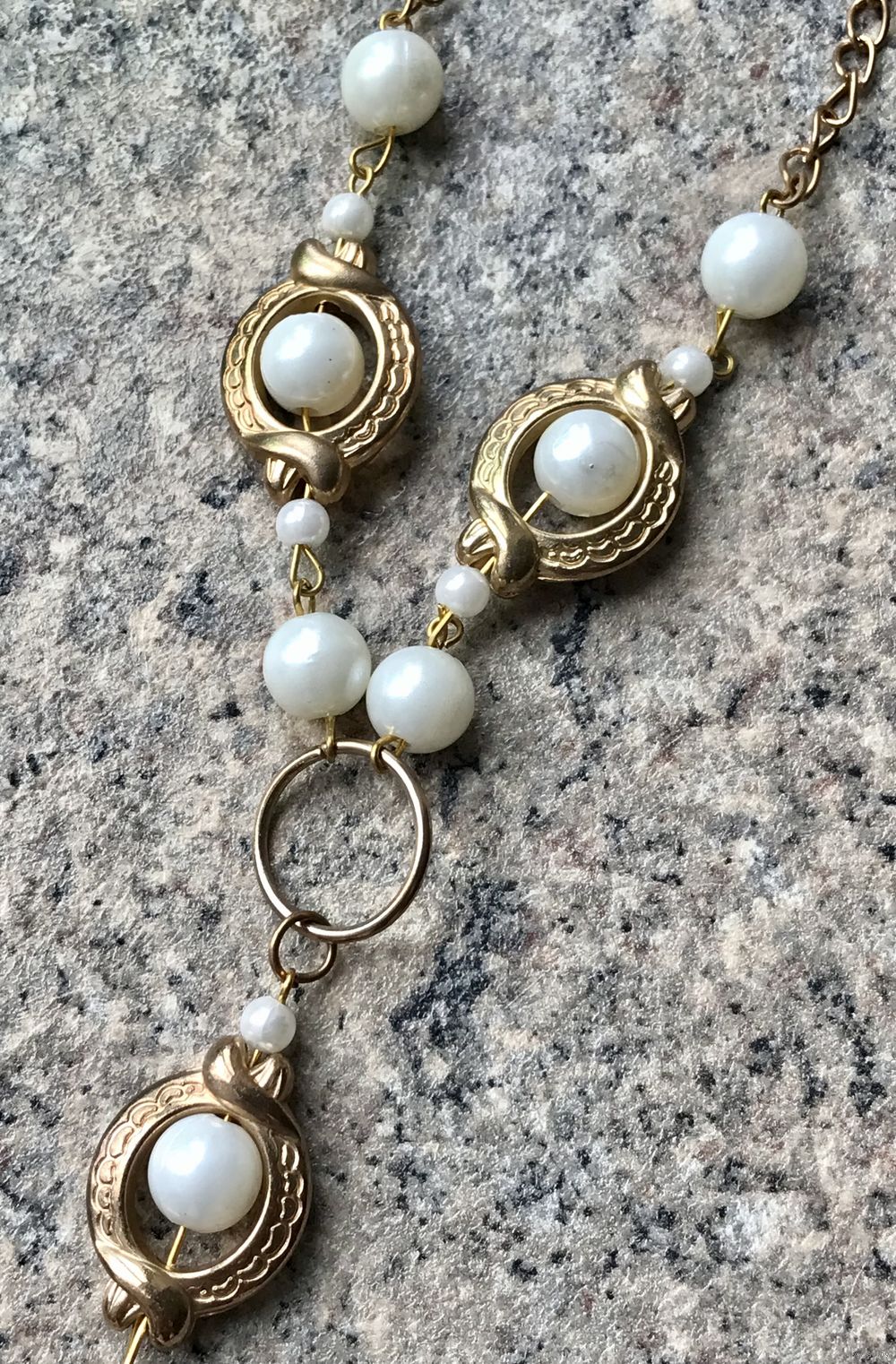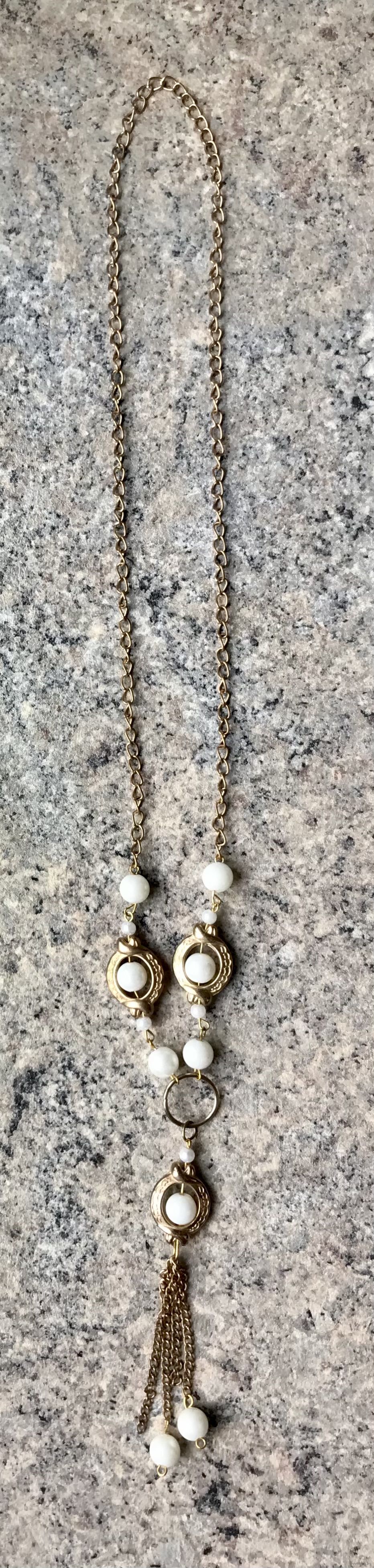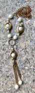 Сотуар с основой из металла золотого тона и бусин из пластика. Длина 92см. вместе с висюльками, длина цепочки 66см. Состояние хорошее.
