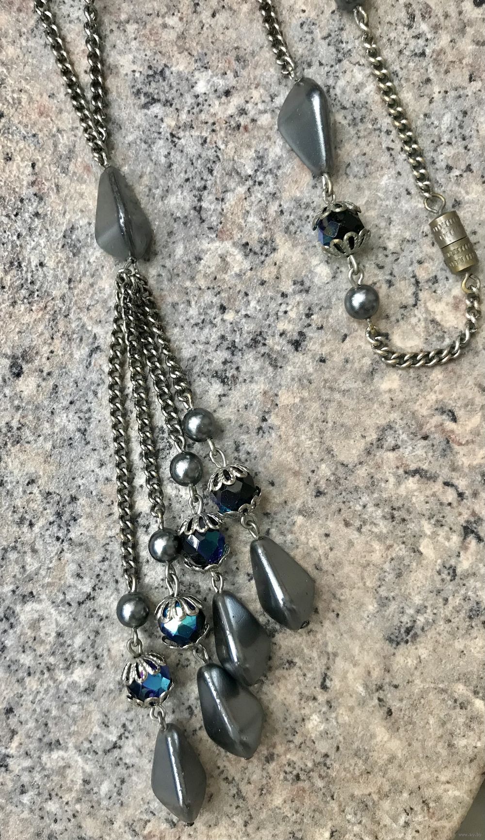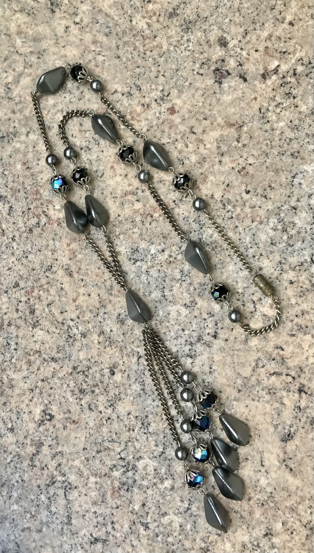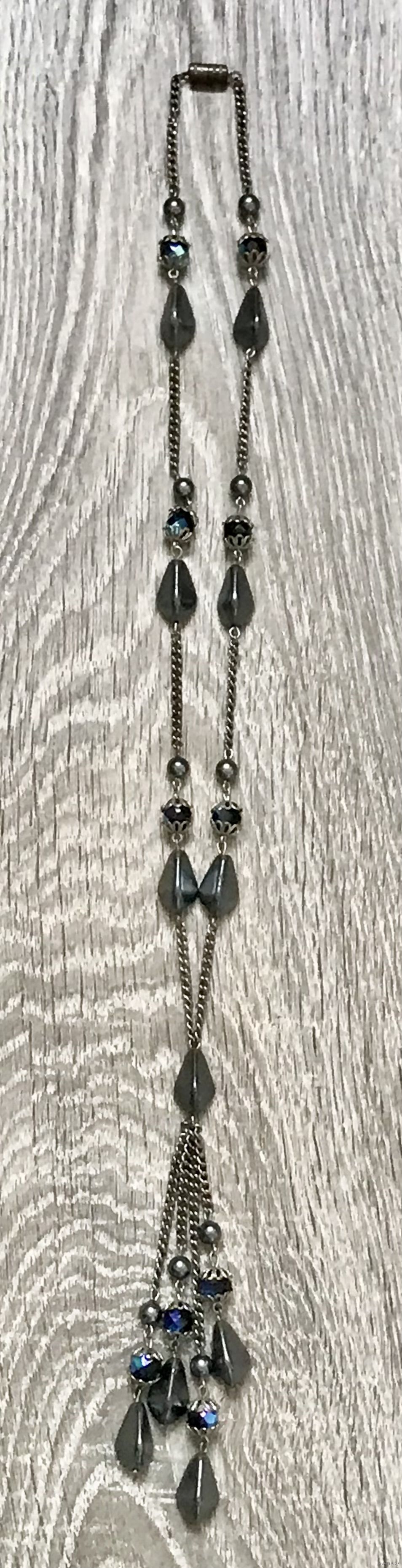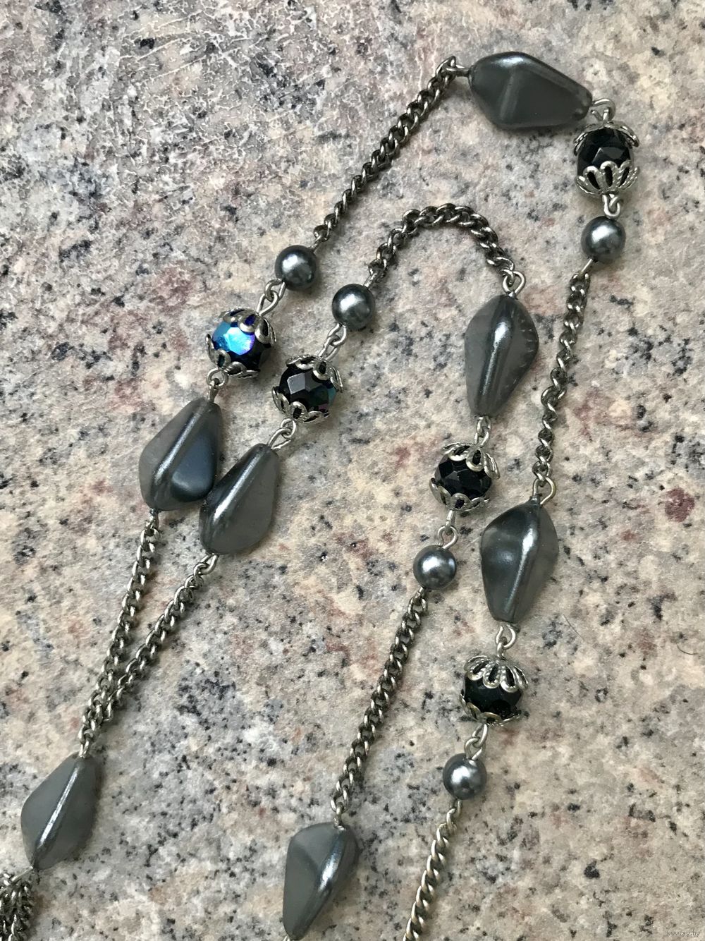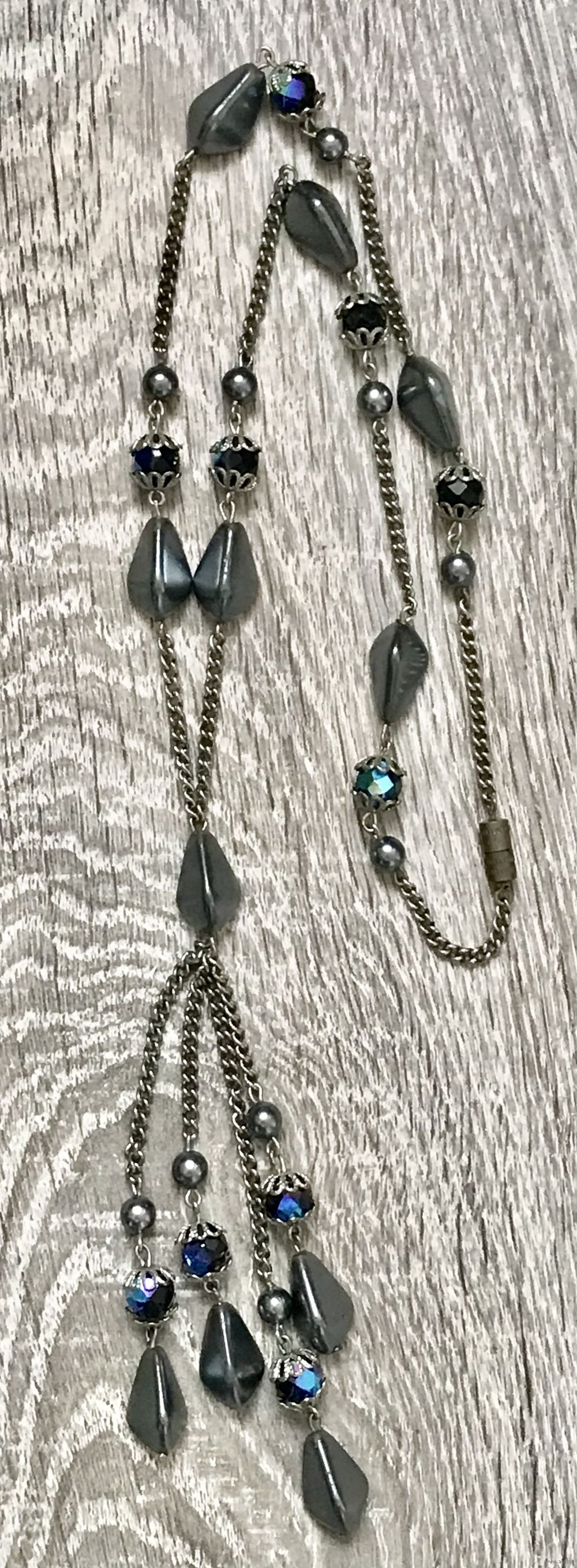 Винтажный чешский сотуар. Бусины из стекла (на серых есть незначительные потёртости покрытия), цепочка из латуни с серебрением. Длина цепочки 56см., длина висюлек 12см.