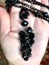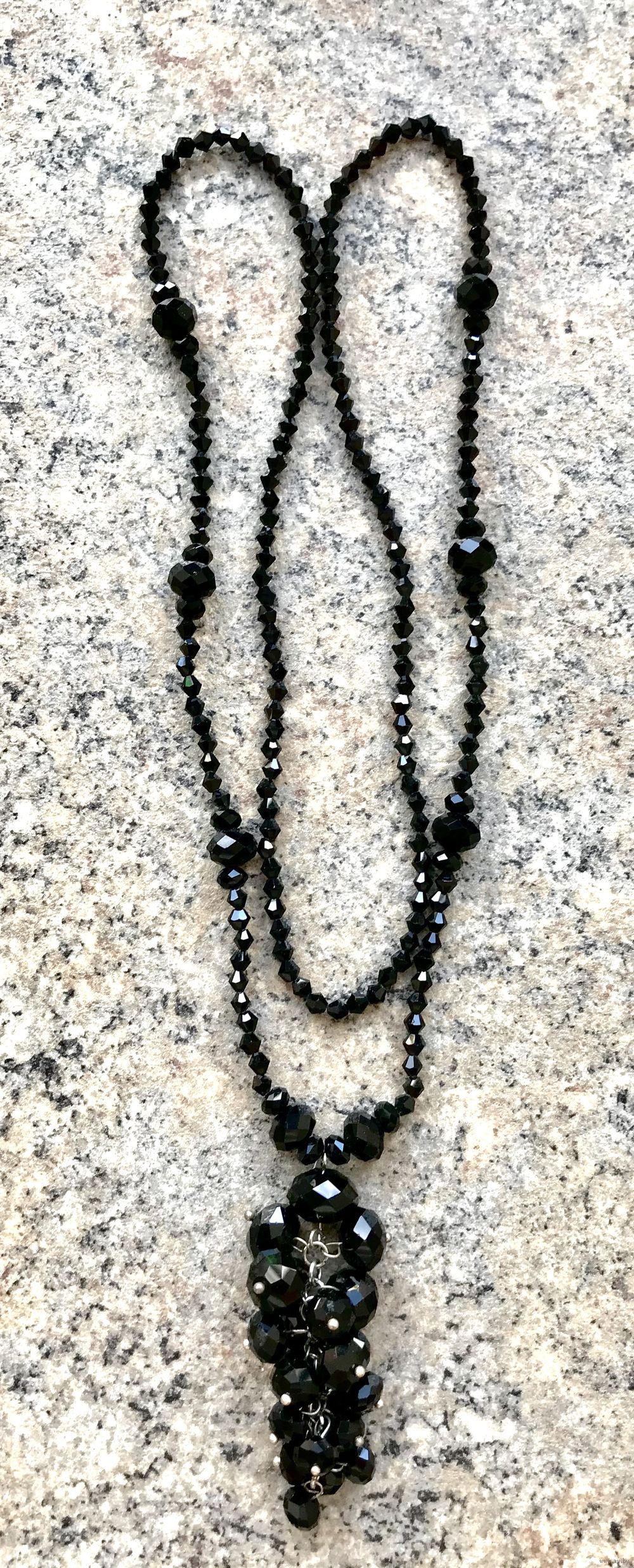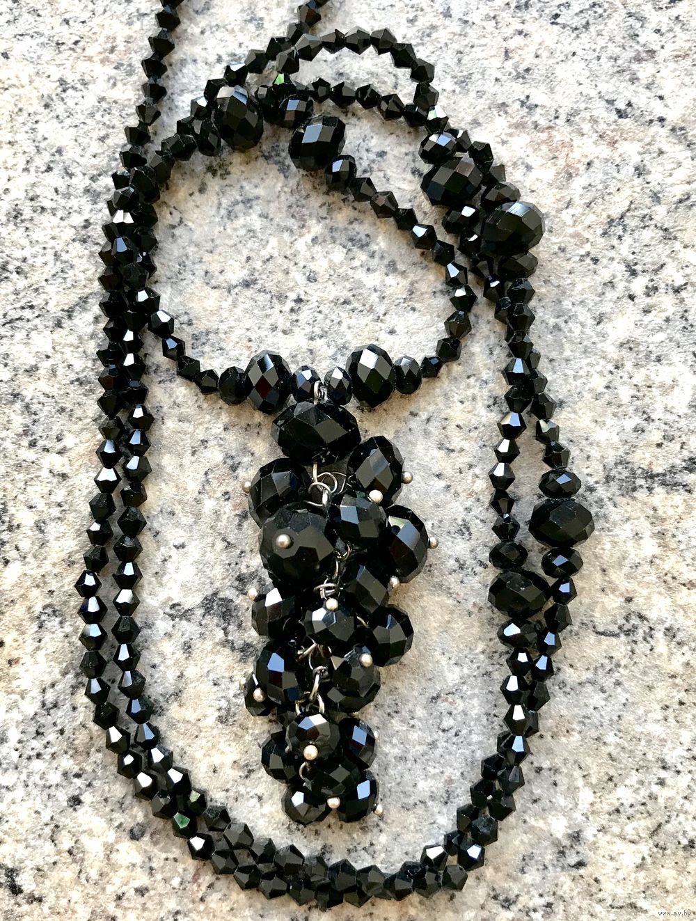 Винтажный сотуар из стеклянных гранёных бусин чёрного цвета формы биконус. Длина 86см. плюс подвеска 7 см. Неразъёмный. Состояние хорошее.