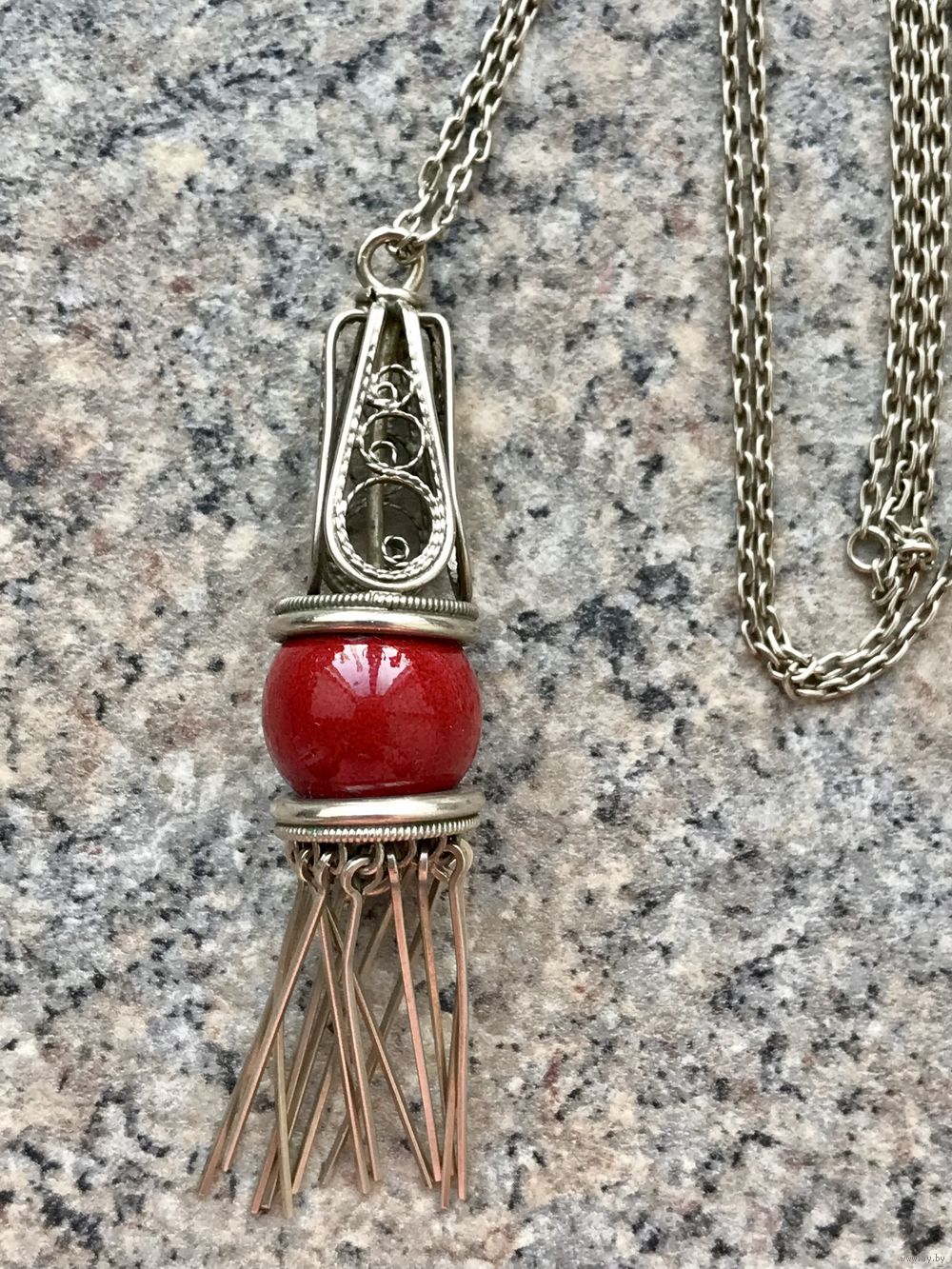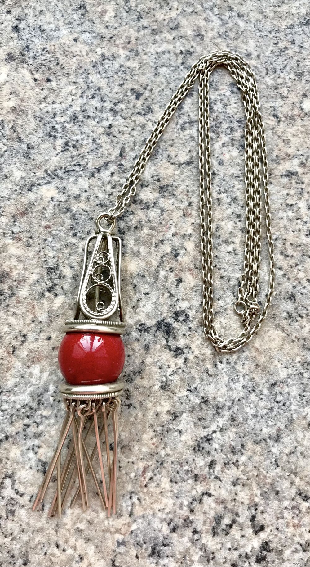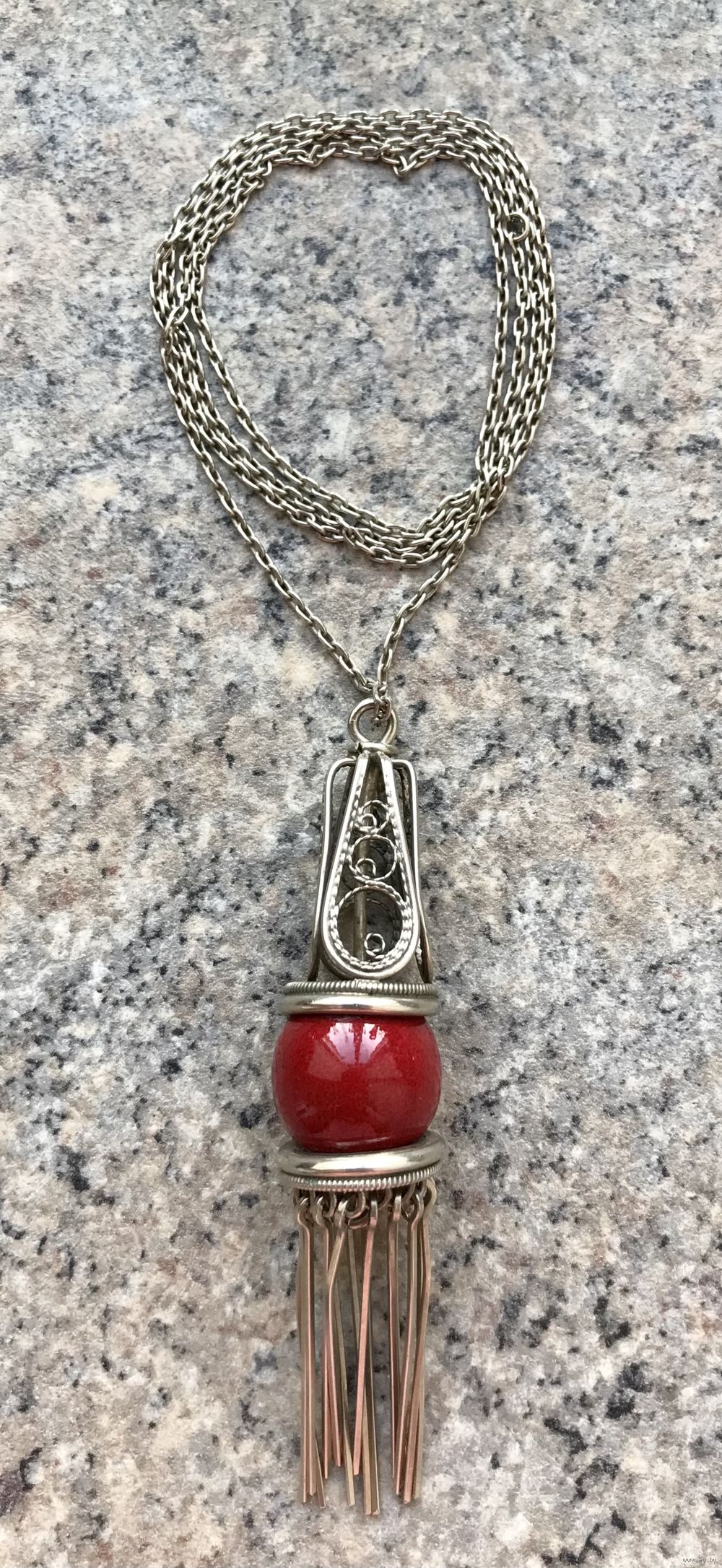 Сотуар с основой из металла серебристого тона, вставка в подвеске из цветного стекла. Длина цепочки 76см., высота подвески с висюльками 9см. Цепочка неразъемная. Состояние хорошее.