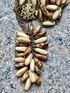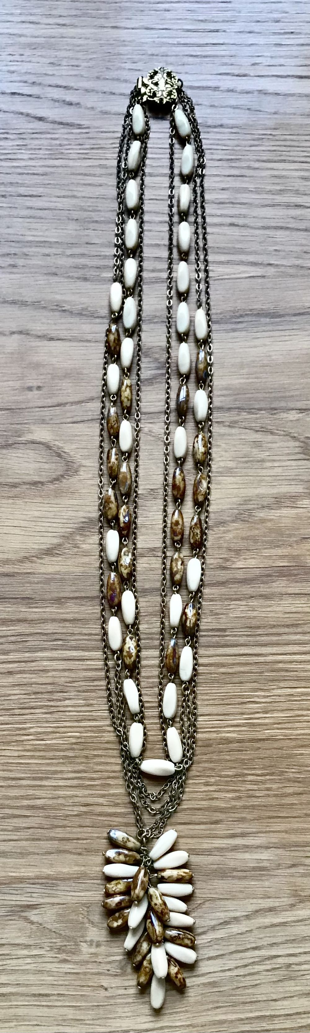 Винтажное чешское 4-х рядное колье, состоящее из металлических цепочек золотого тона и стеклянных бусин. Длина верхнего ряда 60см., длина нижнего ряда 74см.+ подвеска длиной 7см. Состояние хорошее.