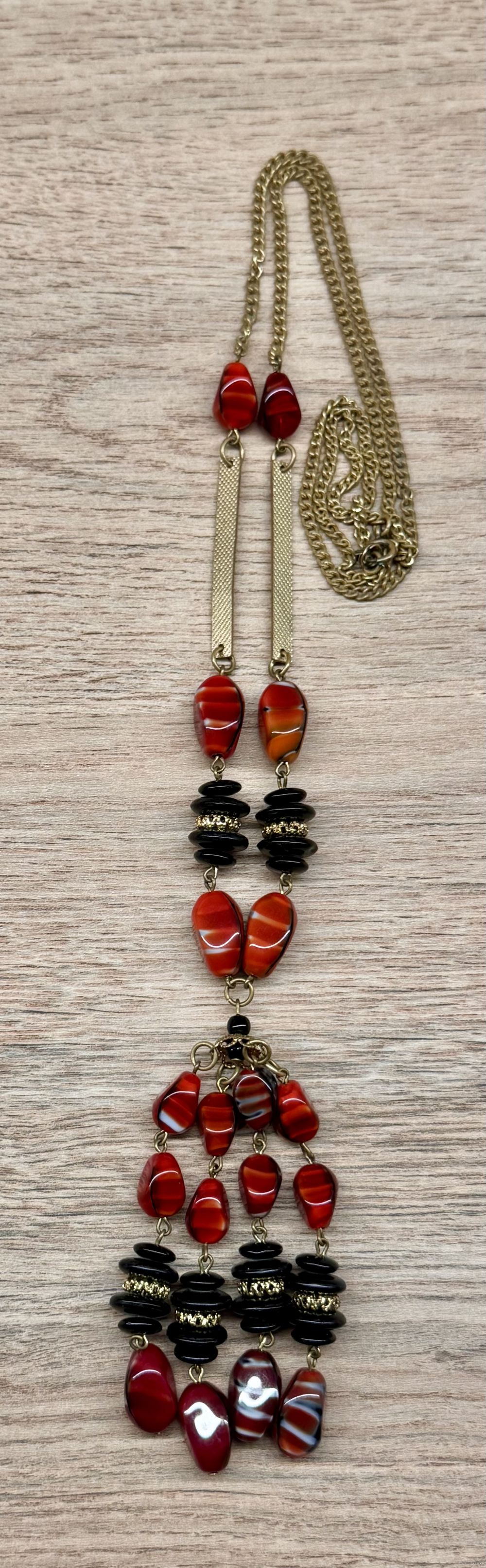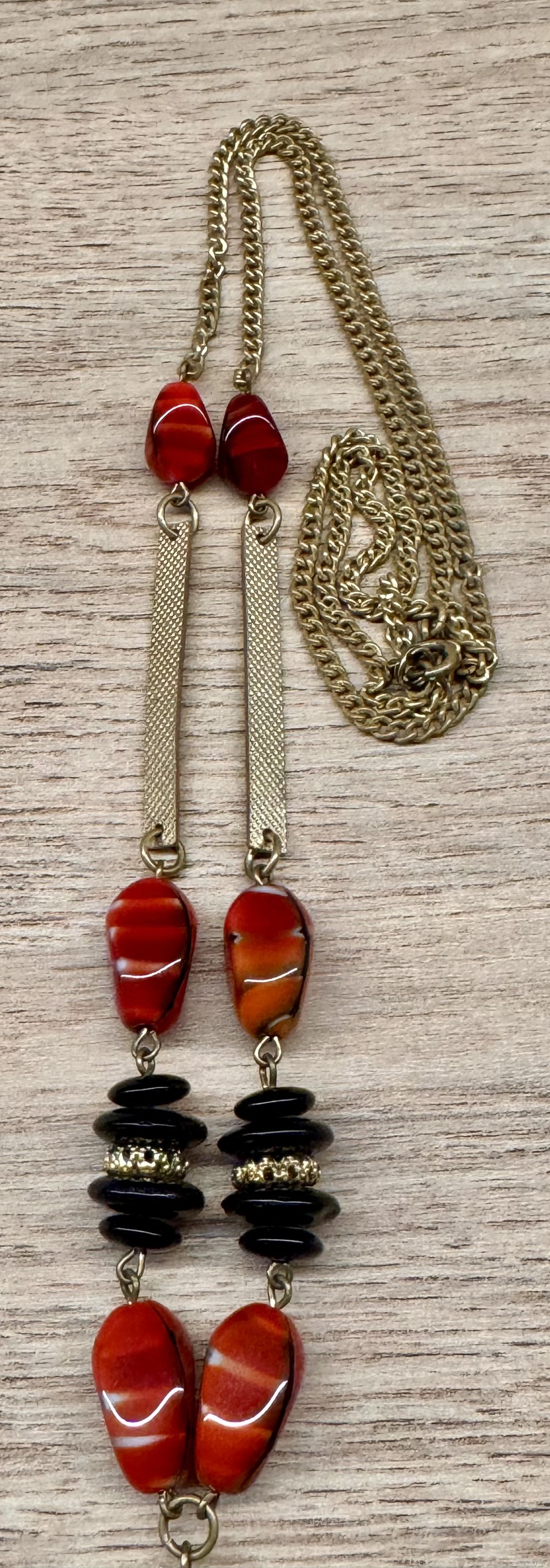 Винтажный сотуар с основой из латунной цепочки и бусин из худ.стекла. Длина всего украшения 96см., длина цепочки 78см., длина висюлек 8см. На цепочке местами имеется потертости позолоты. Общее состояние украшения хорошее.