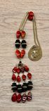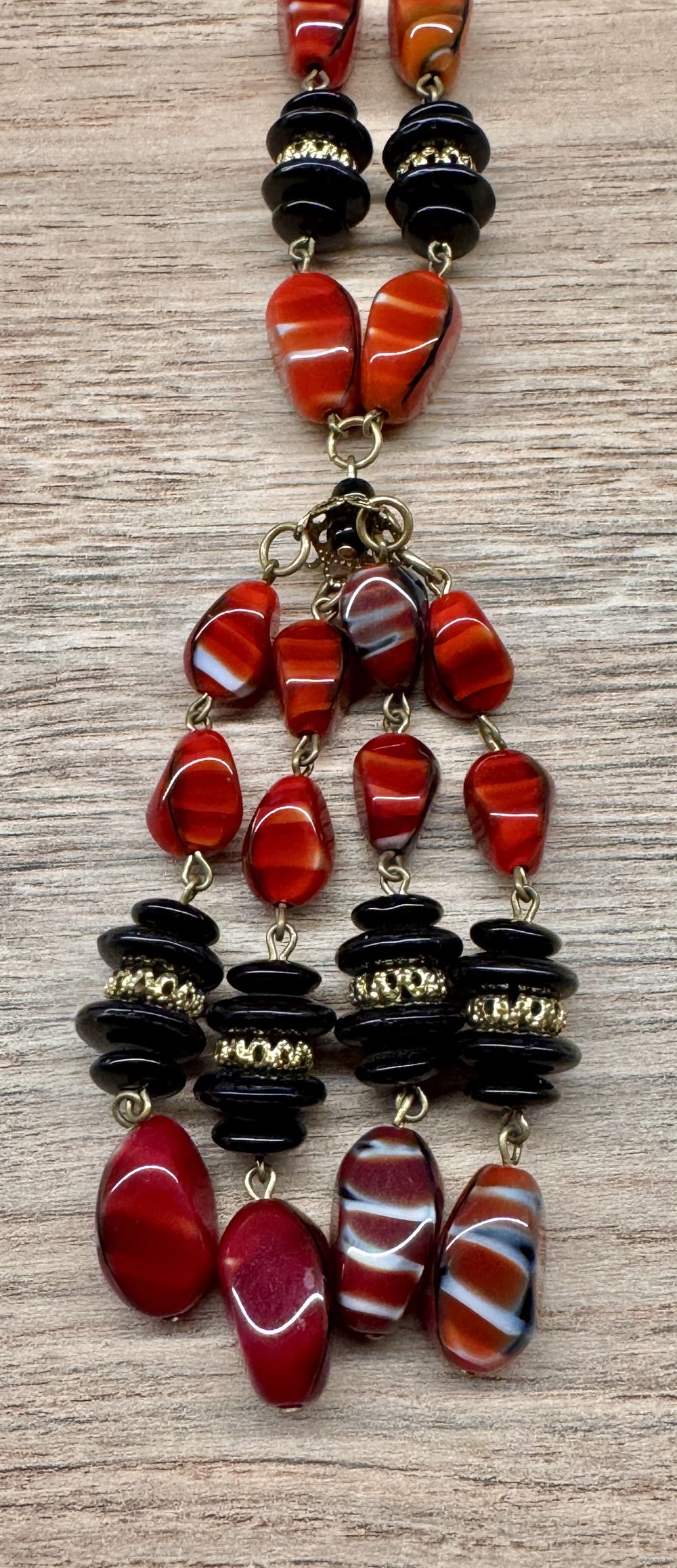 Винтажный сотуар с основой из латунной цепочки и бусин из худ.стекла. Длина всего украшения 96см., длина цепочки 78см., длина висюлек 8см. На цепочке местами имеется потертости позолоты. Общее состояние украшения хорошее.