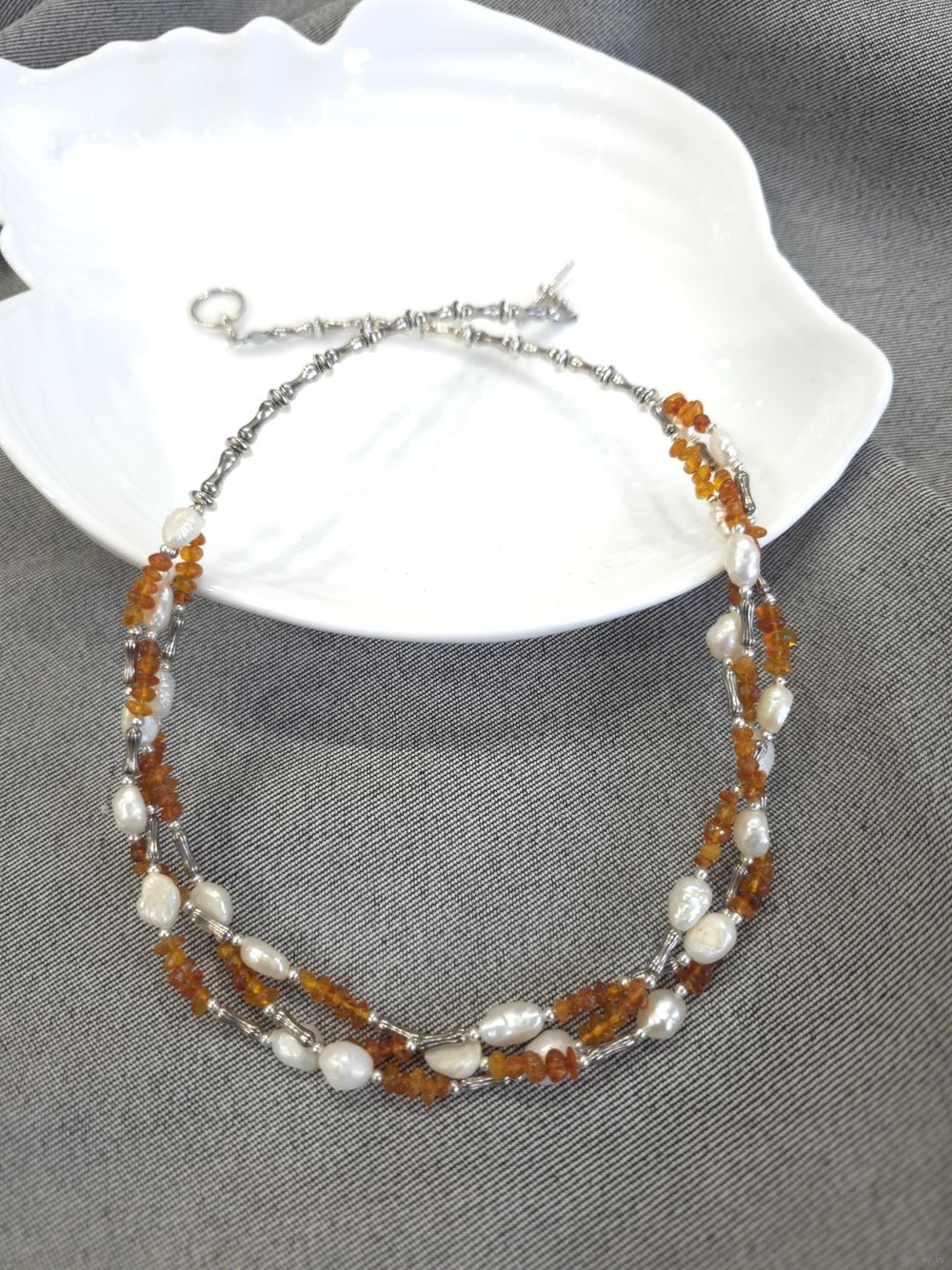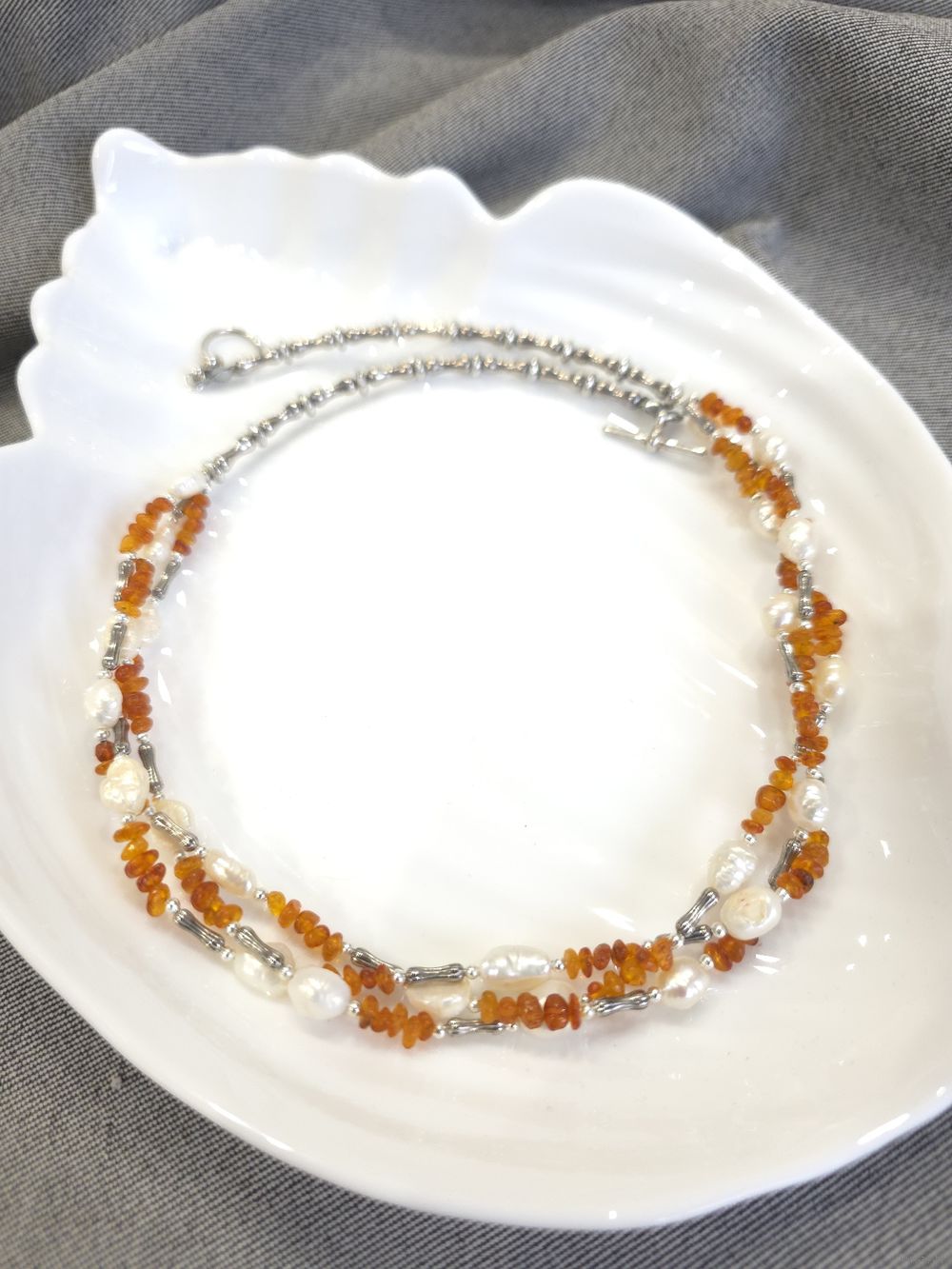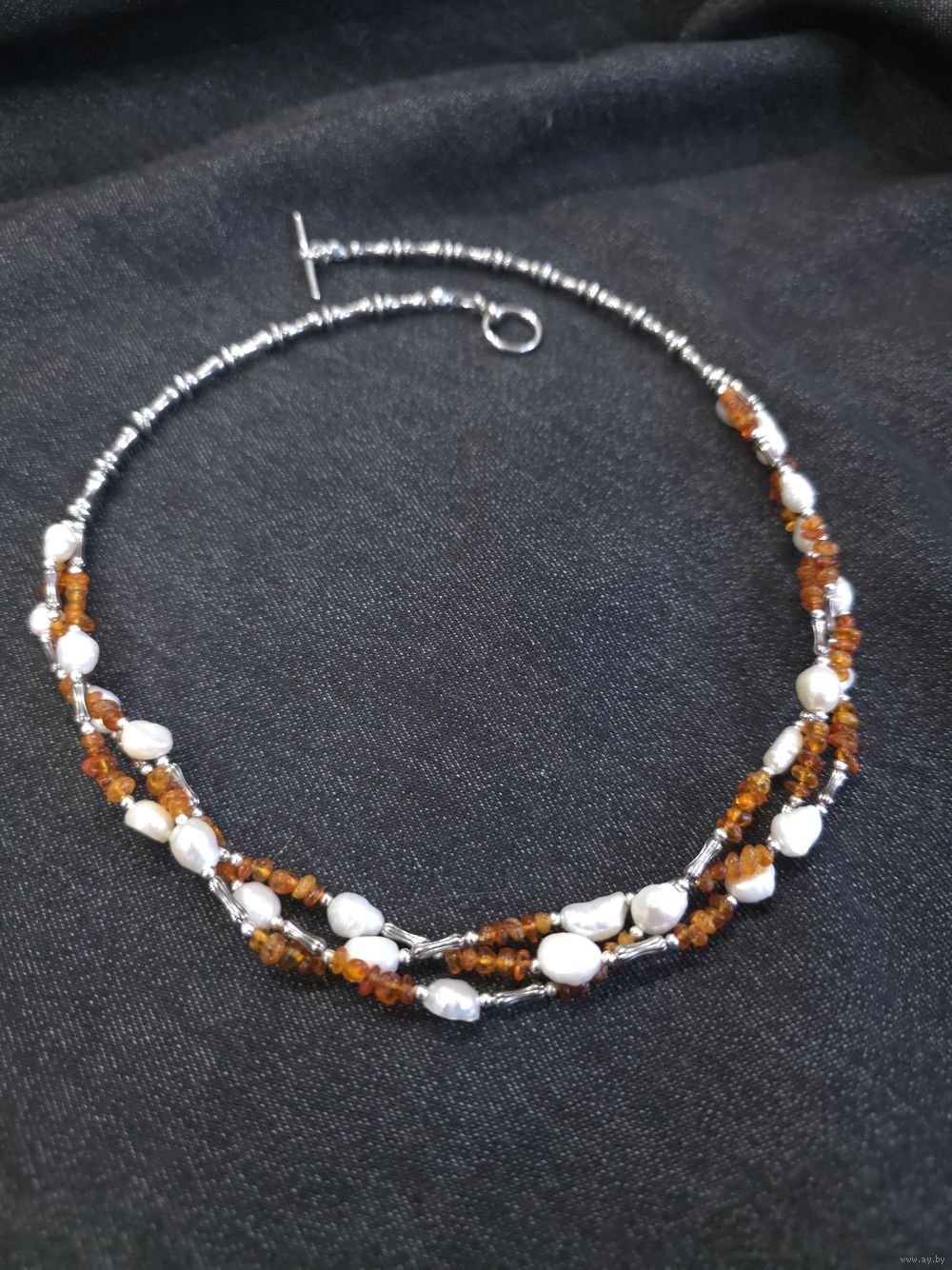 Колье/бусы выполнены из натурального винтажного жемчуга в дополнении с натуральным янтарем.