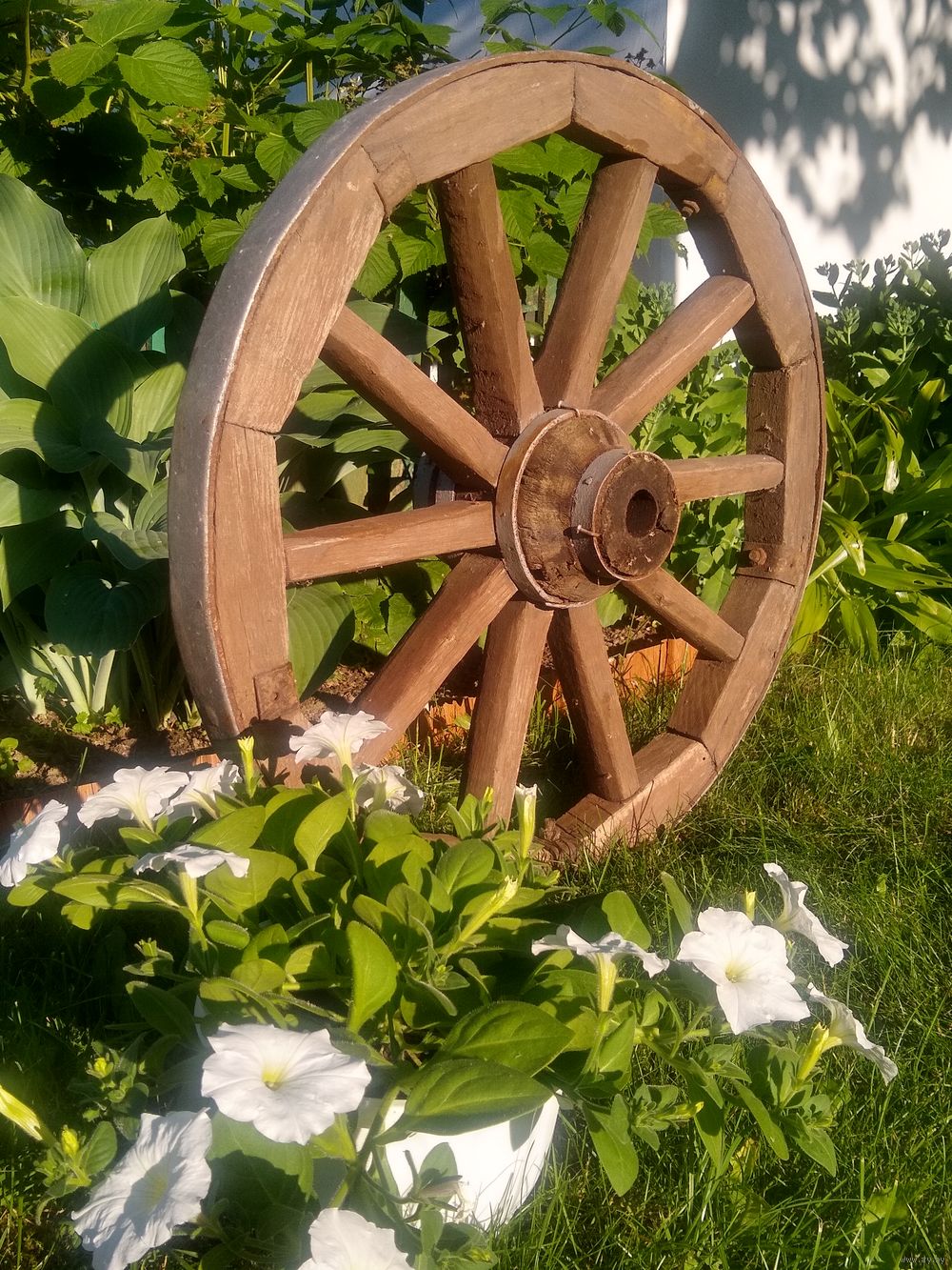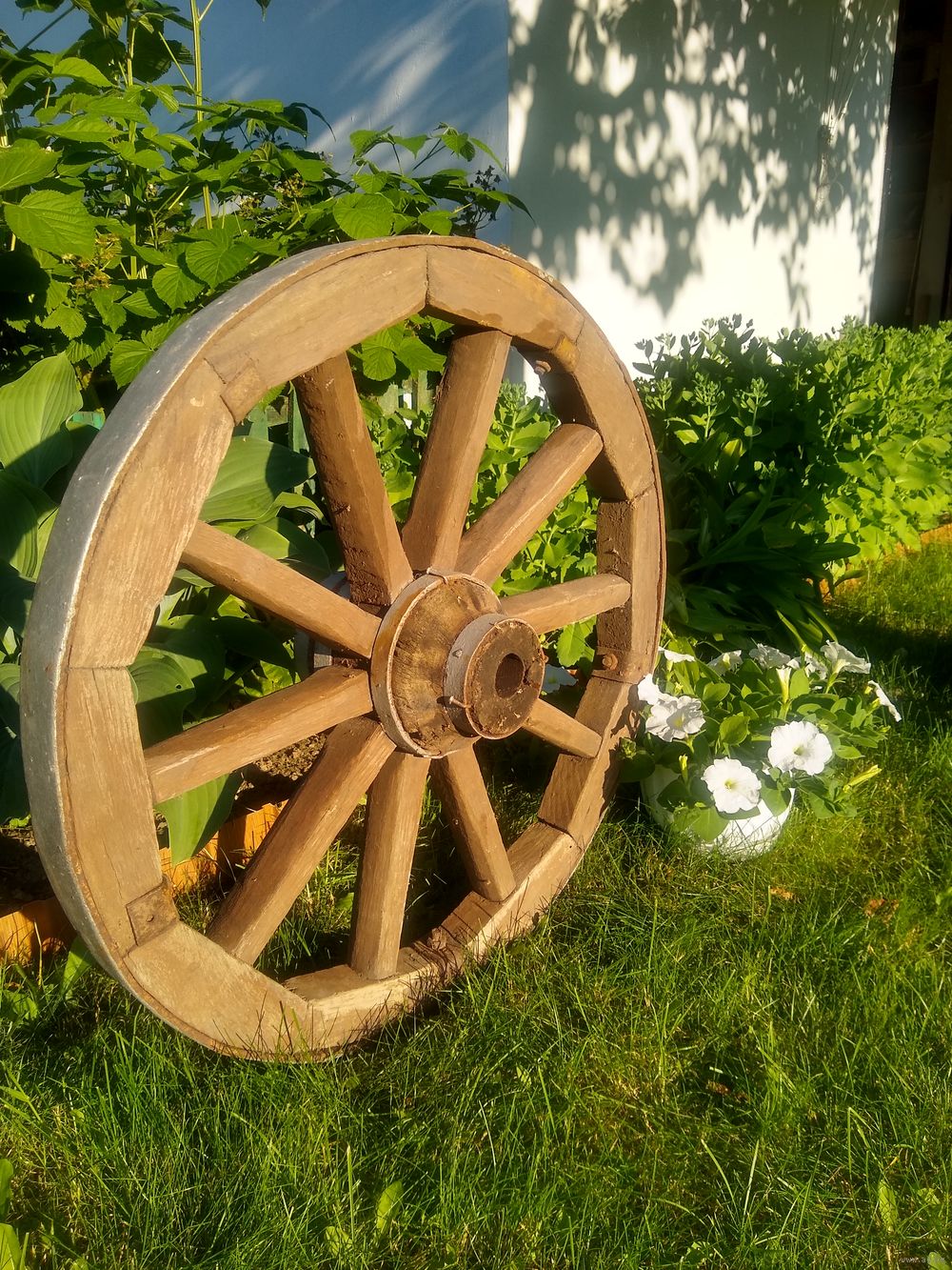 Колесо от телеги на 10 спиц, деревянное на ободе.