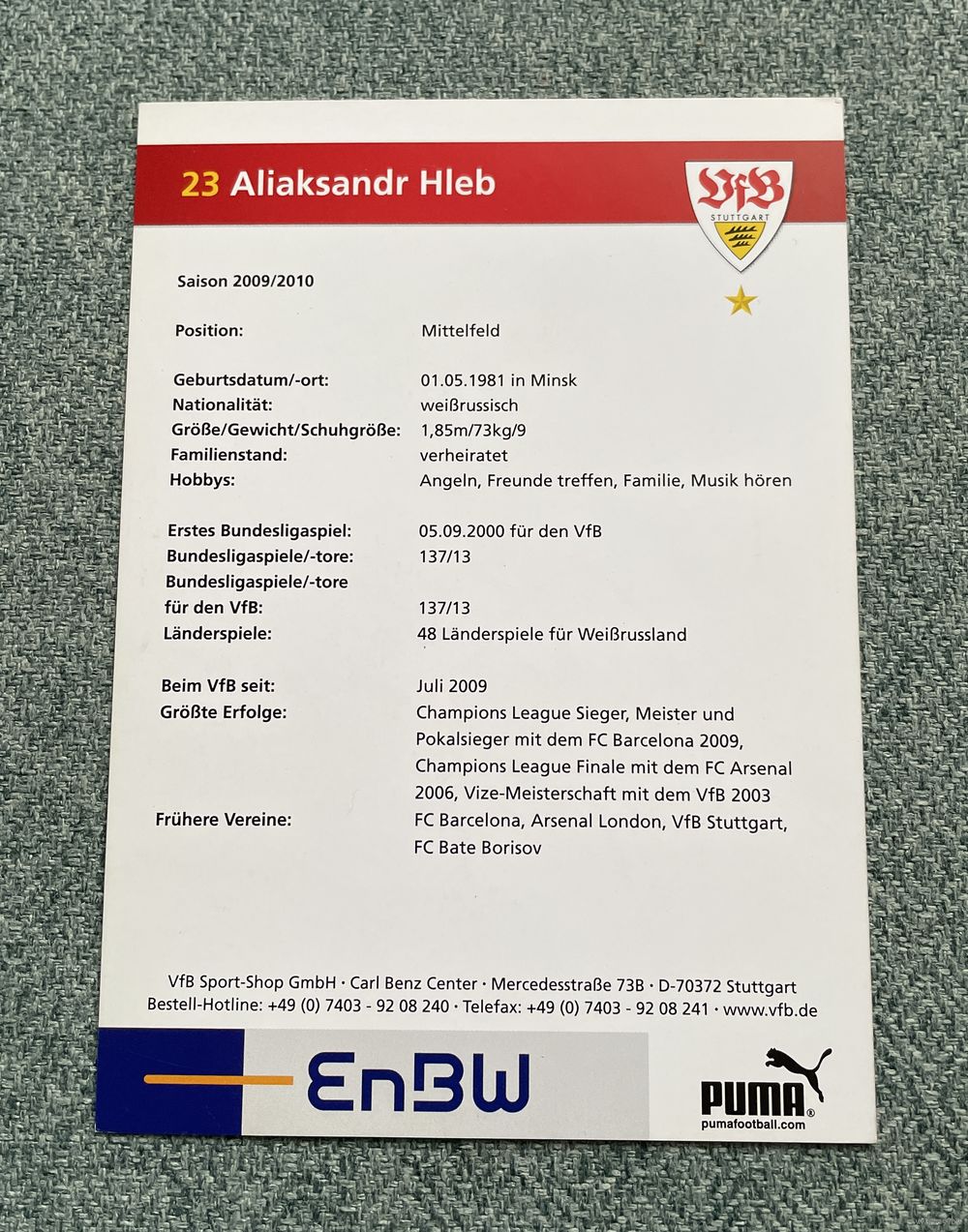 Коллекционная карточка футболист Александр Глеб в форме немецкого клуба Stuttgart 2009-2010 / АВТОГРАФ / с 1 РУБЛЯ
