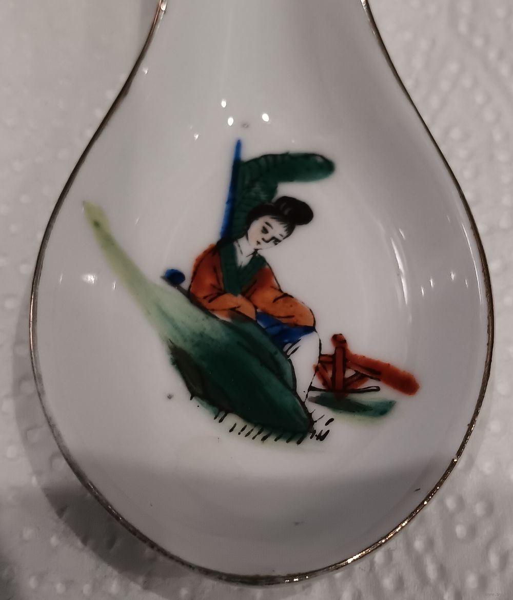 | Длина 14 см, ширина - 4,8 см. Ложка имеет, так называемые, ножки для устойчивого положения на столе. Есть потёртости позолоты. Других дефектов нет. | |