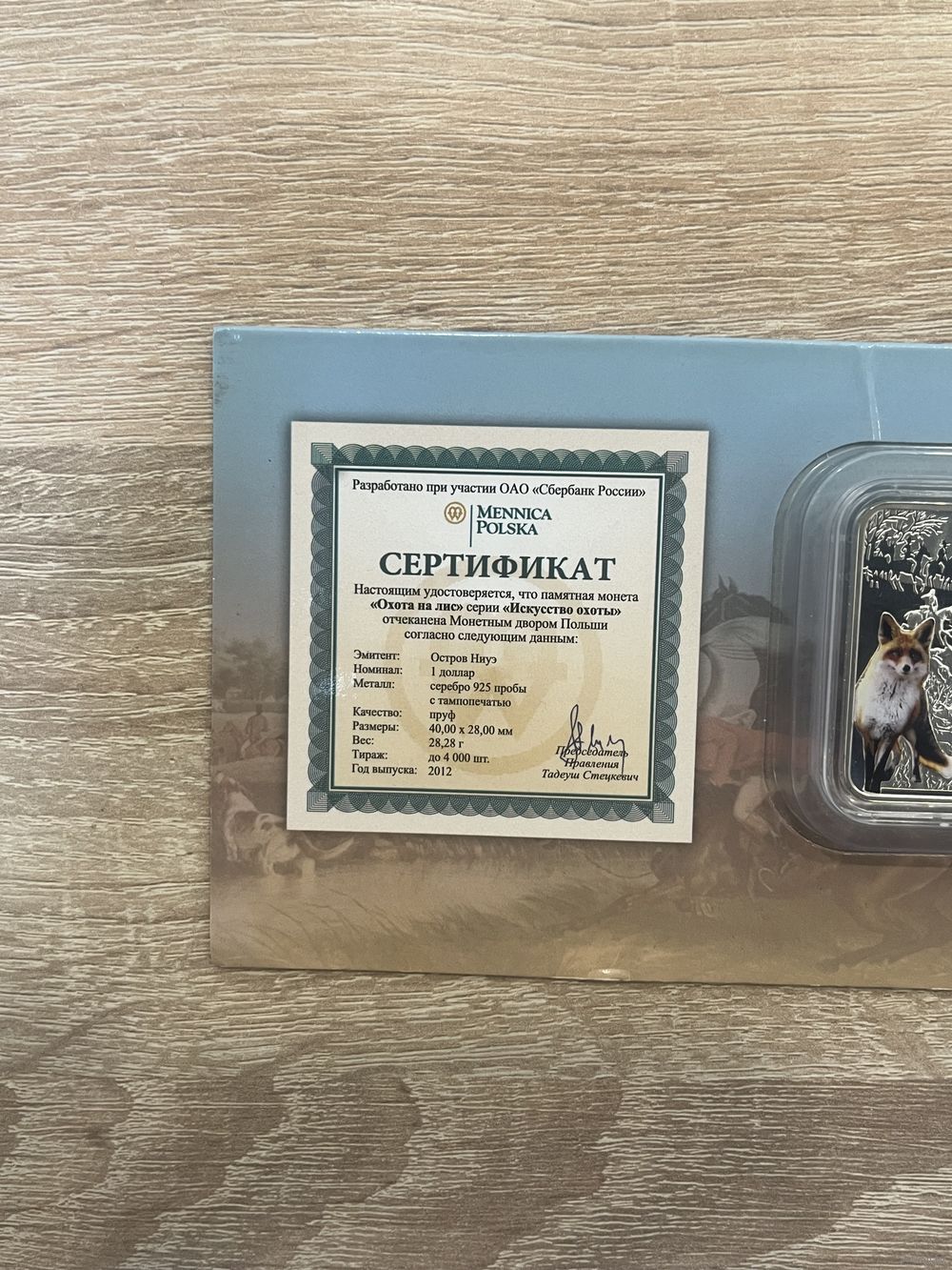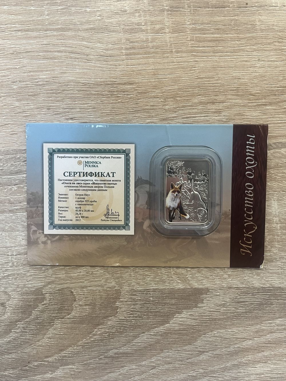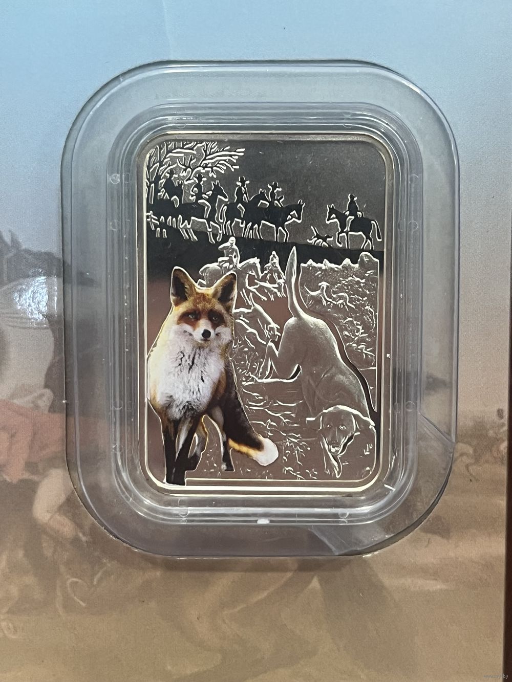 коллекционная серебряная монета Ниуэ номиналом 1 доллар 2012 года выпуска, посвященная теме Охота на лис