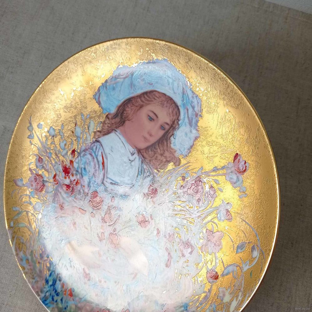 На тарелке изображена молодая девушка в пастельных тонах в окружении красных цветов на богатом золотом фоне.