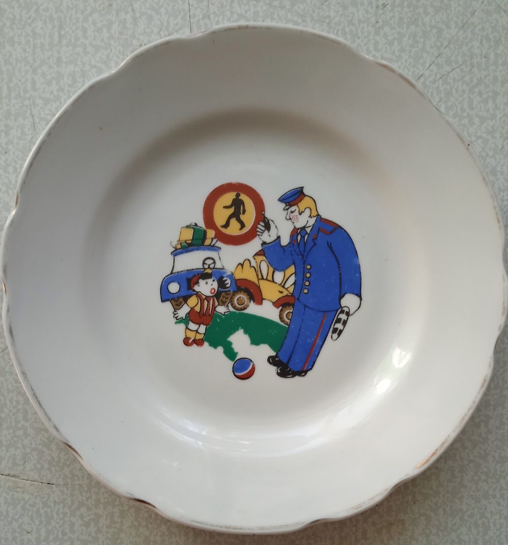 Сюжет: Инспектор ГАИ объясняет правила ребенку на фоне дорожно-транспортного происшествия (столкновение двух легковых автомобилей). В центре композиции — запрещающий знак «Проход запрещен». Редкий сюжет с аварией, представляющий исторический и коллекционный интерес. Отличное дополнение коллекции советского тематического фарфора.