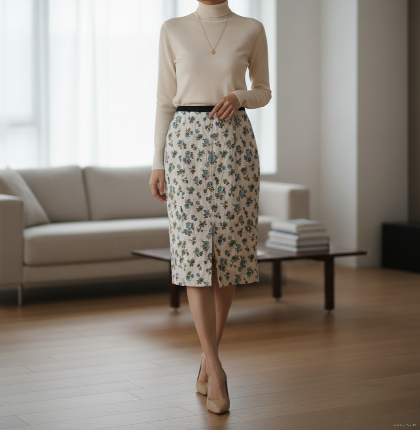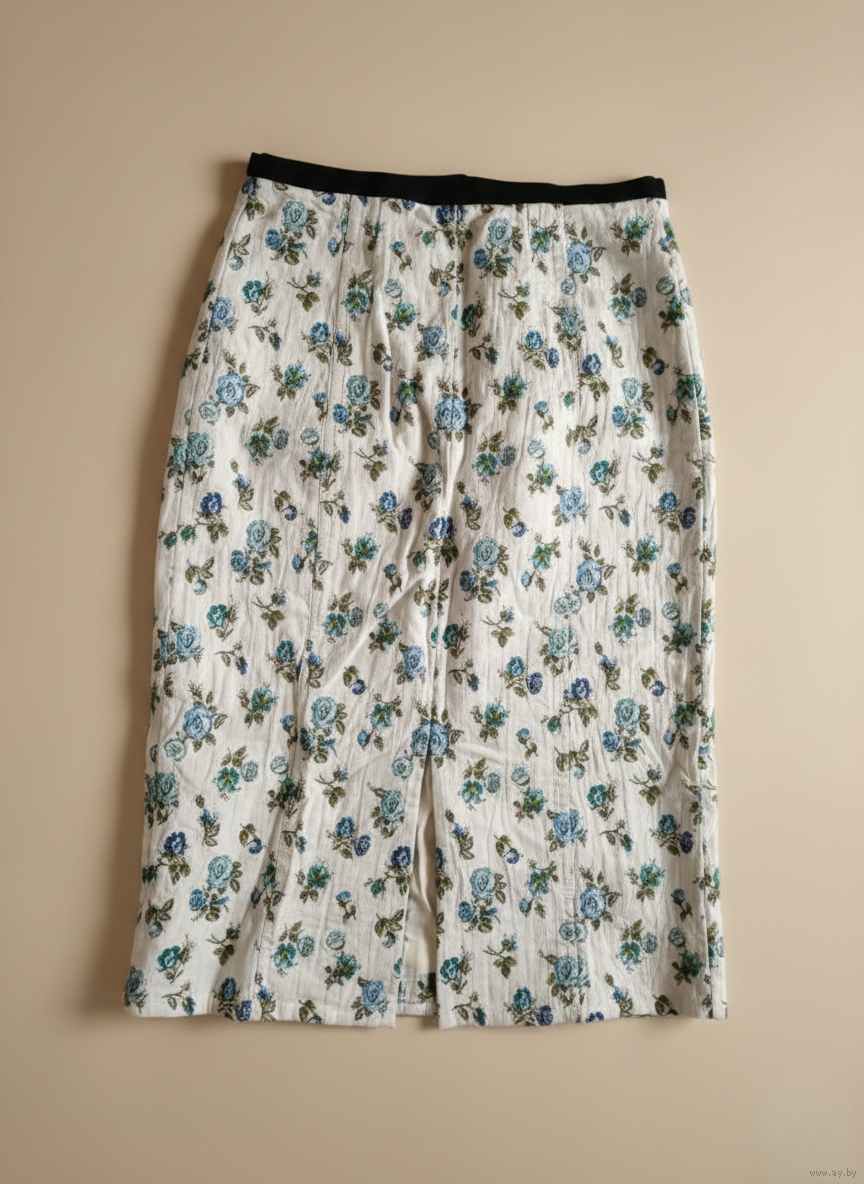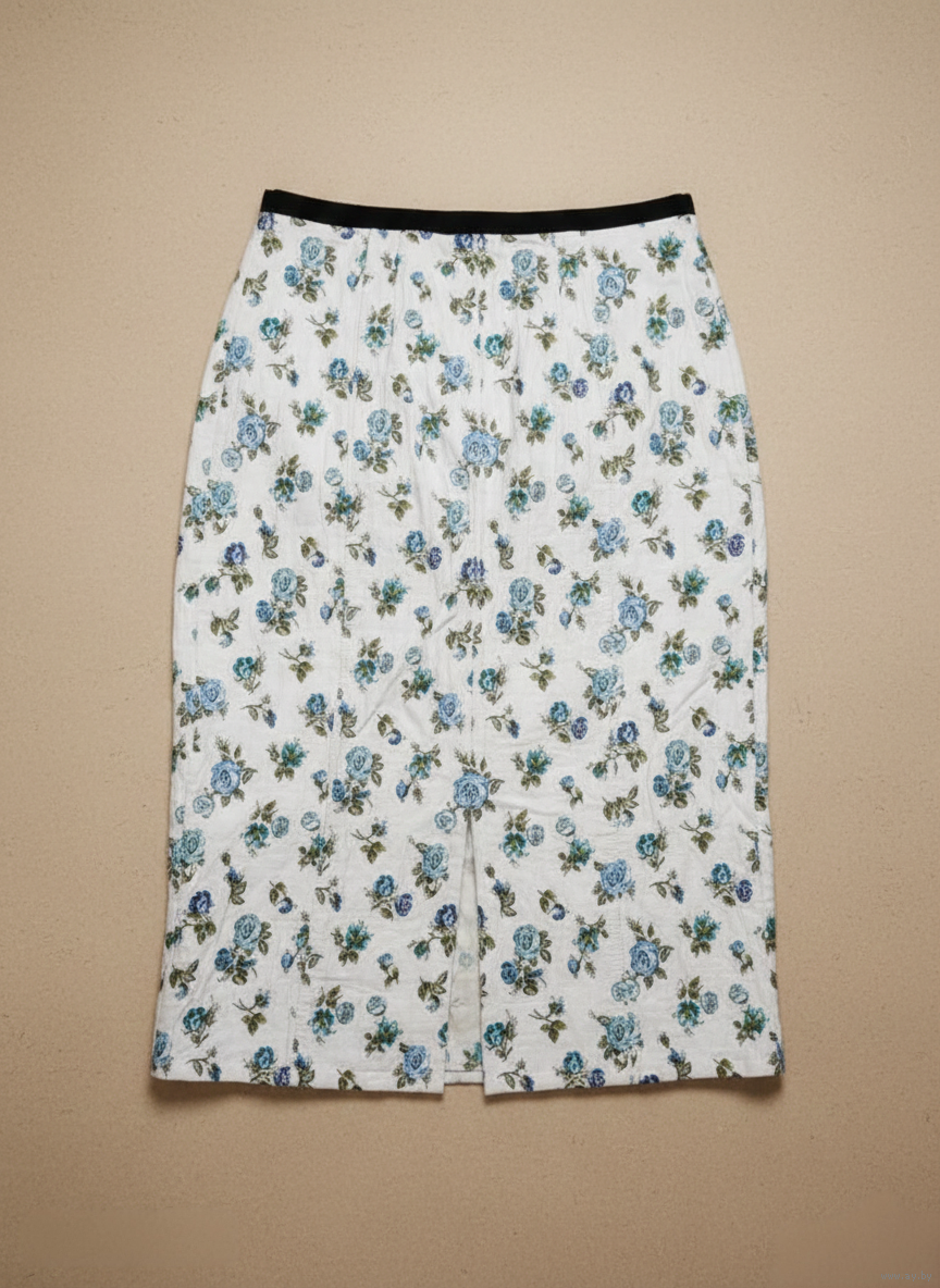 Оригинальная юбка Erdem выполнена из плотного жаккарда с изысканным цветочным узором в оттенках василькового, шалфея и лаванды. Акцентный черный пояс создает графичный контраст, подчеркивая безупречный крой. Идеальный выбор для тех, кто ценит эстетику «Quiet Luxury» и коллекционирует архивные дизайнерские вещи.