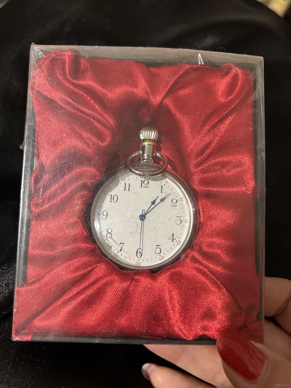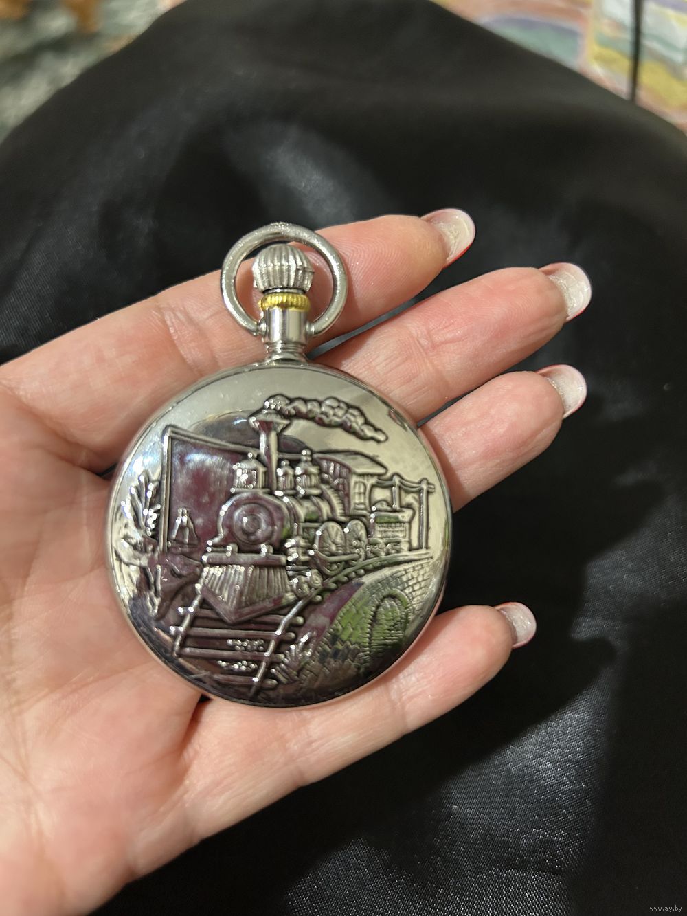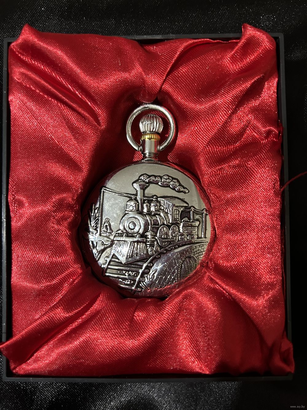 Красивые коллекционные карманные часы с выгравированным изображением паровоза на крышке.