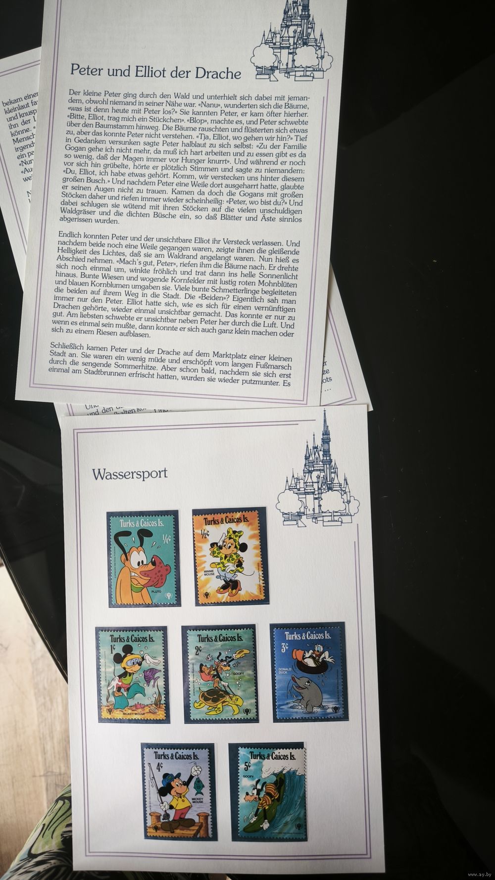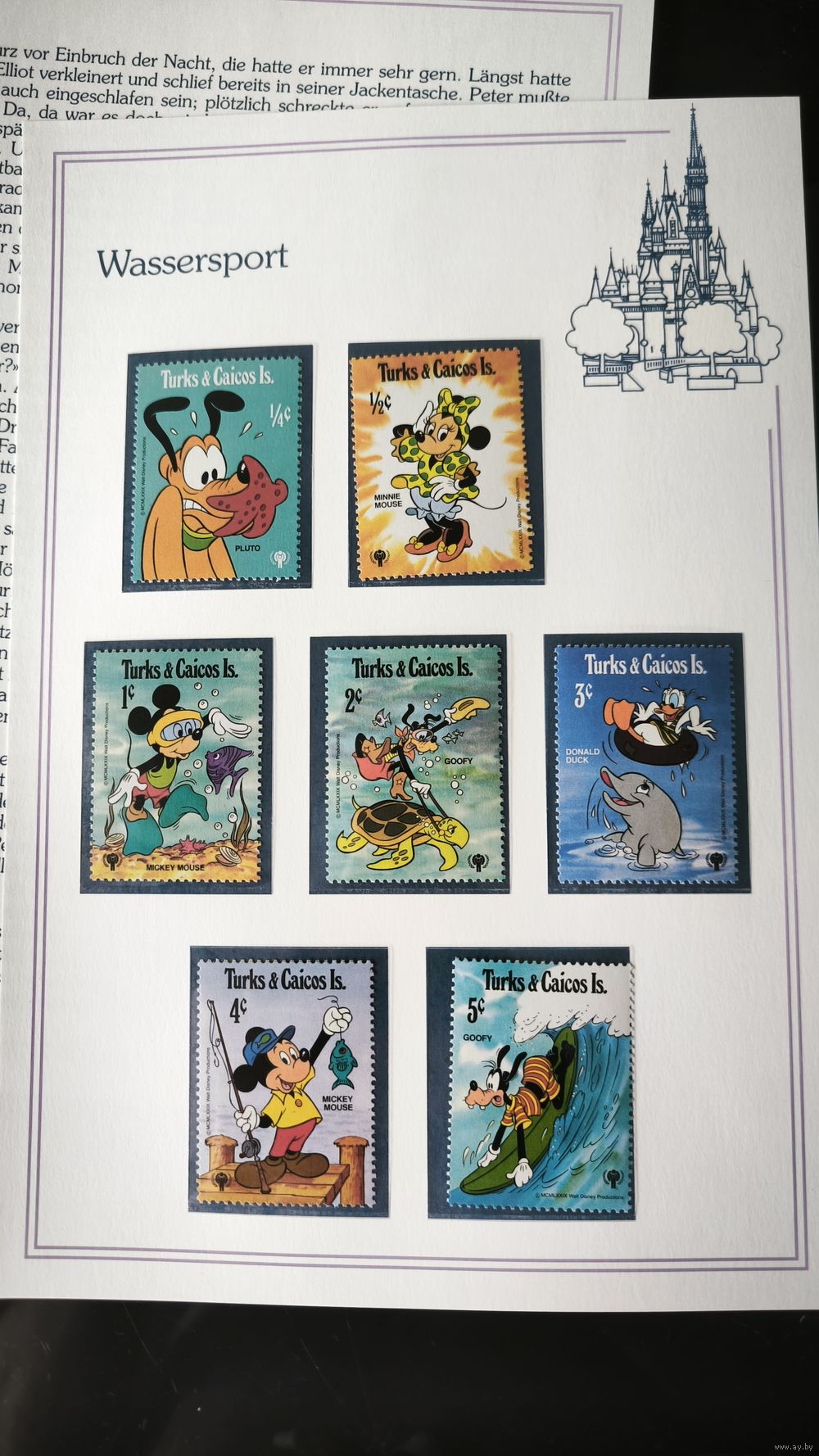 Редкий и очаровательный филателистический набор, выпущенный в середине 80-х годов. На марках изображены легендарные персонажи Уолта Диснея, осваивающие различные виды водного спорта на фоне тропических пейзажей.