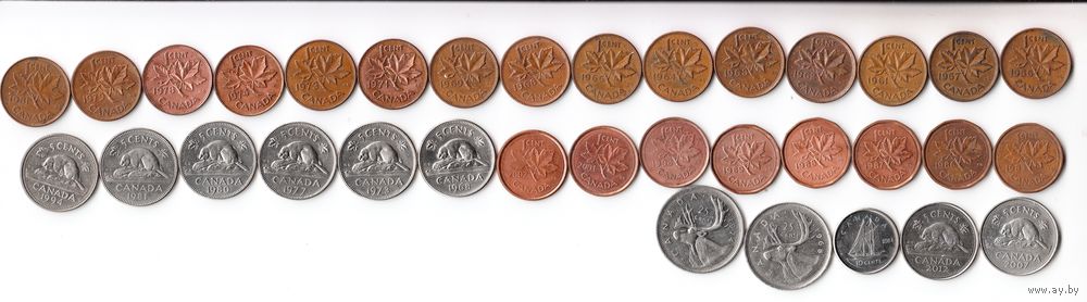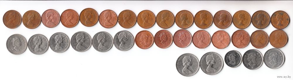 1 цент 1956, 1957(3шт.), 1961, 1962(4шт.), 1963, 1964(7шт.), 1966(3шт.), 1968(4шт.), 1969(2шт.), 1971, 1973, 1974(2шт.), 1978, 1979, 1981, 1983(2шт.), 1986(2шт.), 1987, 1988, 1989, 1998, 2001, 2007;