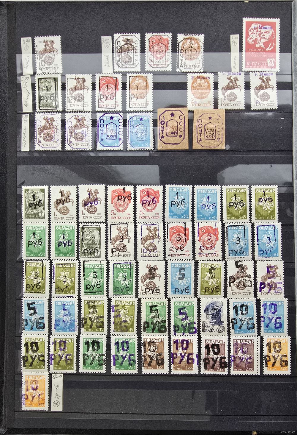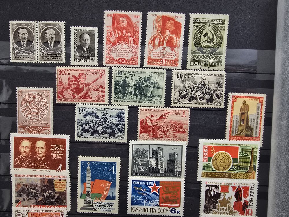 Коллекция в основном в квартблоках, кое-что в листах. Продается одним лотом, не разбивается. На первом фото марки-провизории городов Бобруйск, Могилев, Быхов, Кричев и др. Та же в коллекцию входит непочтовый выпуск "Европейский год охраны природы" 1995г., БНР Асобны атрад зубц. и беззубц, некоторые марки советского периода относящиеся к БССР.
