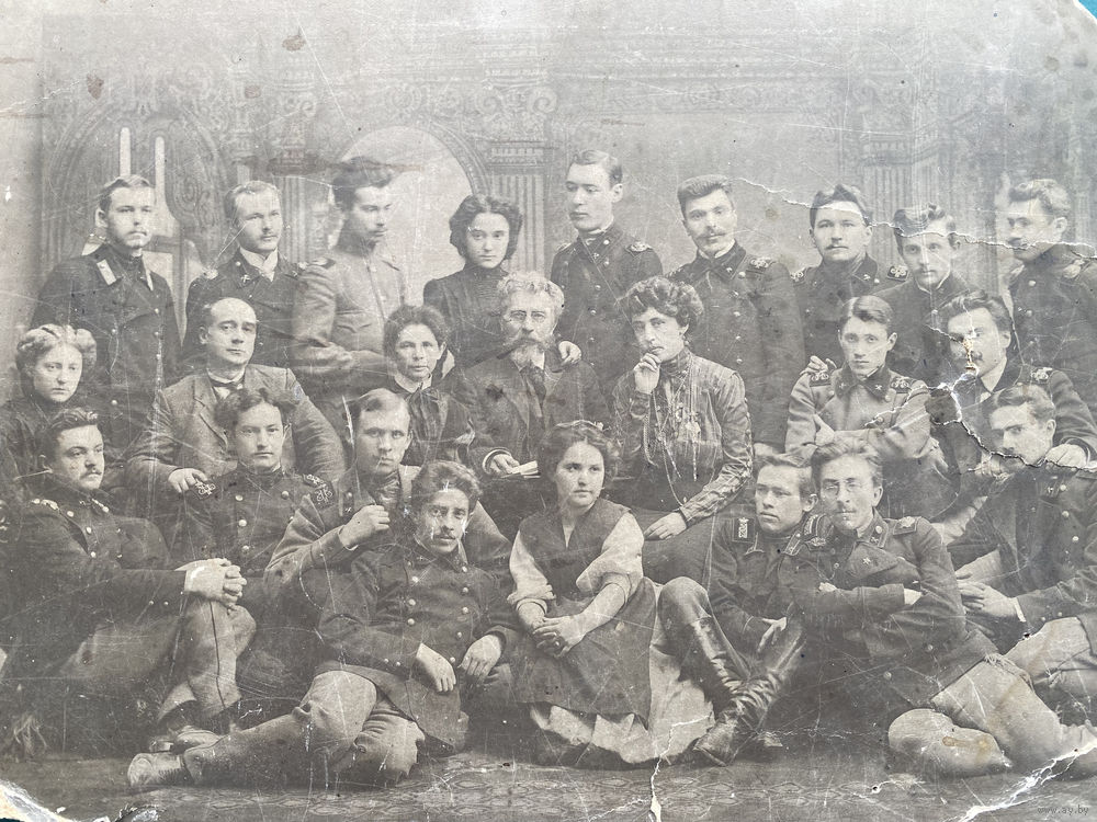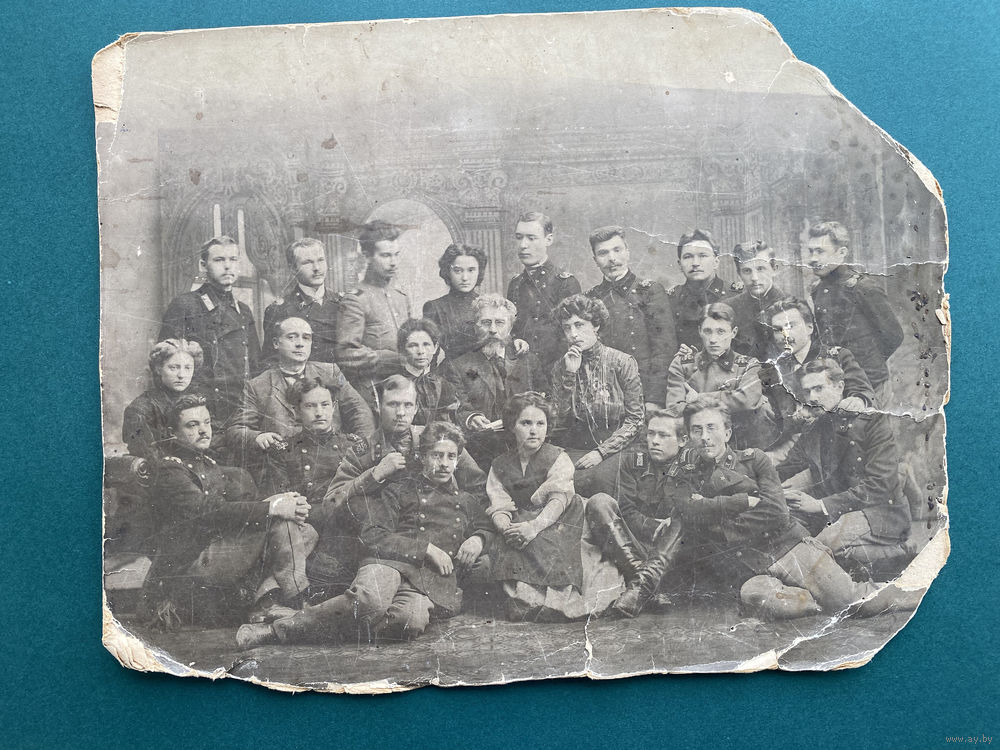 Коллективное фото студентов, инженеров, железнодорожников. Размер фото: 29х23 см. Оборваны уголки, пятна, проколы от кнопок, разрыв. Без подписи.