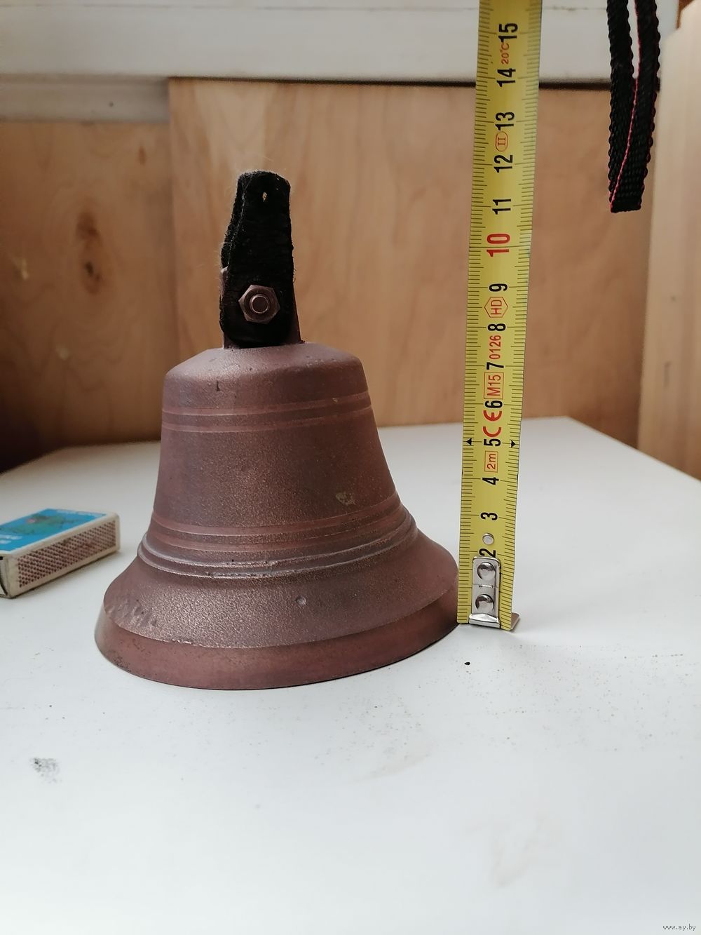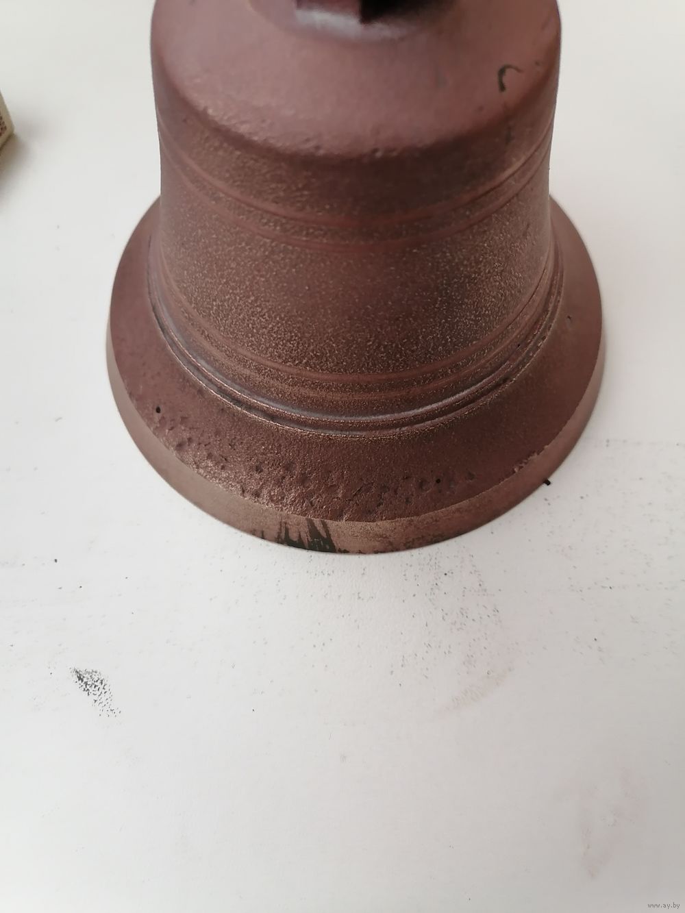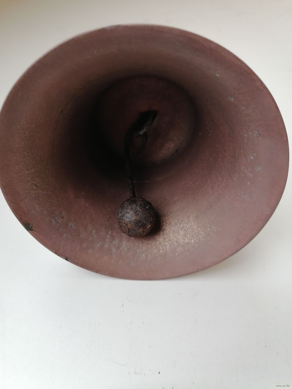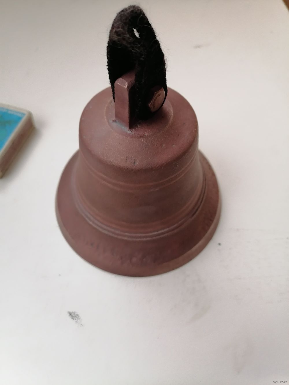 Добрый день. Колокол из меди , очистил ,но не полировал . Язычок ржавый ,но свою функцию выполняет. Звонкий . На верху присутствует цифра 12 . Привезен из Исландии.